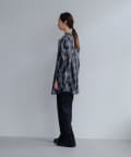 普通に着用をすると、身幅にたっぷりボリュームのあるチュニックワンピースですが、ボタンのかけ方をアレンジするとデザインを変えられる仕掛けが付いています。裏面の左脇ハギに隠しループ、表側右脇ハギに隠しボタンを付けており、カシュクールにボタンをかけかえることで、ウエストをぎゅっと縮めていただけます。カシュクールにボタンを留めると、柄の方向が不均一になり、また素敵です。