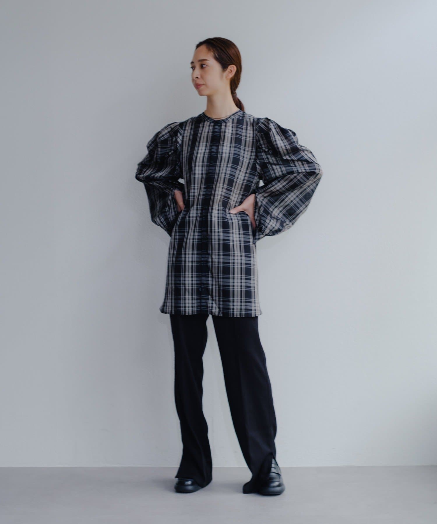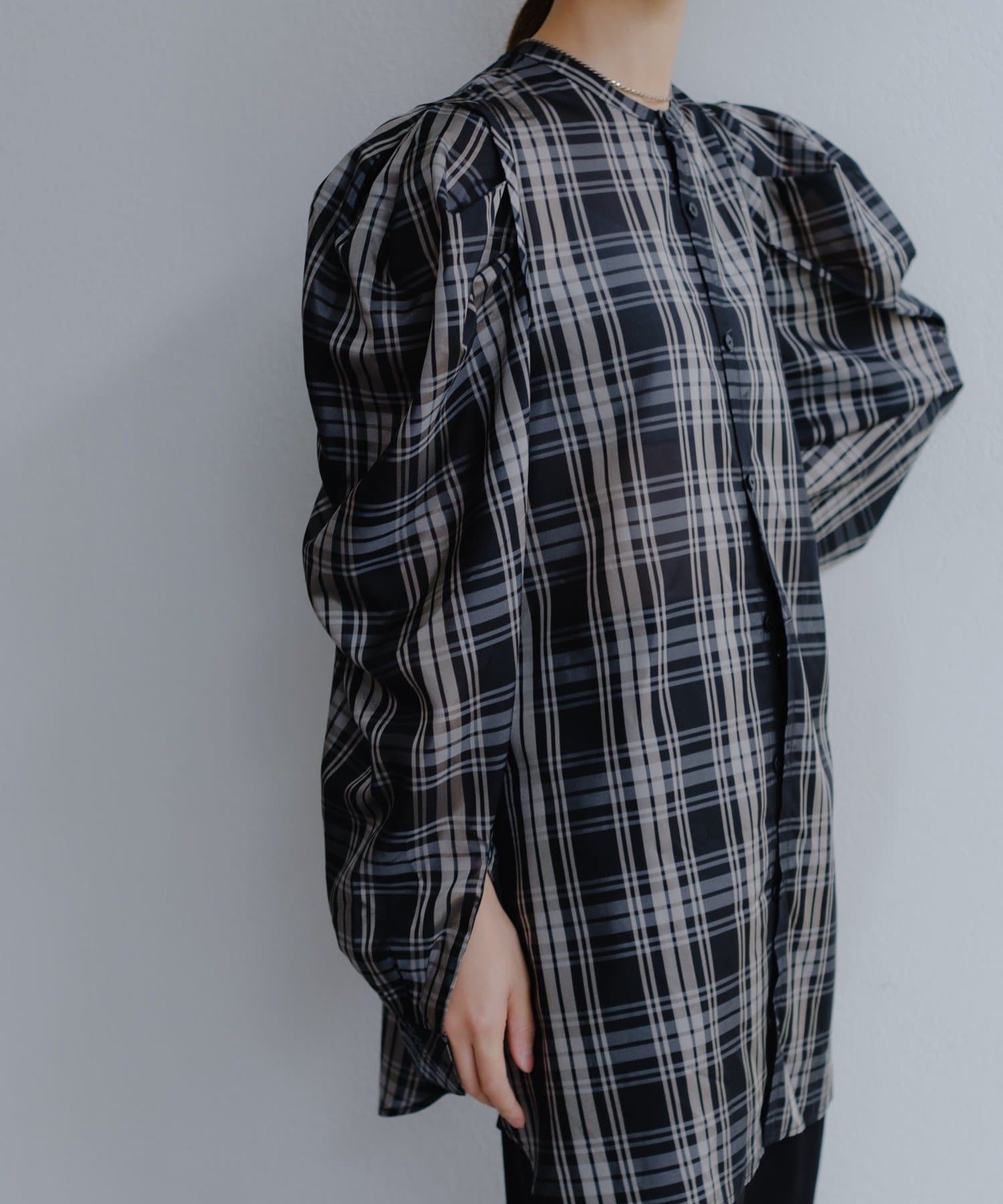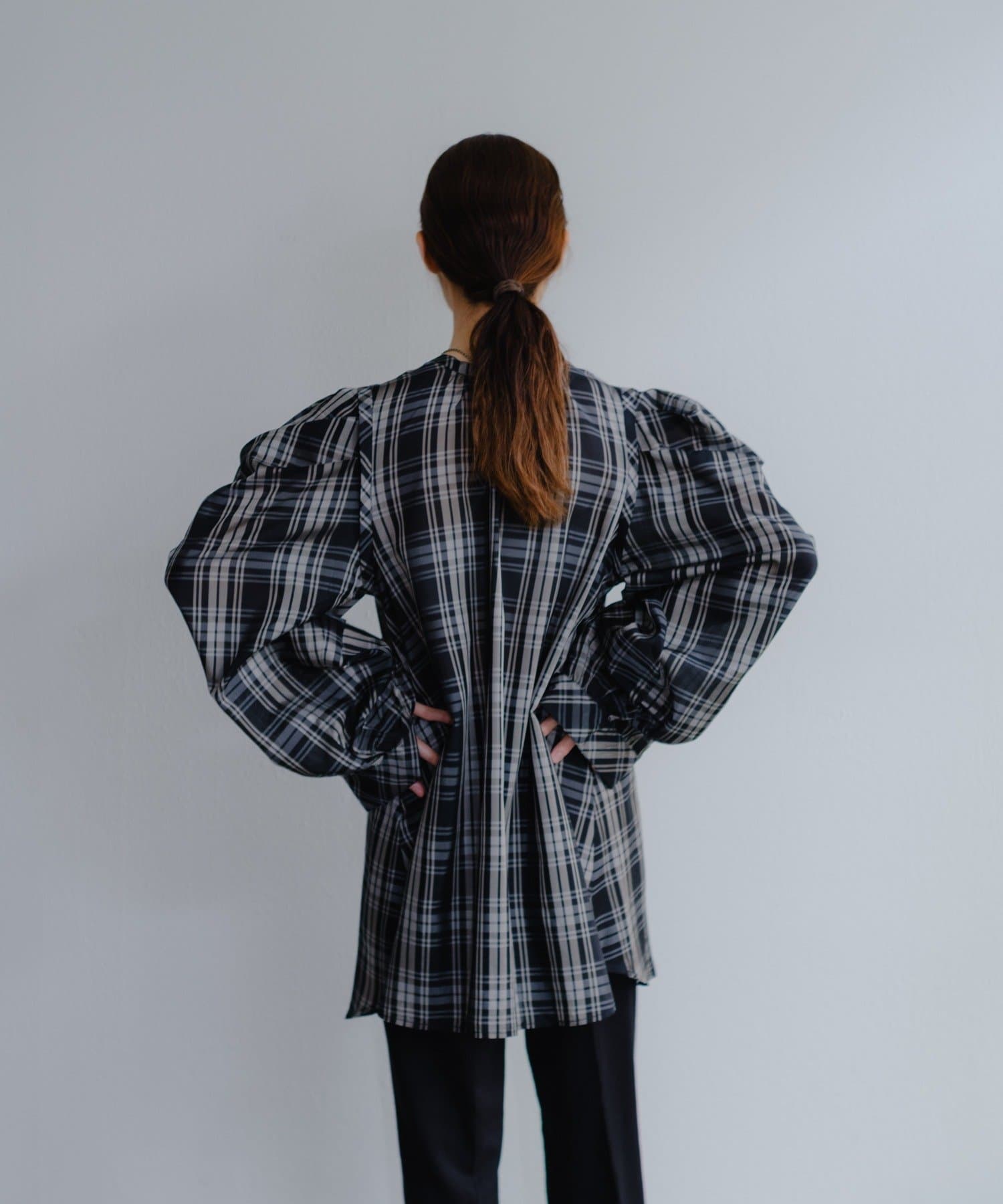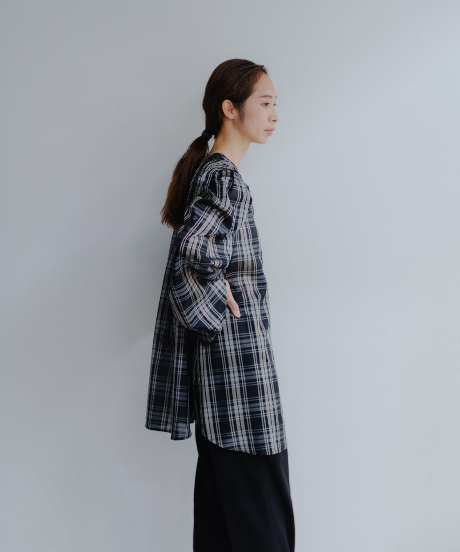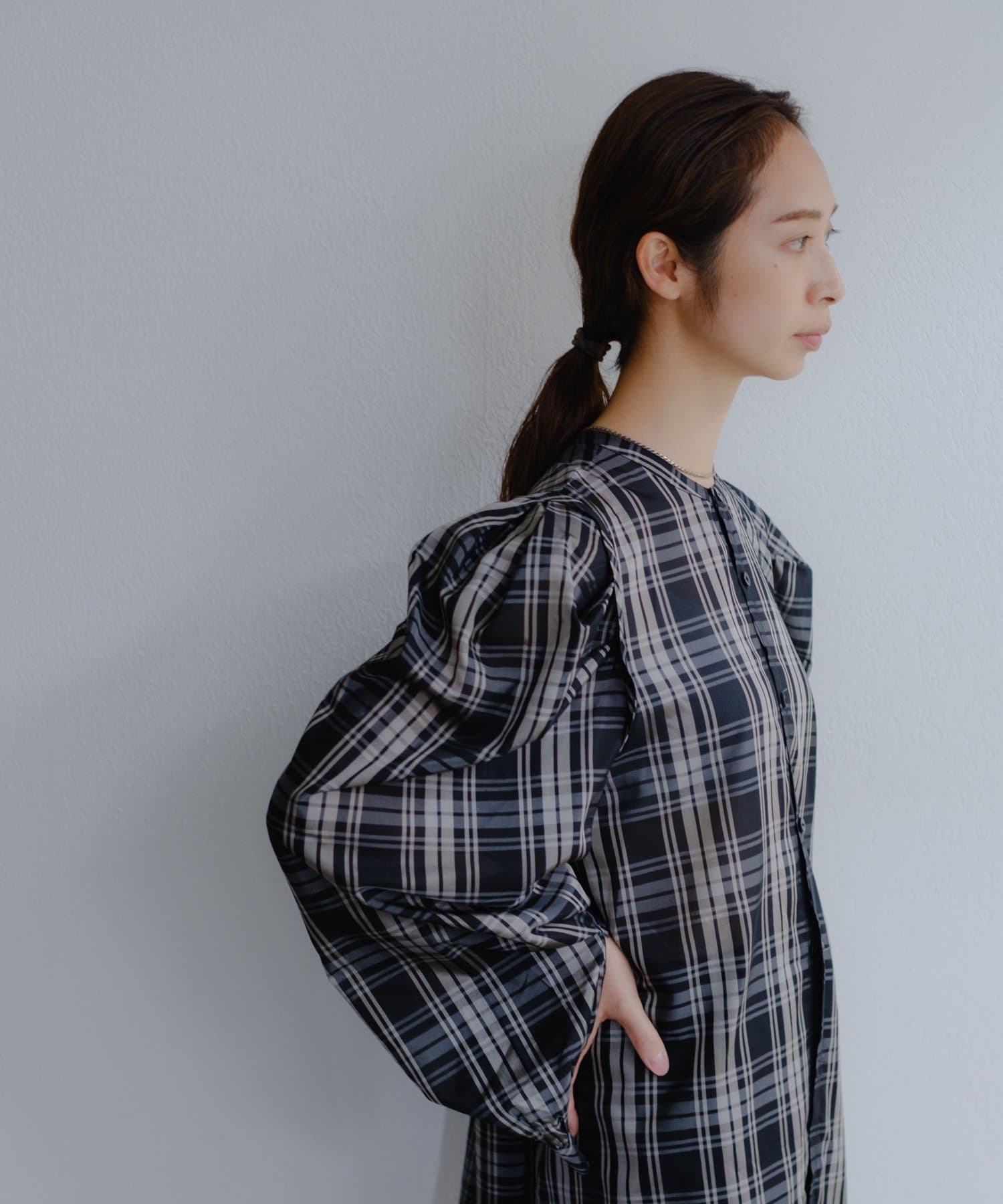 1枚でぐっと顔回りが華やかになる、ボリュームスリーブのシアーチェックブラウス。使用した生地は、程よく透け感のあるアセテート100%のモノトーンチェックのジャガード生地。落ち感もありながら程よくハリ感もあり、綺麗に袖のシルエットが形作られています。カラーリングはシックなので、奇抜になりすぎず、オケージョンシーンにもおすすめです。