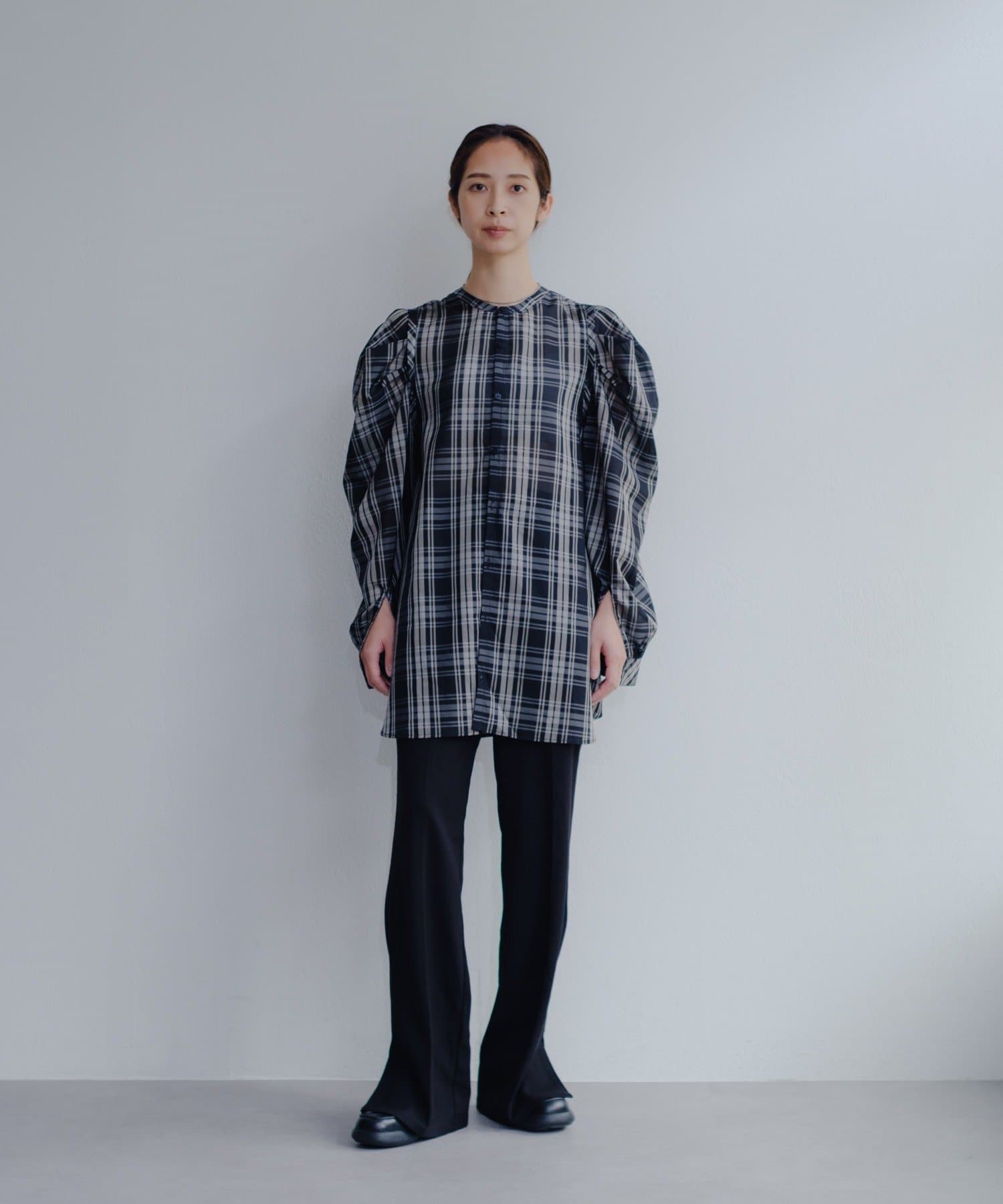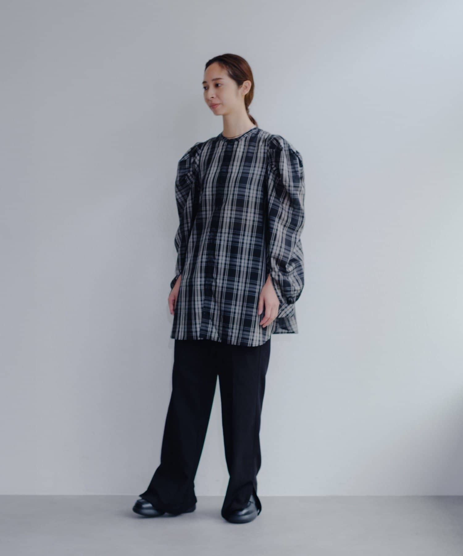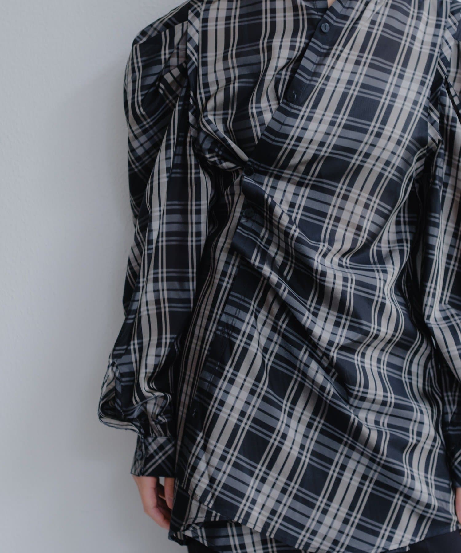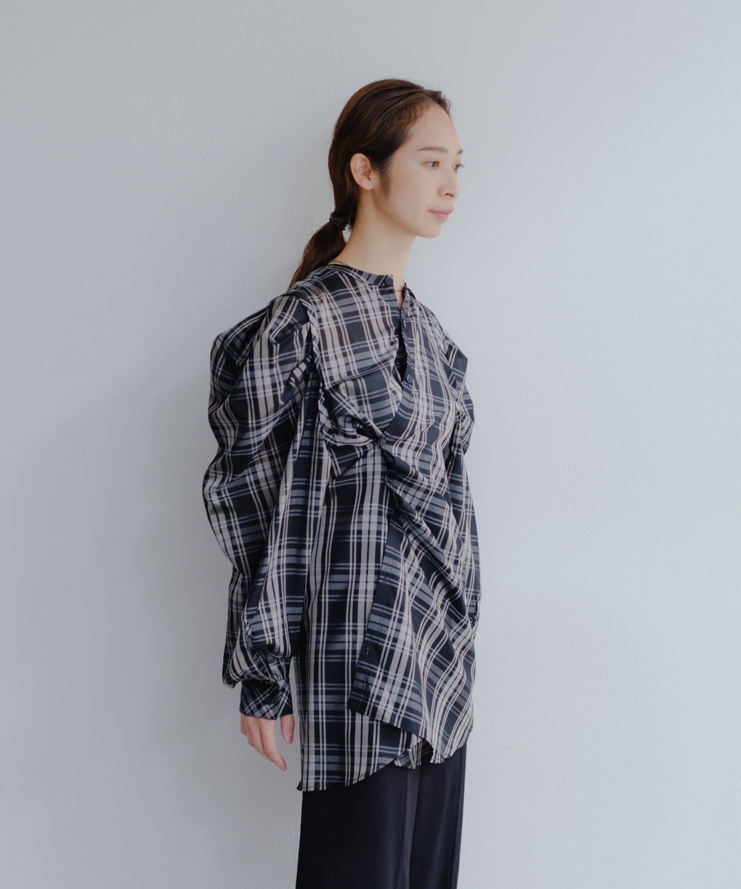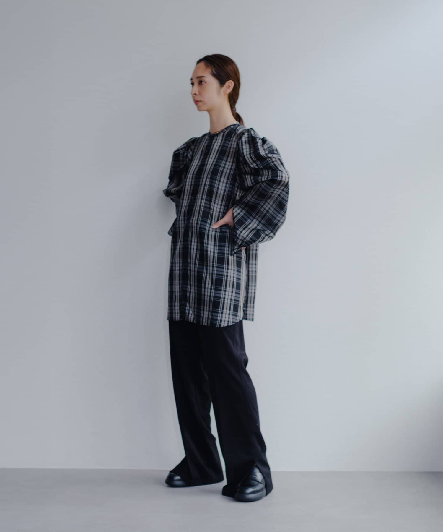 1枚でぐっと顔回りが華やかになる、ボリュームスリーブのシアーチェックブラウス。使用した生地は、程よく透け感のあるアセテート100%のモノトーンチェックのジャガード生地。落ち感もありながら程よくハリ感もあり、綺麗に袖のシルエットが形作られています。カラーリングはシックなので、奇抜になりすぎず、オケージョンシーンにもおすすめです。