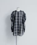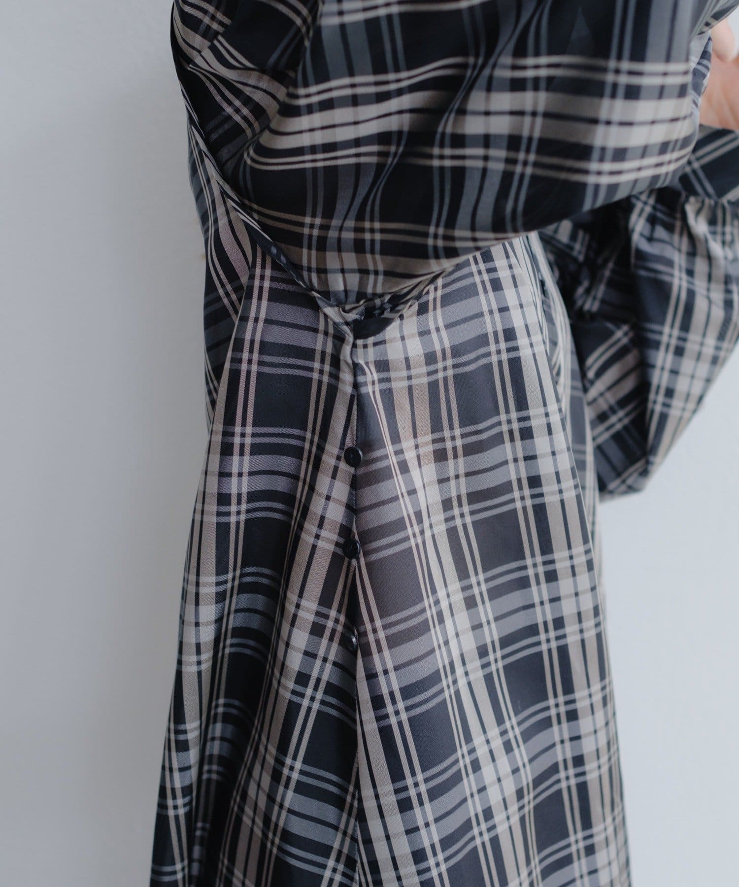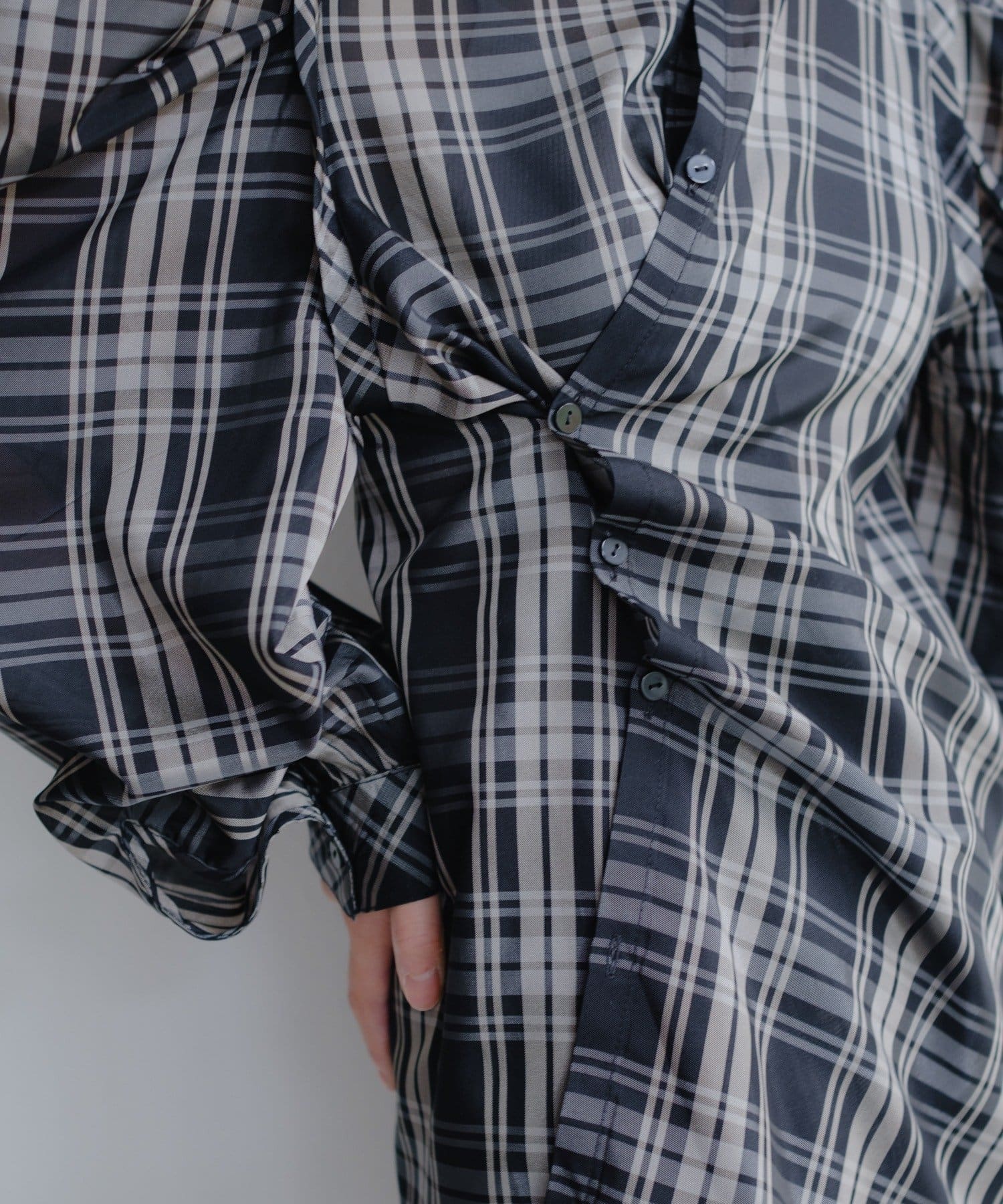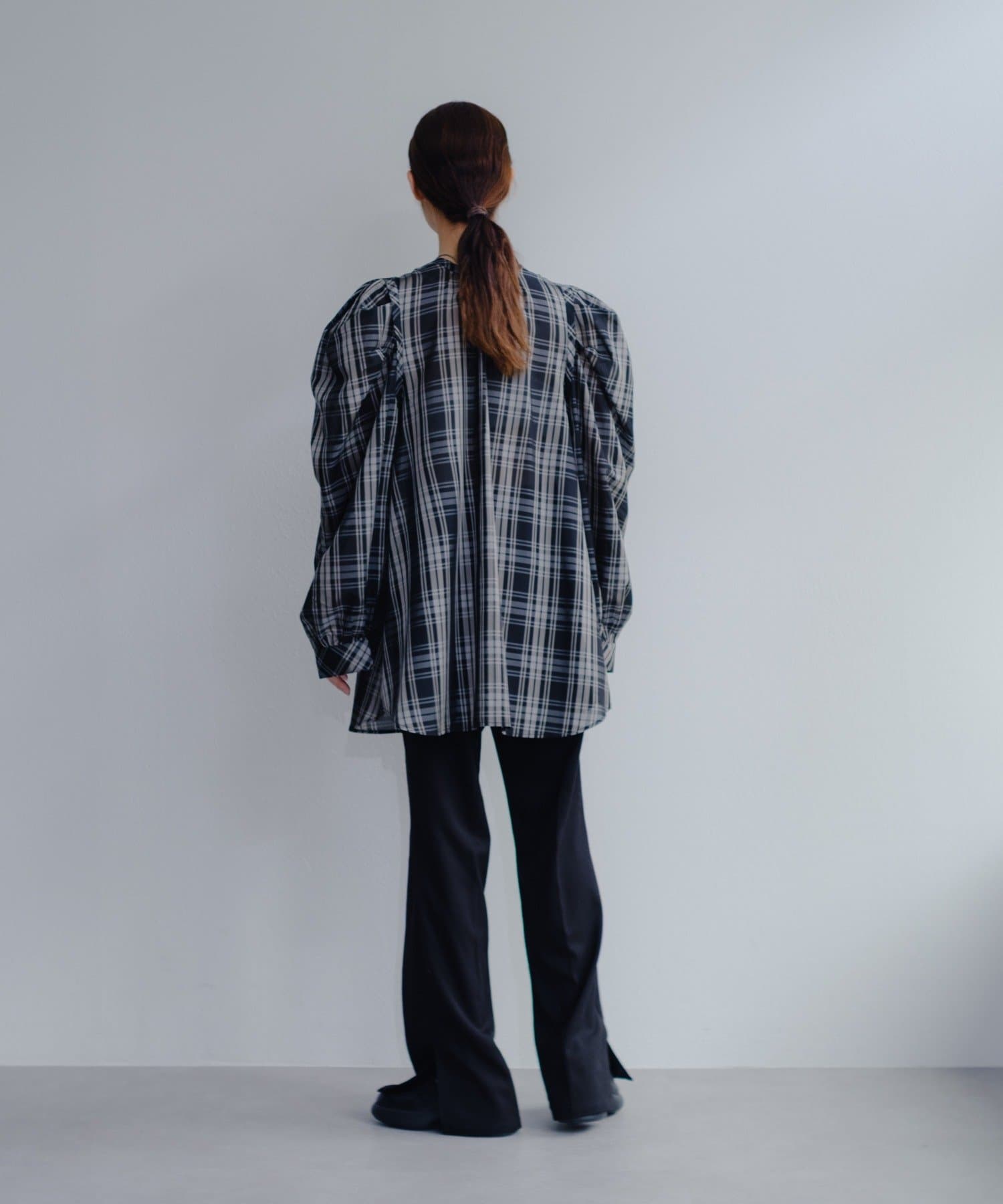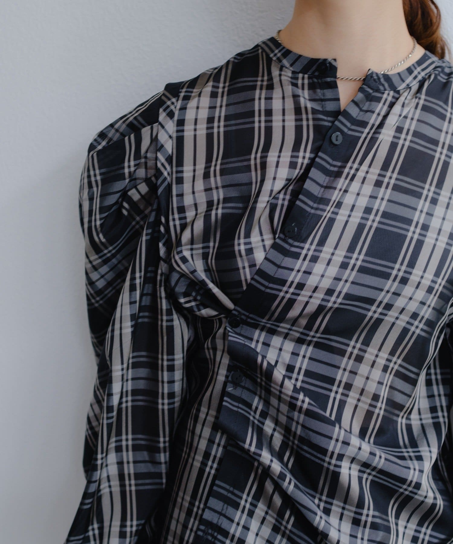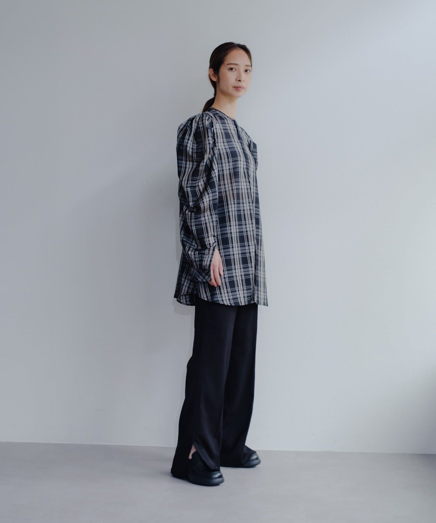 1枚でぐっと顔回りが華やかになる、ボリュームスリーブのシアーチェックブラウス。使用した生地は、程よく透け感のあるアセテート100%のモノトーンチェックのジャガード生地。落ち感もありながら程よくハリ感もあり、綺麗に袖のシルエットが形作られています。カラーリングはシックなので、奇抜になりすぎず、オケージョンシーンにもおすすめです。