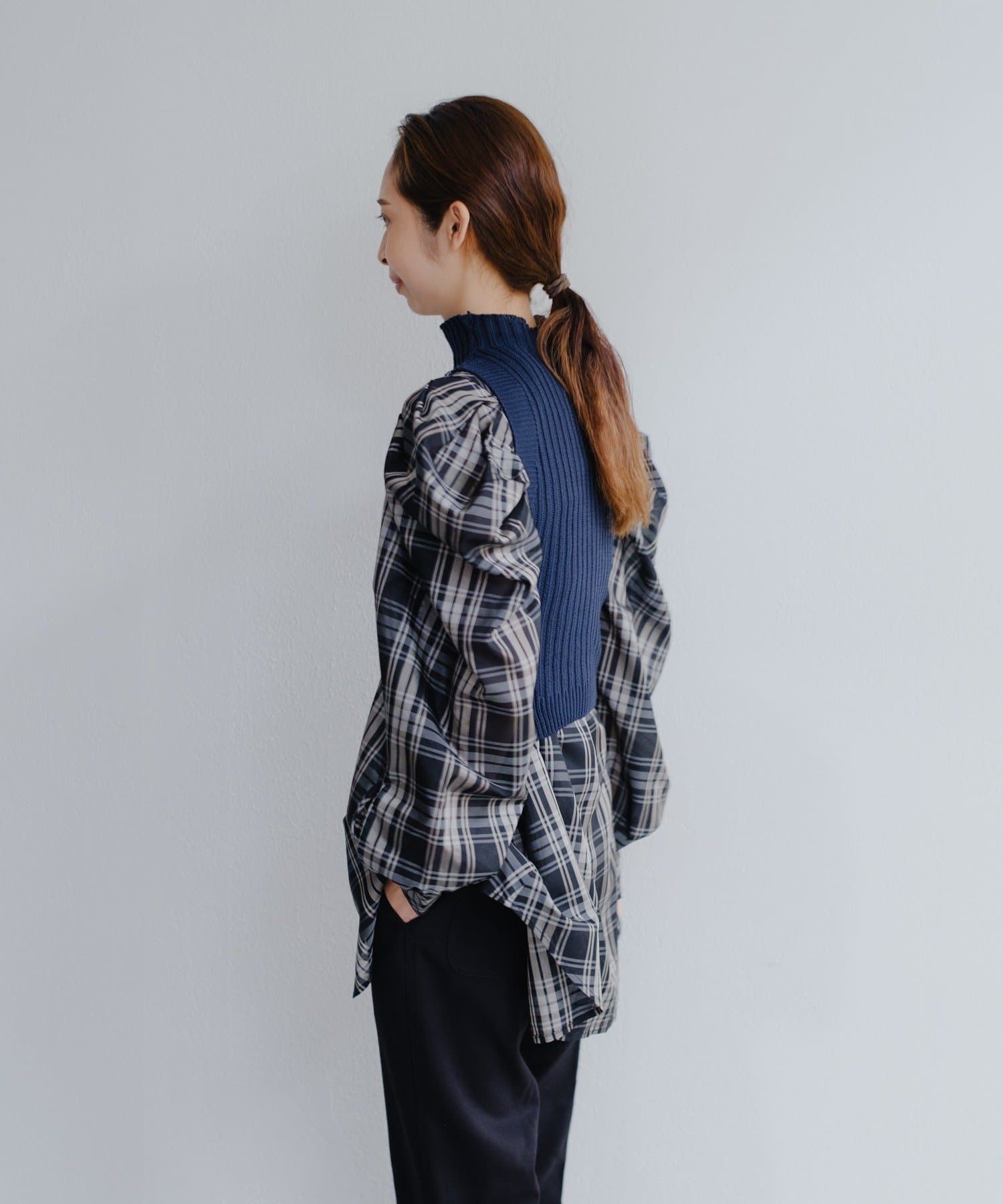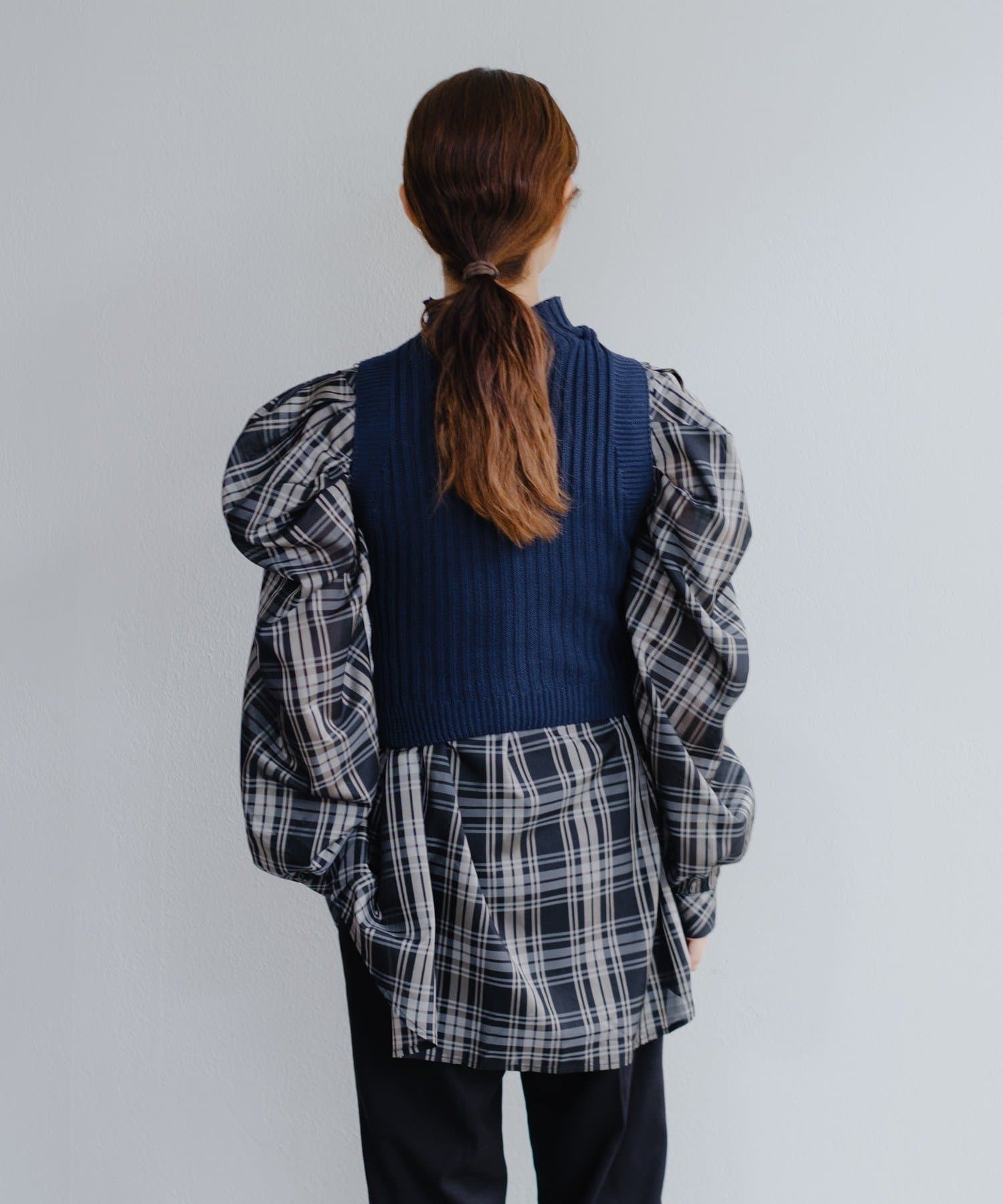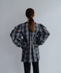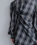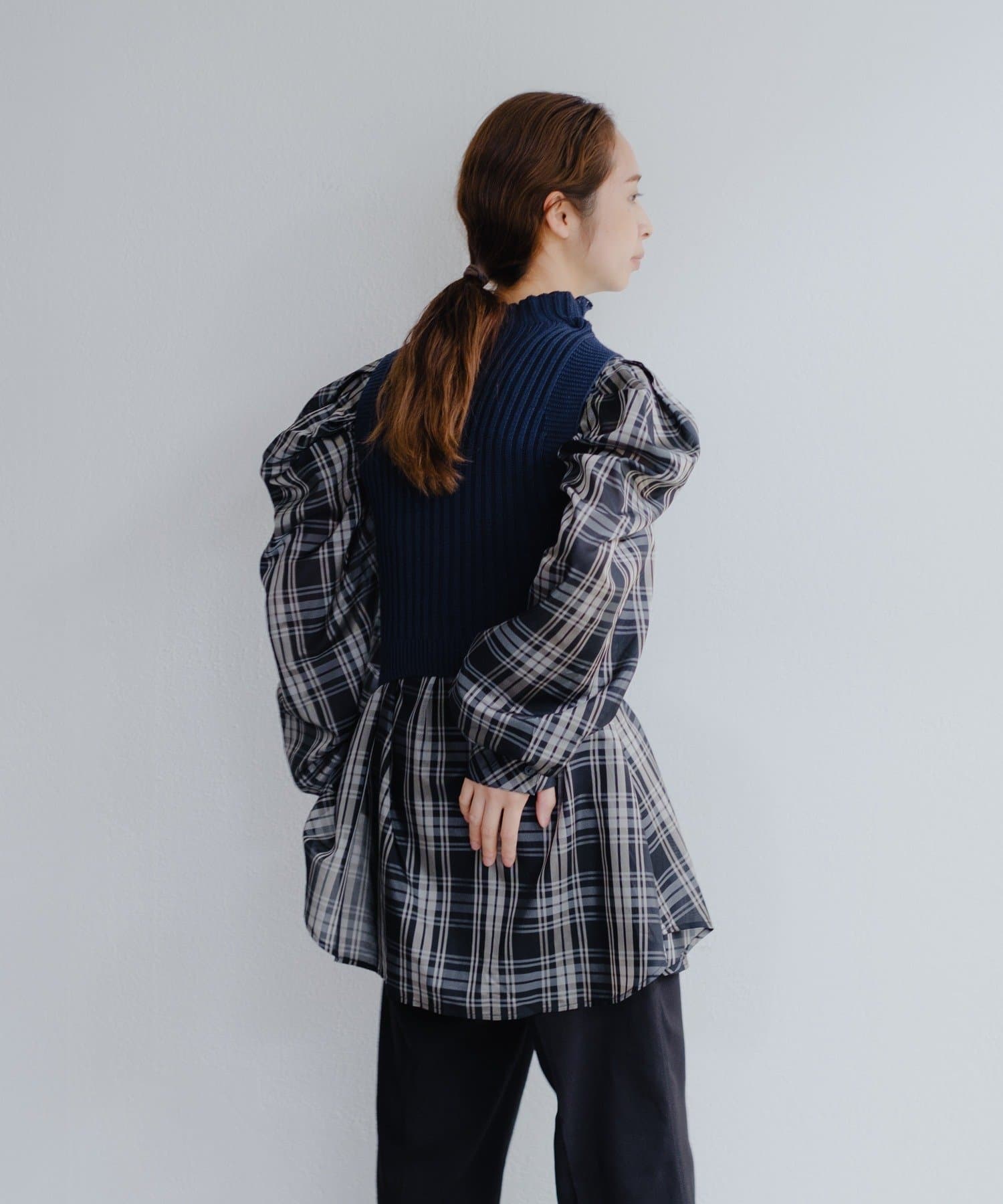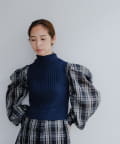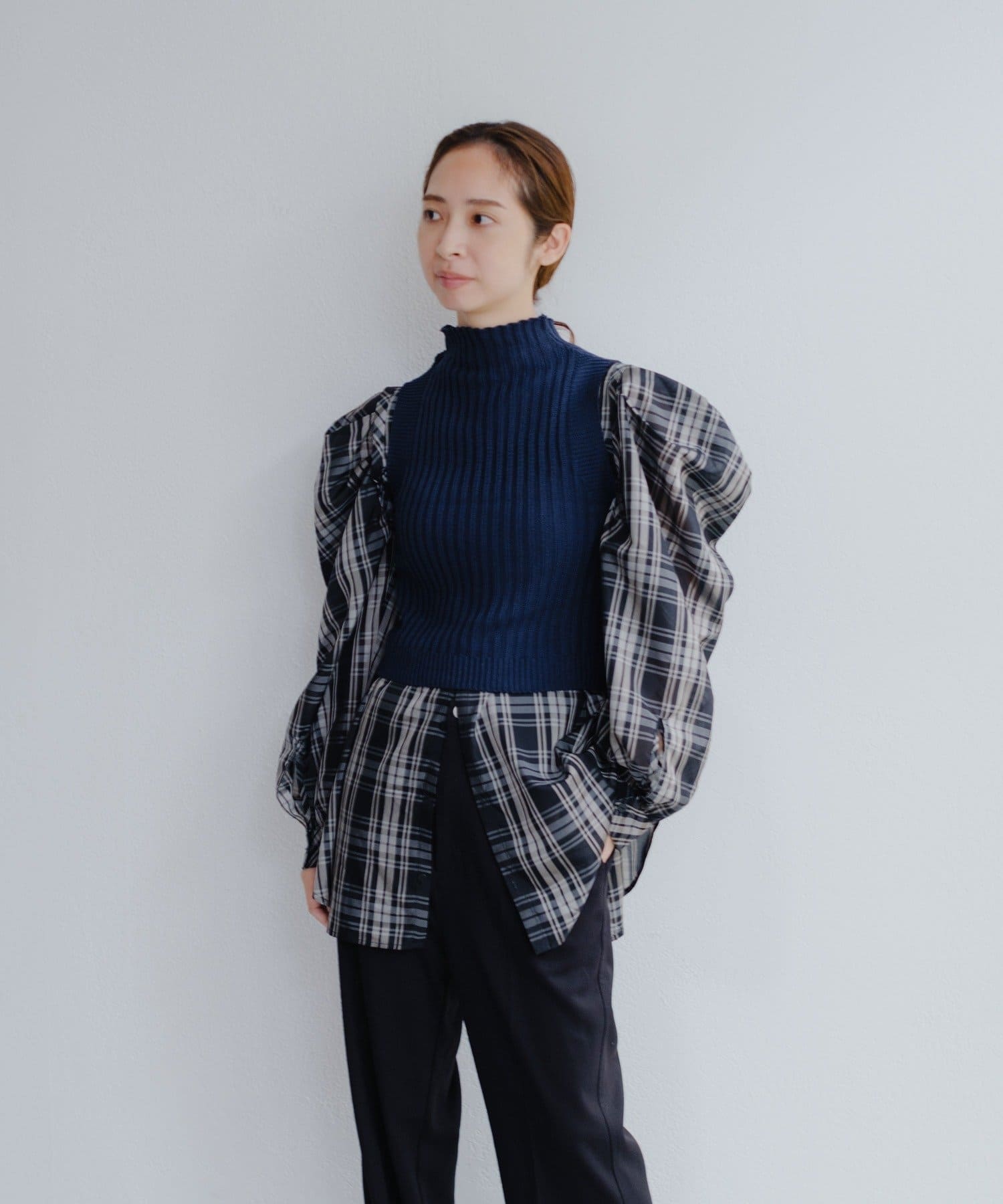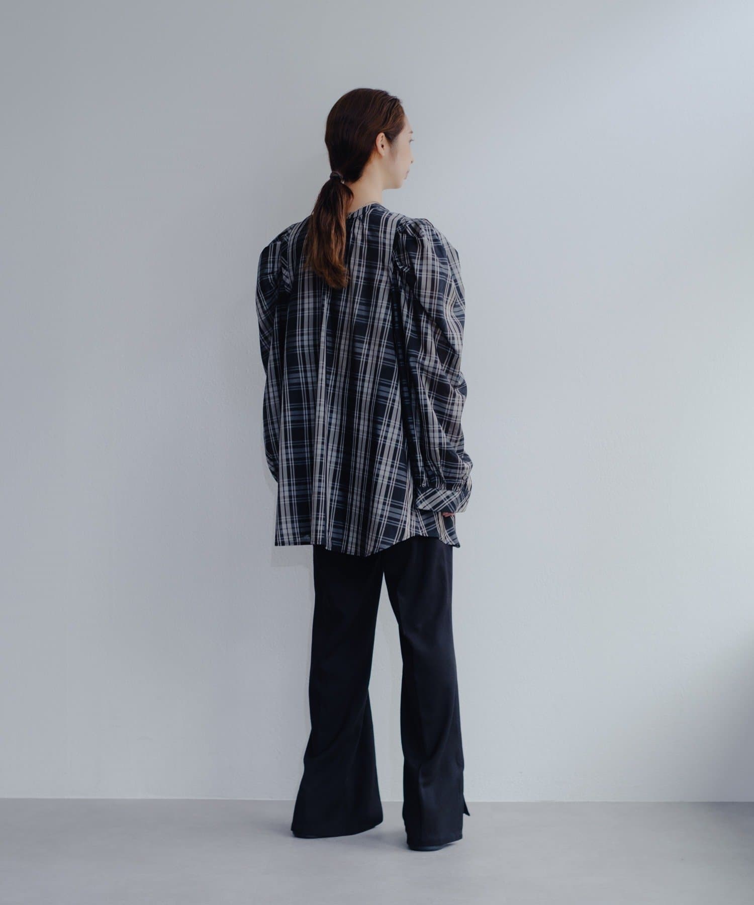1枚でぐっと顔回りが華やかになる、ボリュームスリーブのシアーチェックブラウス。使用した生地は、程よく透け感のあるアセテート100%のモノトーンチェックのジャガード生地。落ち感もありながら程よくハリ感もあり、綺麗に袖のシルエットが形作られています。カラーリングはシックなので、奇抜になりすぎず、オケージョンシーンにもおすすめです。