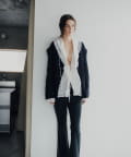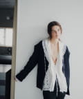 1枚着はもちろん、今シーズンはモードなブラックやネイビーのジャケットから襟を出して、シックなアイテムと組み合わせて着用するのがおすすめです。また、前後逆に着用して、背中ががっつりと開けられて着る裏ワザな着方も新鮮で今年チャレンジしてみたいスタイルです。