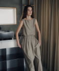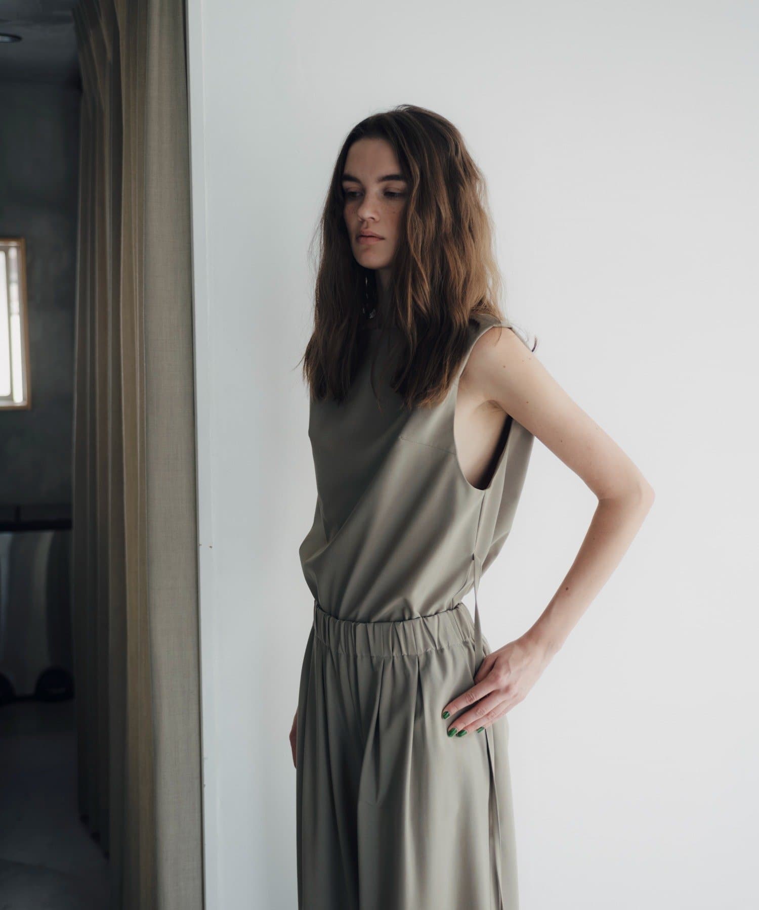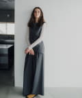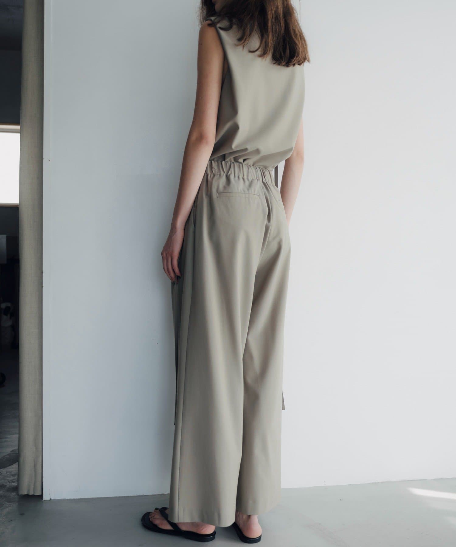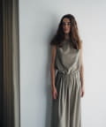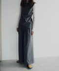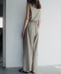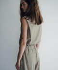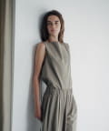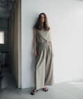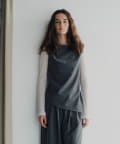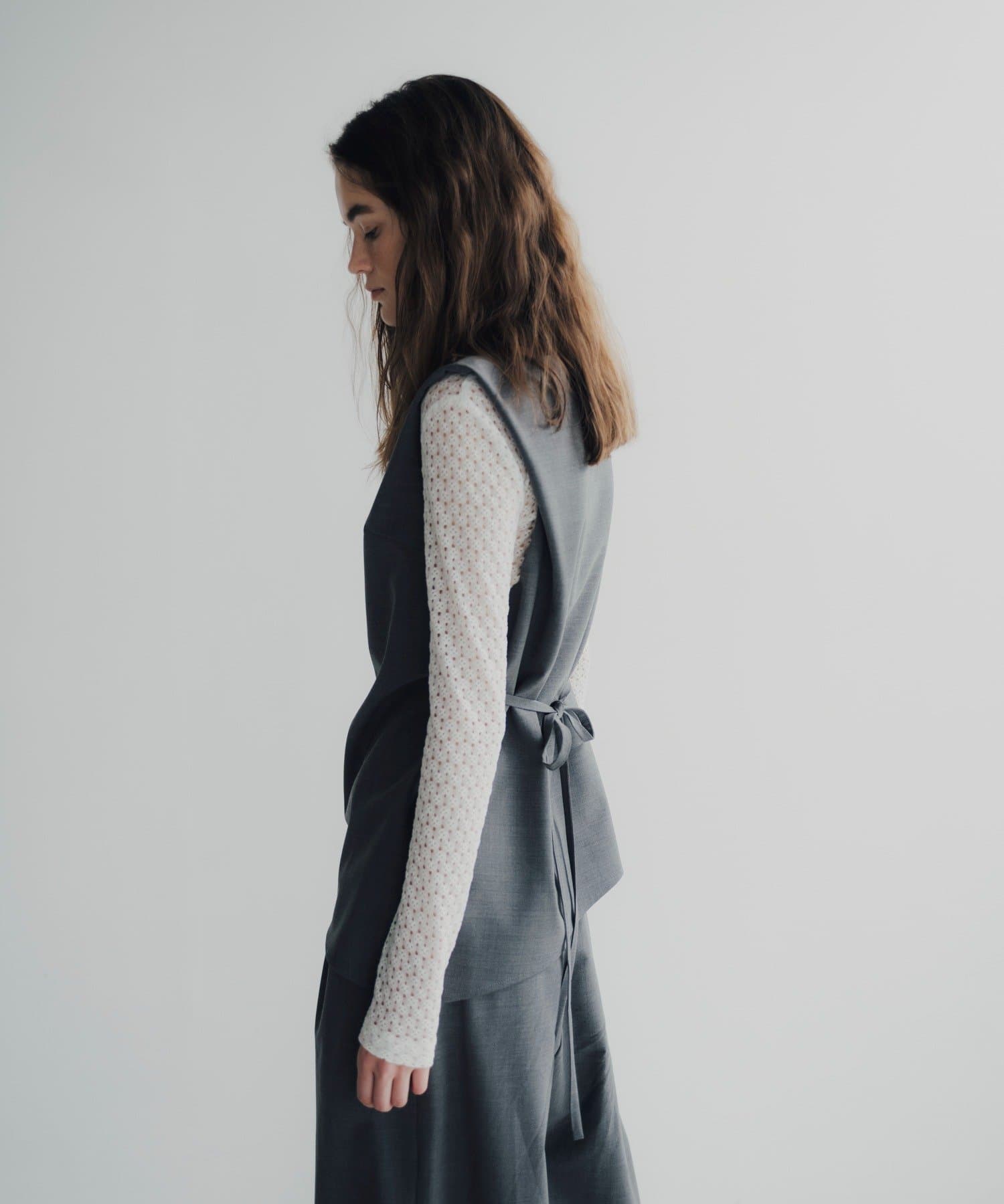 裾の長さをがアシンメトリーに設定しており、視覚効果でスタイルアップ見えが叶うのが嬉しいポイント。また、両脇の紐を背面で結ぶと、ウエストラインがすっきりとくびれて見え、着痩せ効果抜群。肩回りもタックを入れて立体感を出しているので、1枚で着ても肩回りが綺麗にすっきりと見せていただけます。
