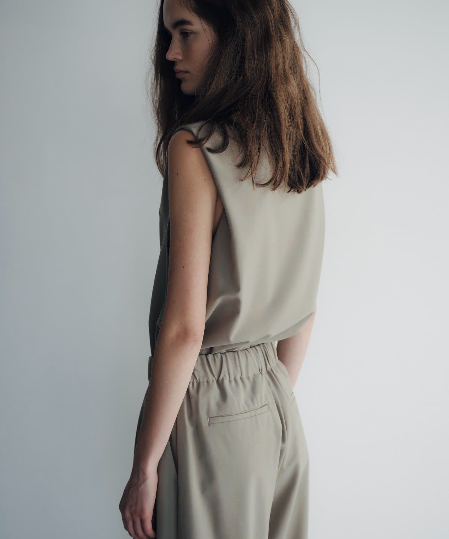 ハリ感のある高密度で上質な生地で仕立てた、着映えのするSETUPトップス。ポリエステルを含む古着や衣料品の生産時に発生する端切れなどを原料にしたリサイクルポリエステルと、ウールを混紡した特別な生地を採用しています。サマーウール独特の微光沢があるのできちんと感もあり、綺麗な印象で着用できます。また、表面には撥水加工が施されており、梅雨時期やレジャーシーンなどでも安心して着用いただけます。