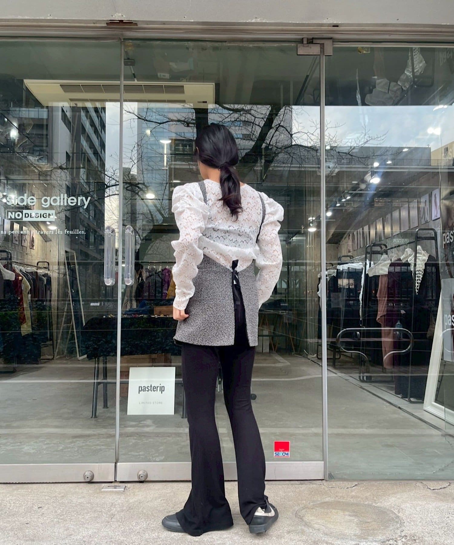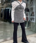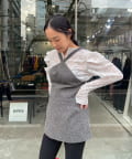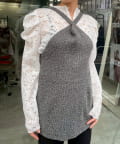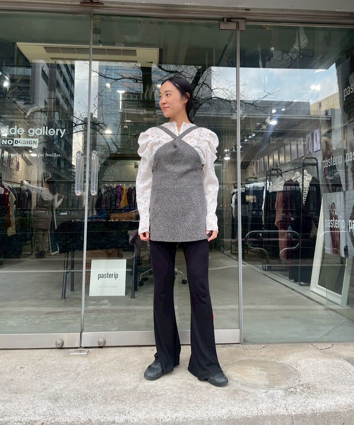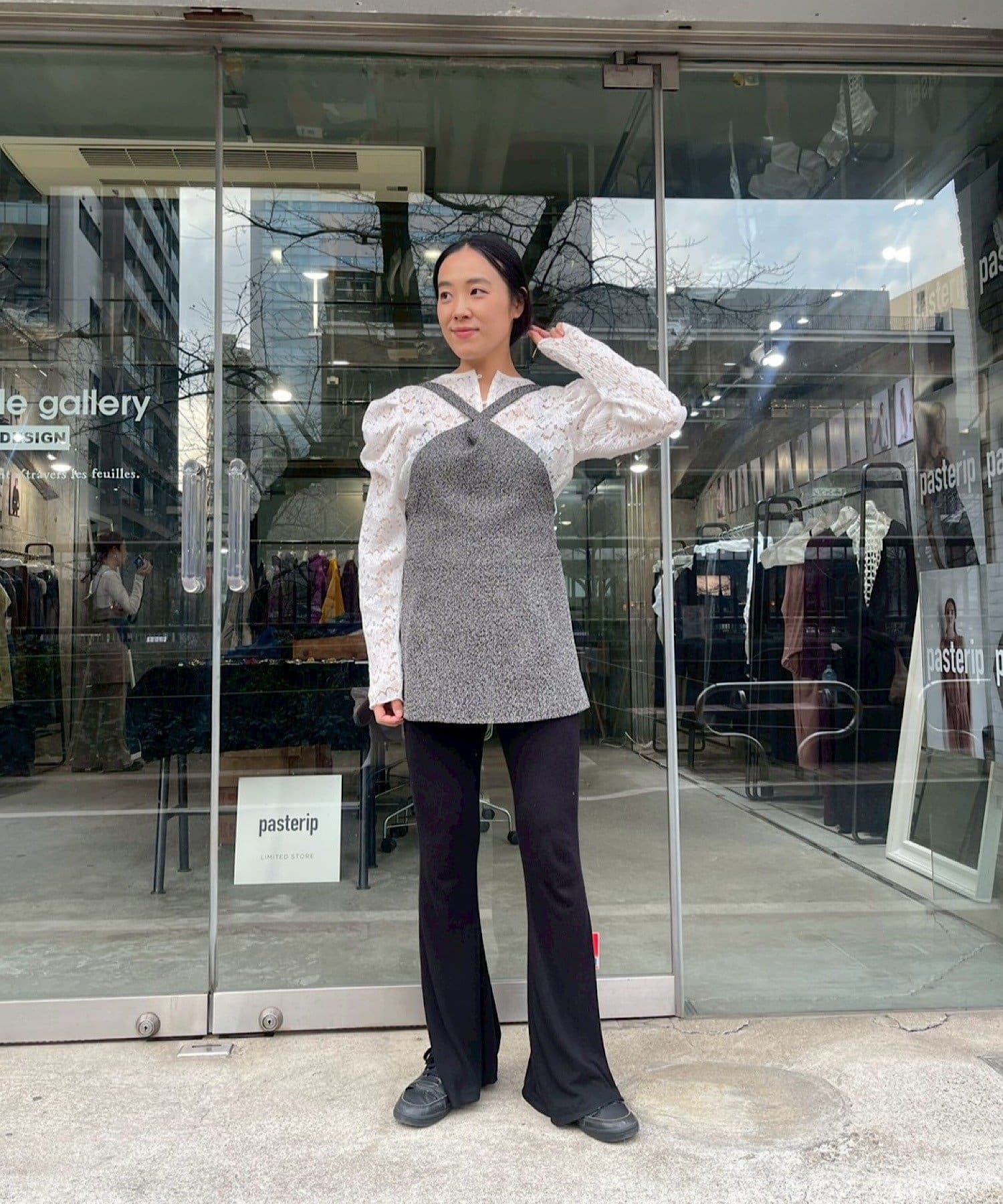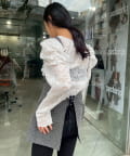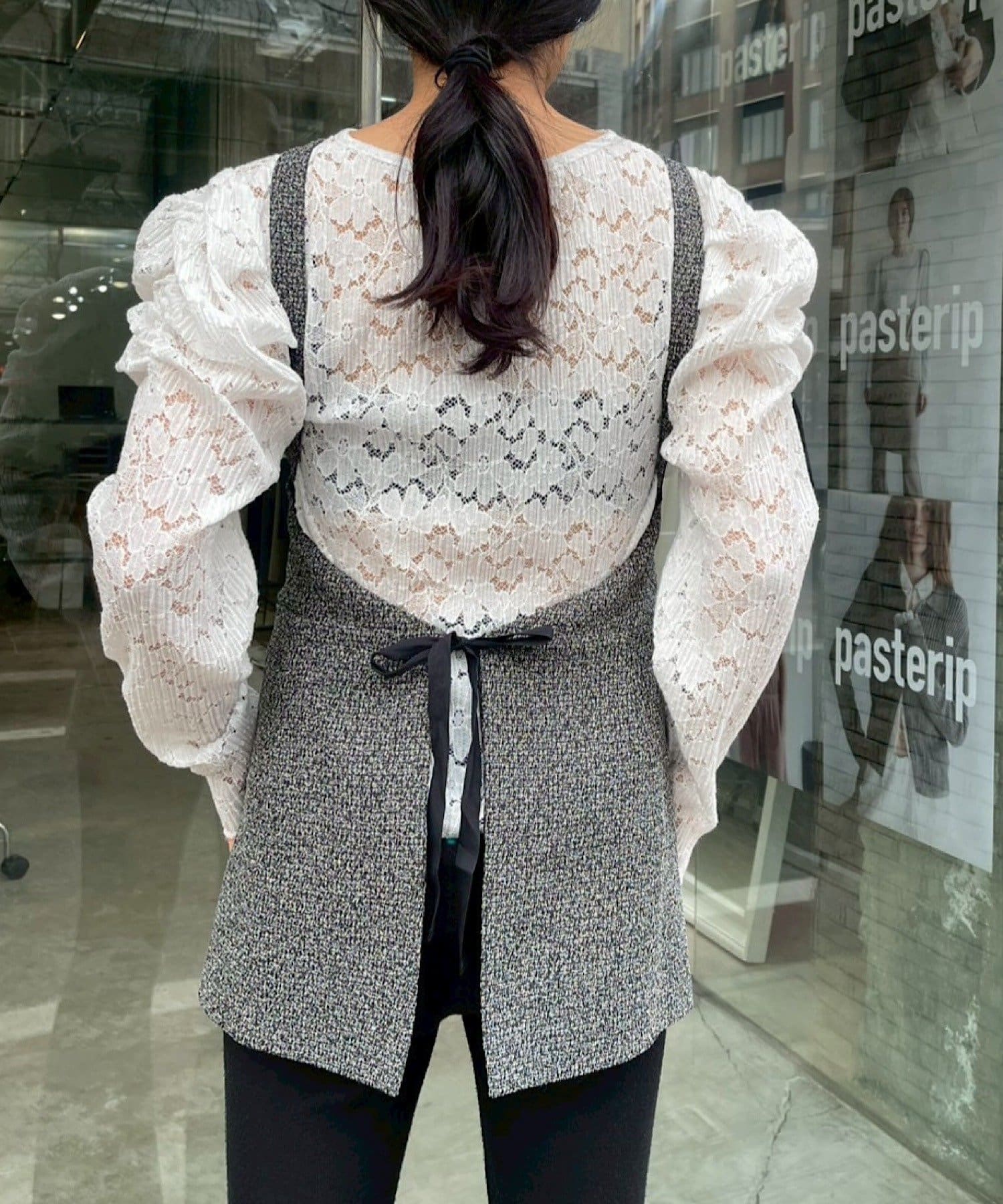 カラーはミックス感のあるグレー。インナーにレースものを重ねるのが今年の春の人気スタリングです。