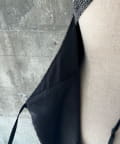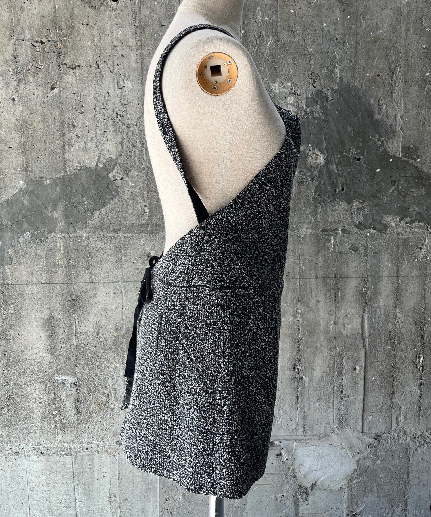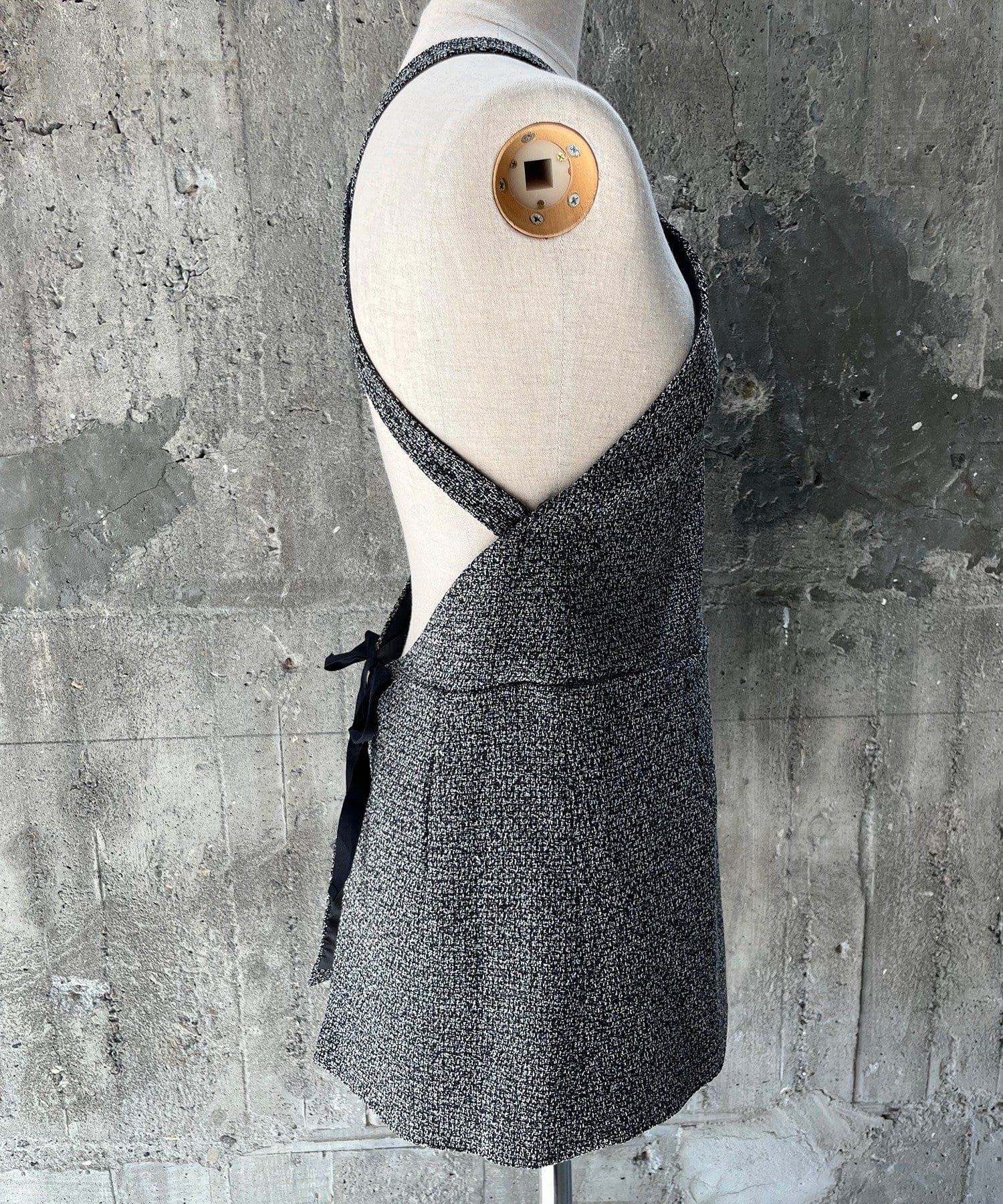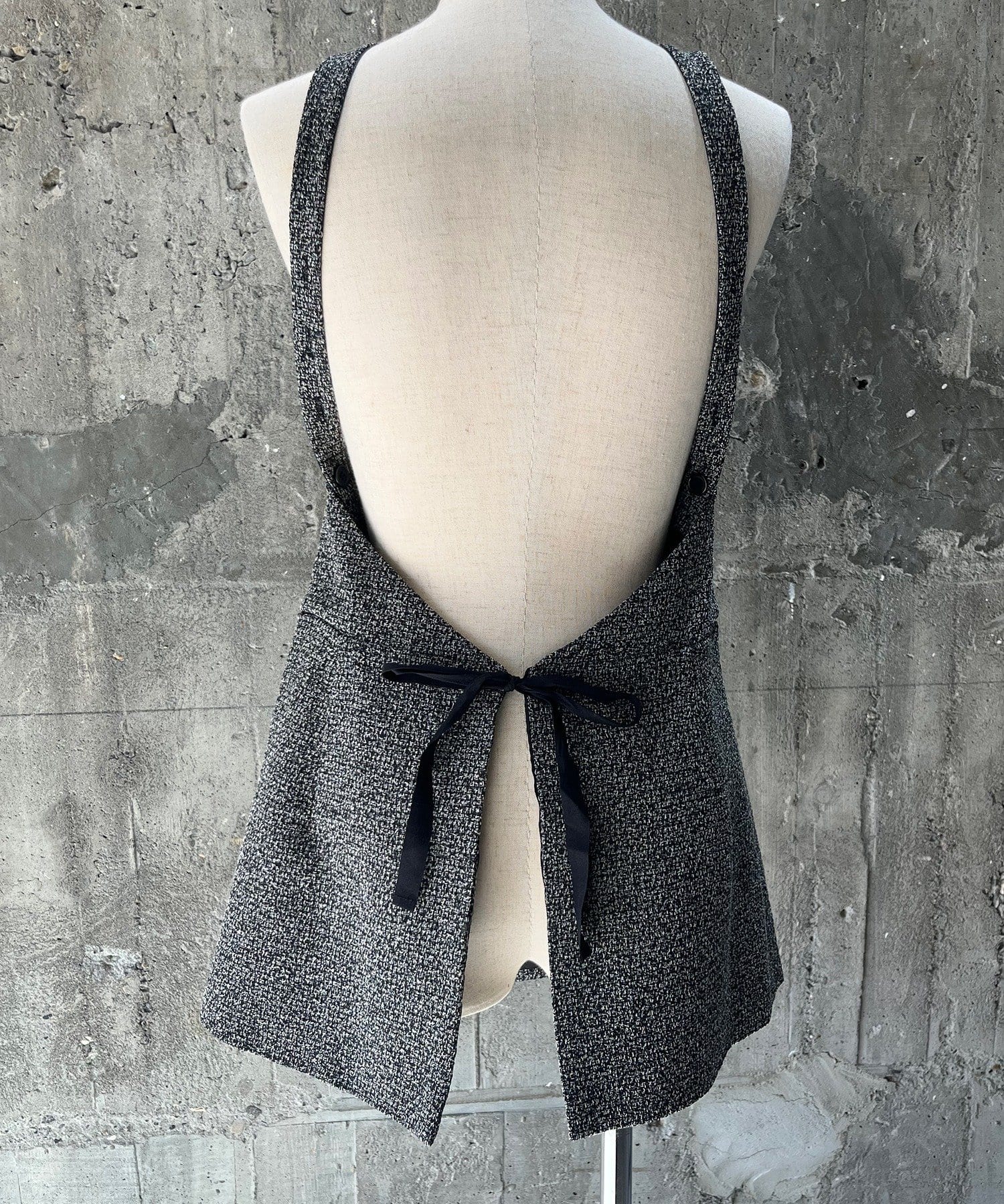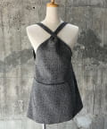 着方は、Tシャツや長袖インナーに重ねてエプロンのようにウエスト部分両脇に付いた紐を背中で結びます。肩紐は、ボタンで取り外して長さを変えられるアジャストメント付き。裏ワザアレンジとして、前で一度紐を交差してから背面でボタンを留めると、より首元が詰まったデザインに変化します。また、首の後ろで結ぶのもおすすめです。