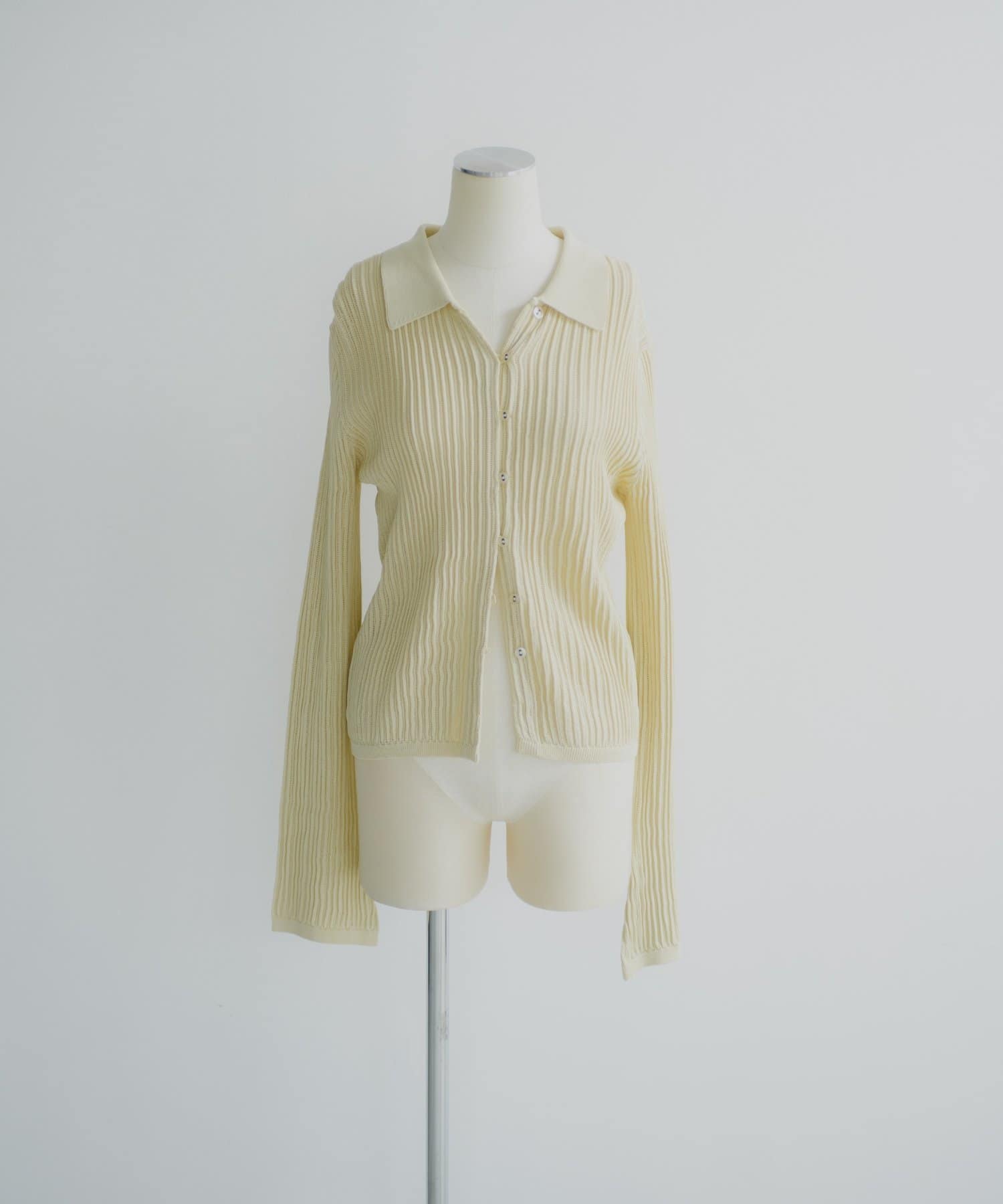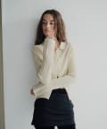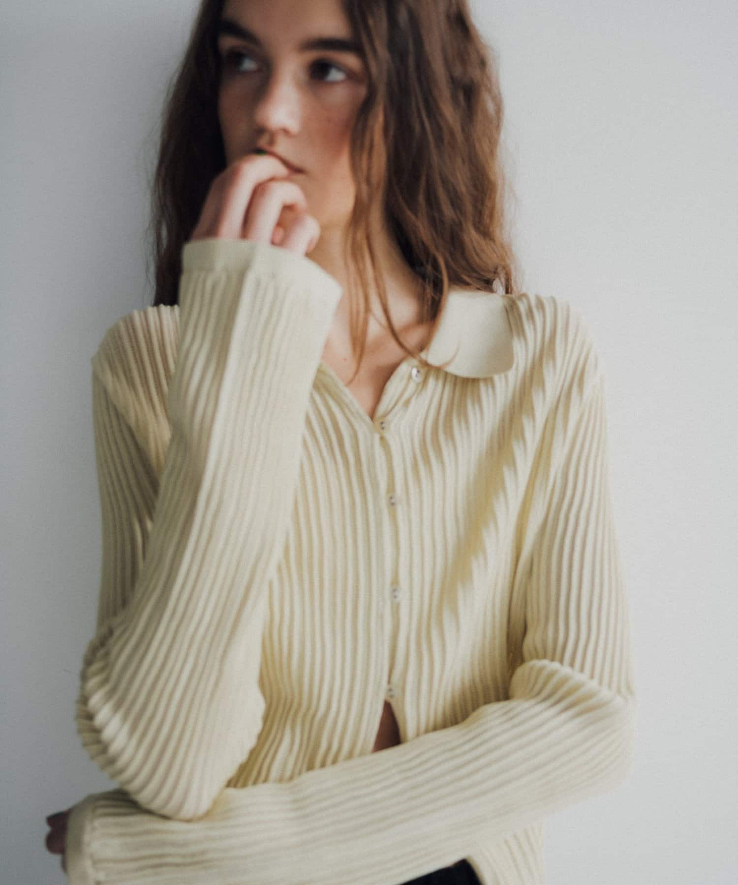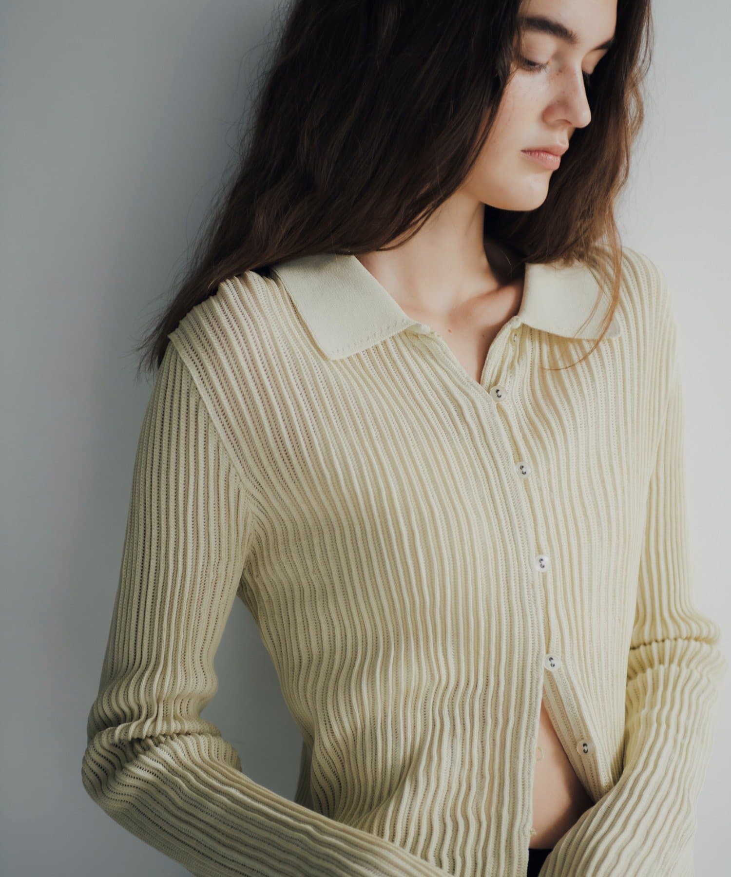 程良い透け感とシャリ味のある風合いが特徴の襟付きサマーニットカーディガン。凹凸感のあるリブの編地で、ボディラインが綺麗に補正される安心感のある1着です。通気性が良く、肌離れも良いので夏でも暑苦しくなく着用いただけます。特に襟物が気分な今シーズンは、1枚着はもちろん、ジャケットの中に着用したりインナーにレースものを重ねたり、さまざまなコーディネートで活躍する万能なアイテムです。