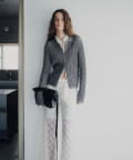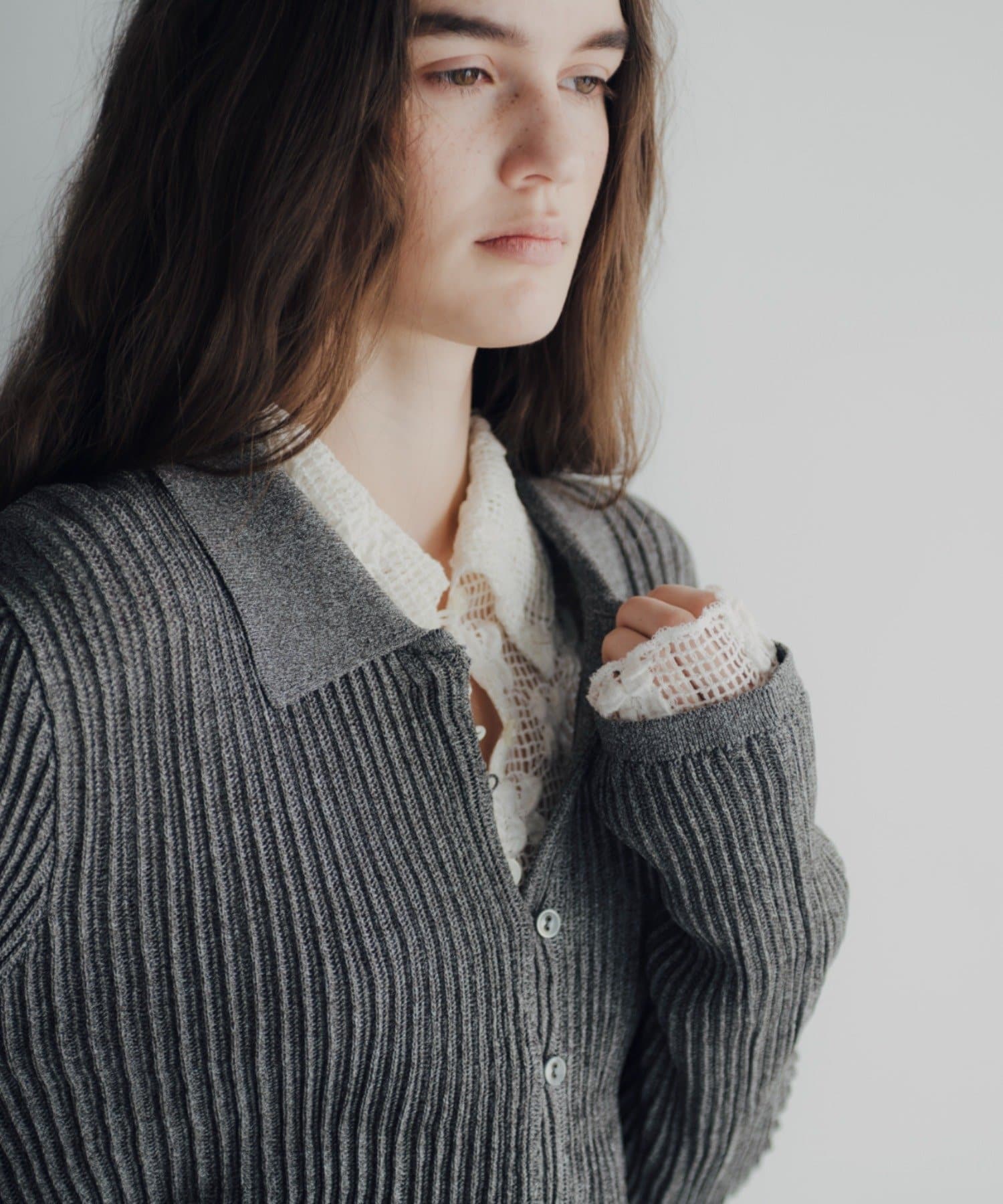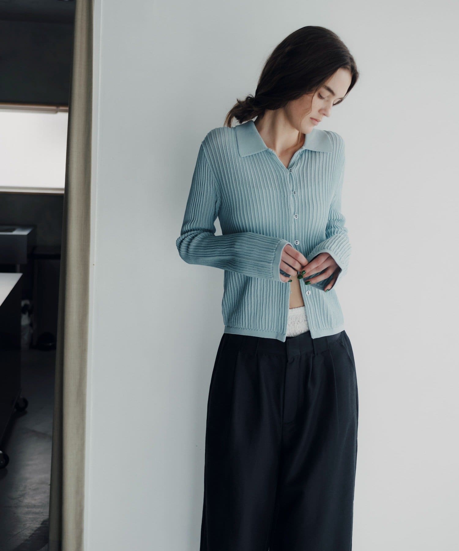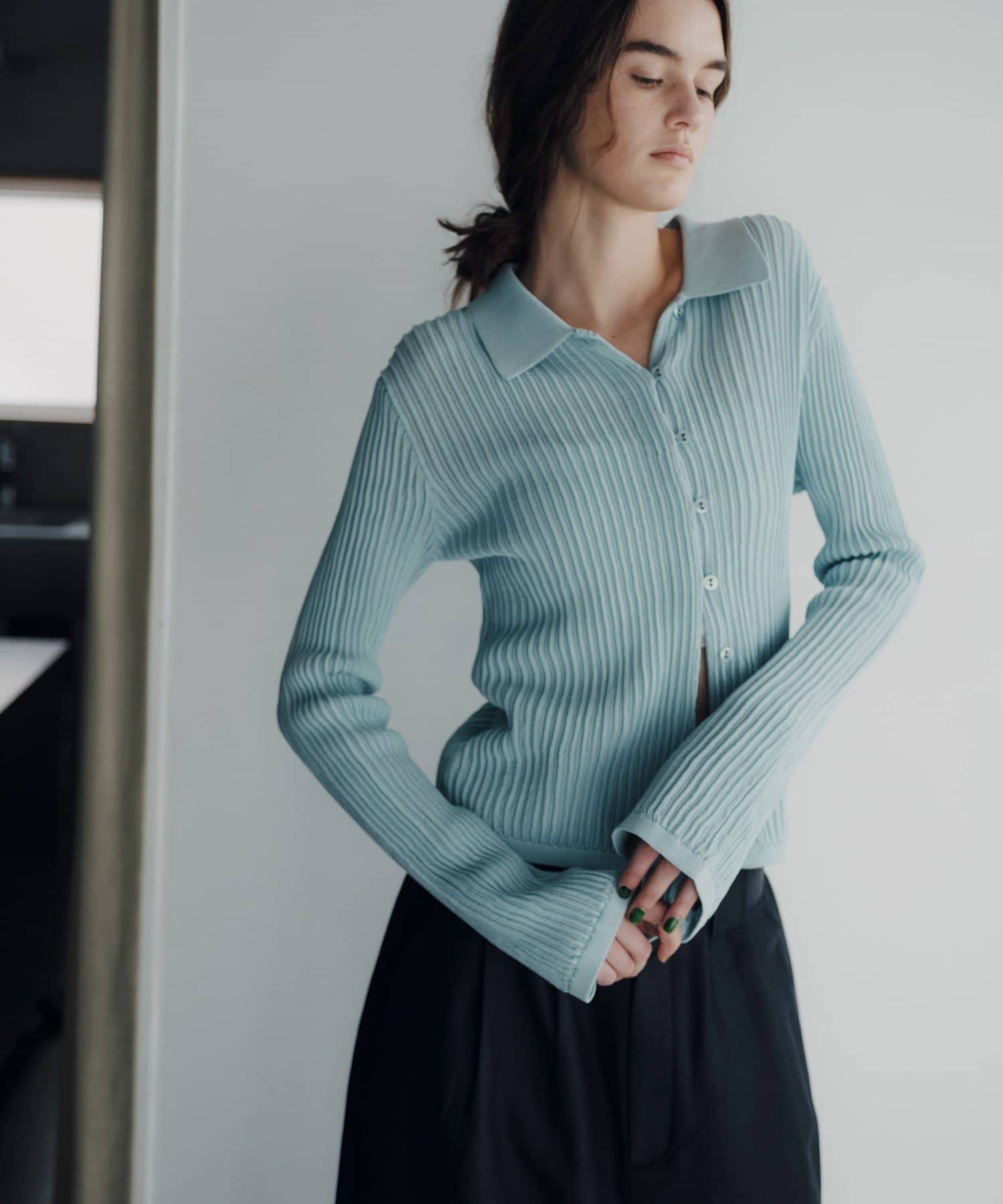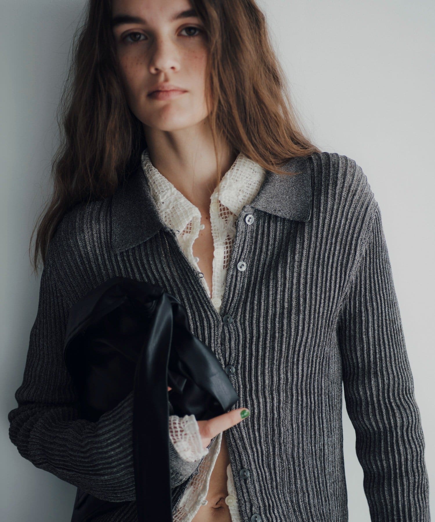 程良い透け感とシャリ味のある風合いが特徴の襟付きサマーニットカーディガン。凹凸感のあるリブの編地で、ボディラインが綺麗に補正される安心感のある1着です。通気性が良く、肌離れも良いので夏でも暑苦しくなく着用いただけます。特に襟物が気分な今シーズンは、1枚着はもちろん、ジャケットの中に着用したりインナーにレースものを重ねたり、さまざまなコーディネートで活躍する万能なアイテムです。