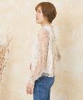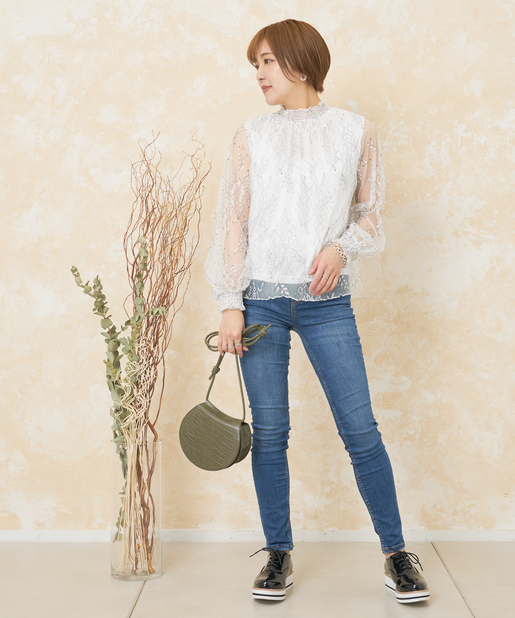 低めのハイネックと袖のシャーリングが、レディライクな雰囲気を演出します。