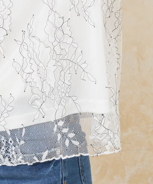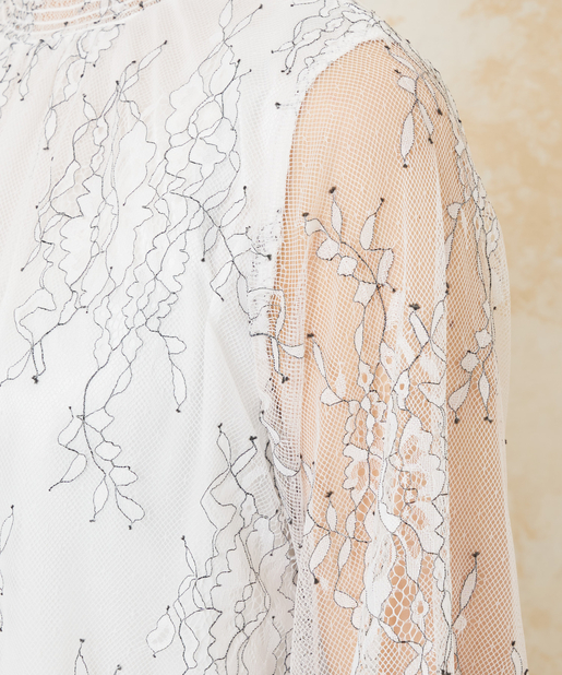 大胆なフラワー刺繍をあしらったレースがエレガントな雰囲気を醸し出す、
