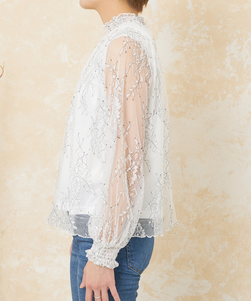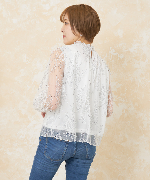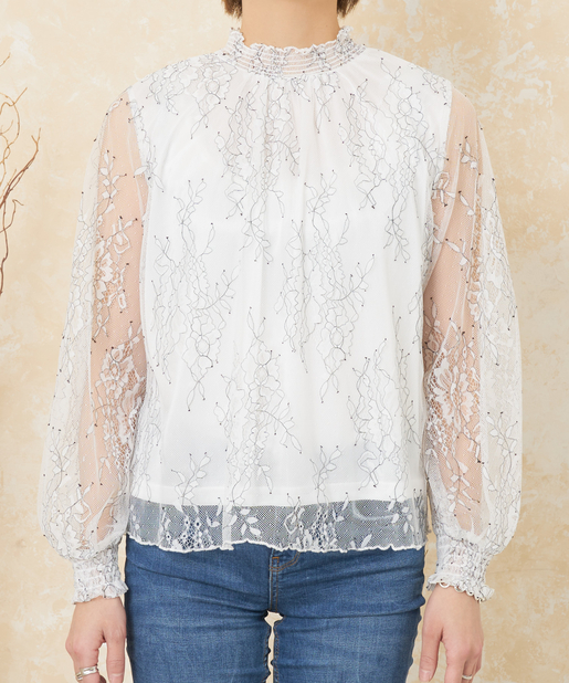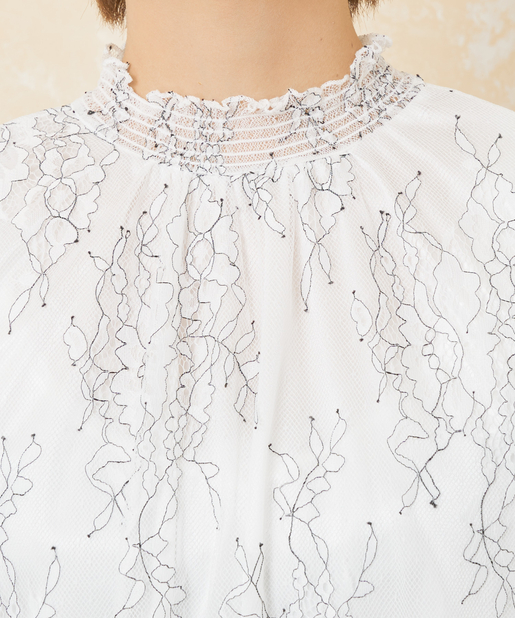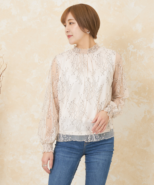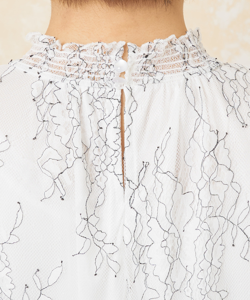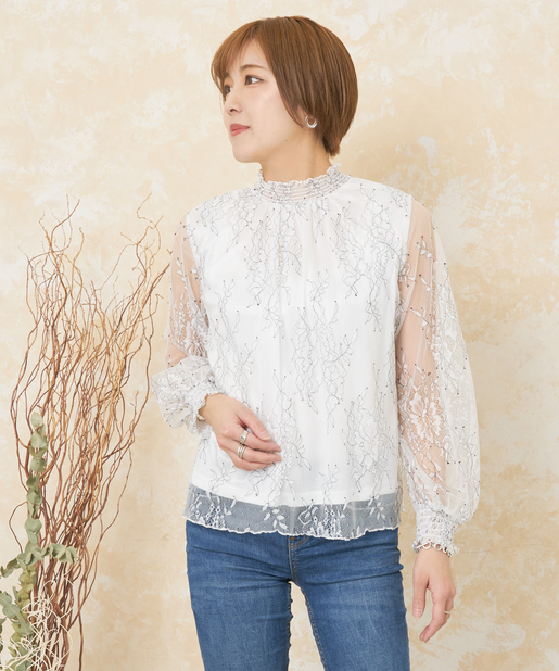 花柄レースシャーリングネックブラウス