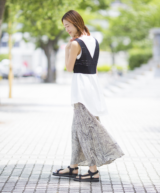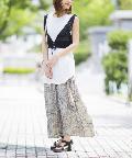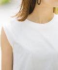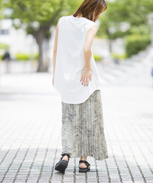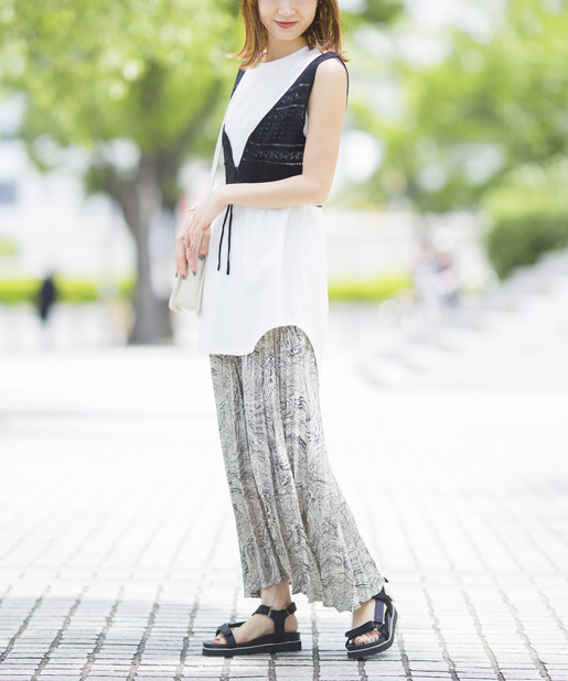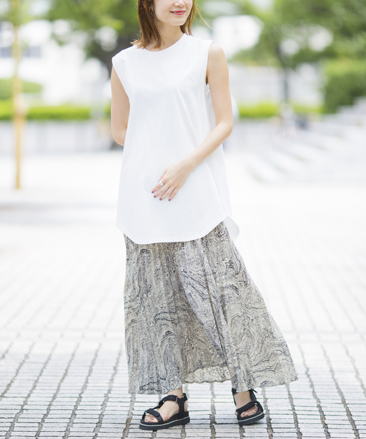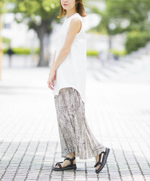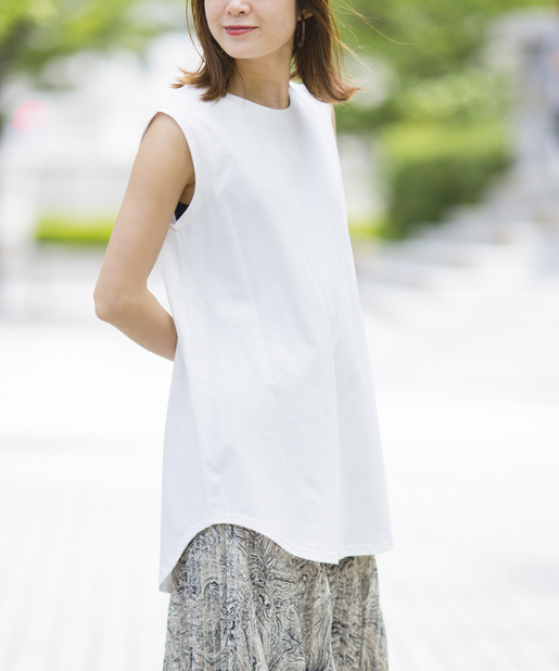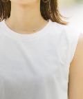 ●タンクトップの肩にかかる絶妙な長さが二の腕まわりを