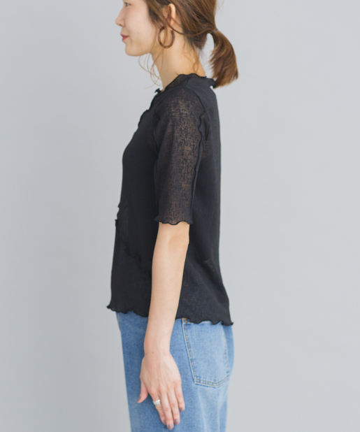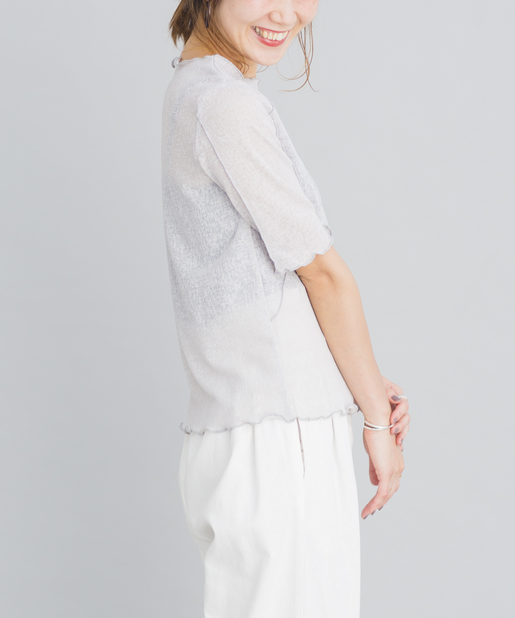 ●襟や裾などにメロウデザインをあしらったシアースラブプルオーバー