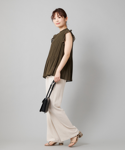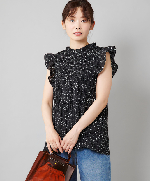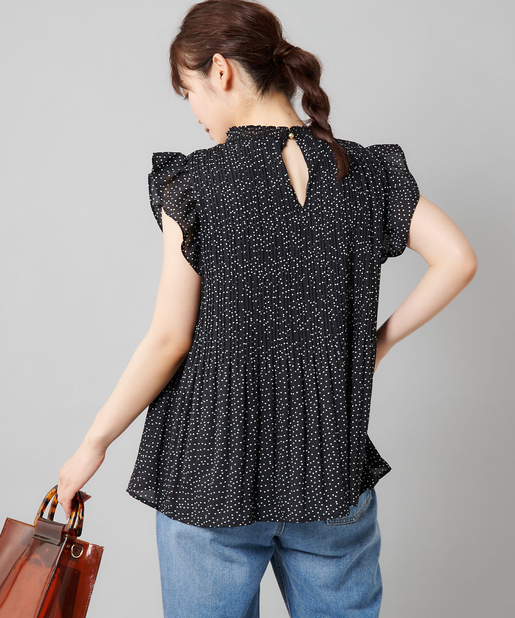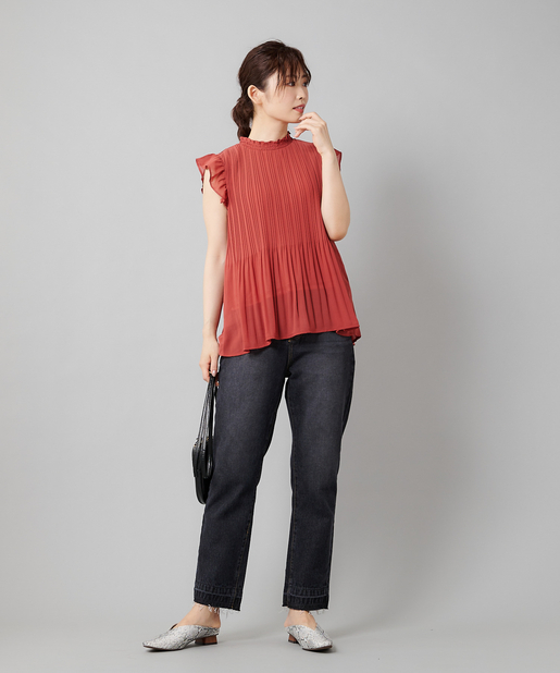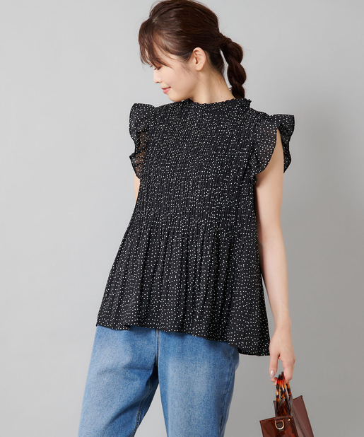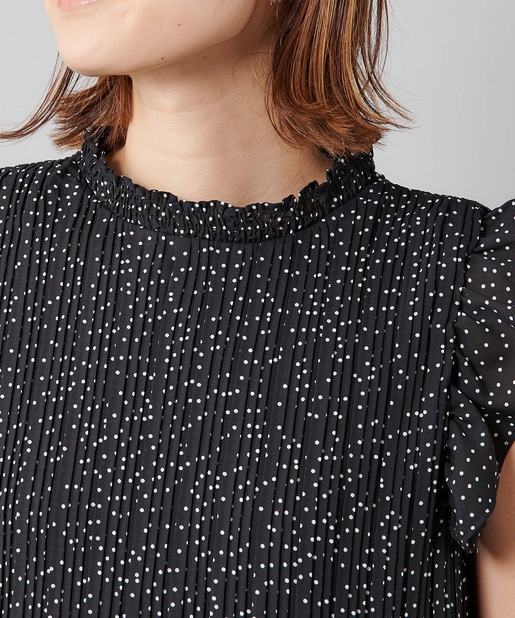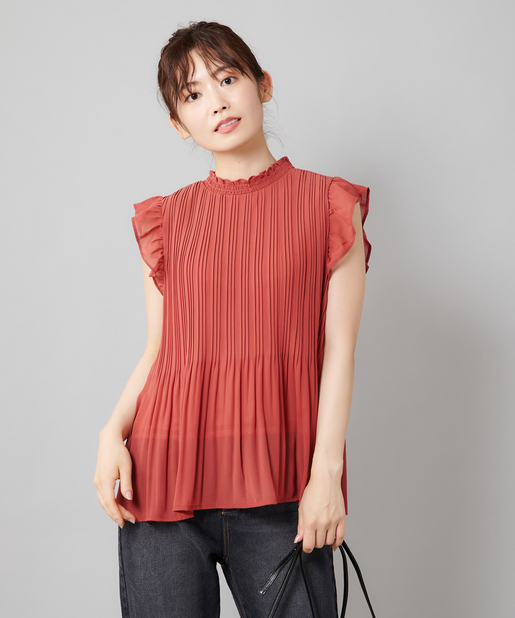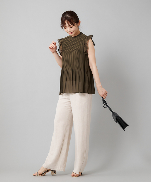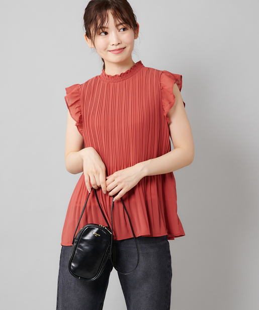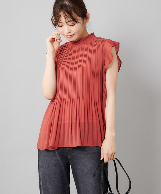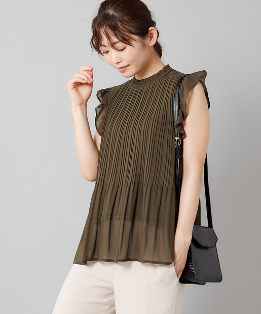 【女性らしさを演出】袖フリル消しプリーツプチハイネックブラウス