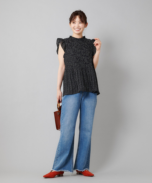 ●プチハイネックや袖のフリルがレディな印象を与えるブラウス