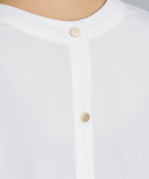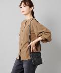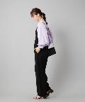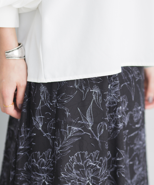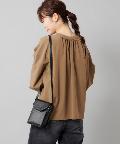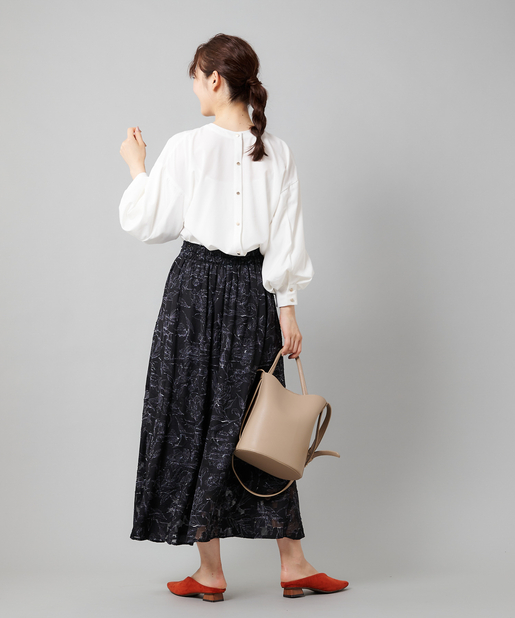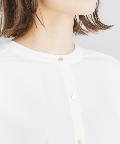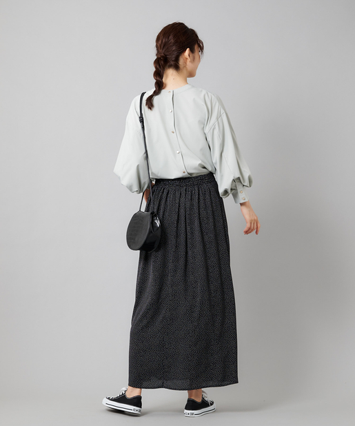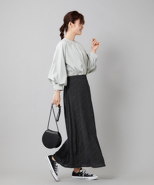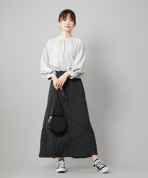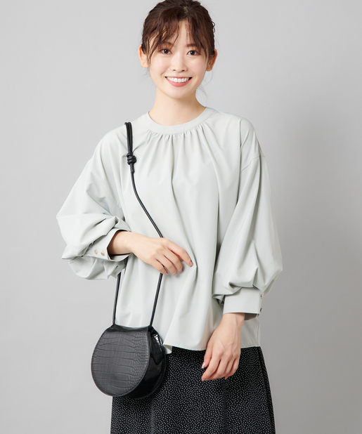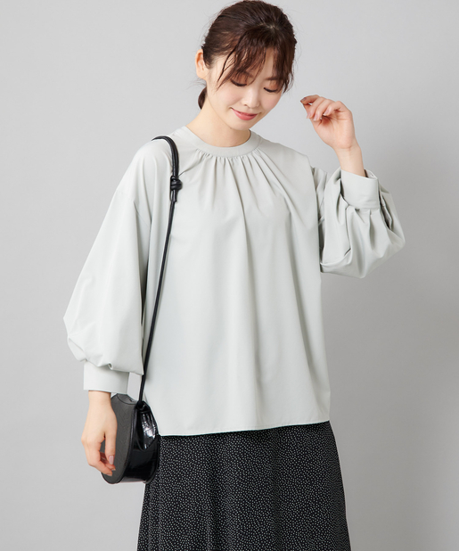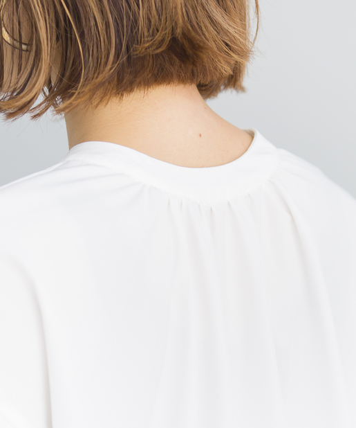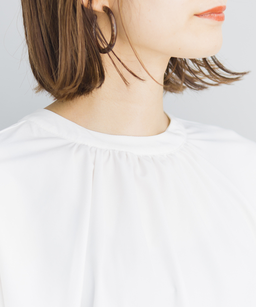 ●フロントネックのシャーリングがフェミニンスタイルに。