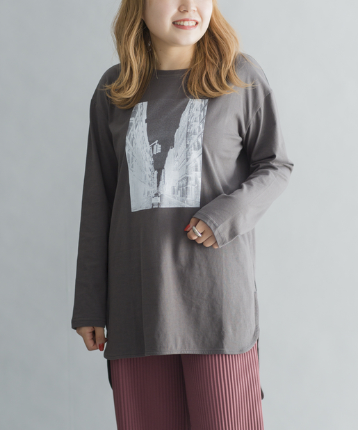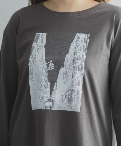 prose verse(プロズヴェール) 【前後ヘムデザイン】街並み転写プリントロングスリーブTシャツ