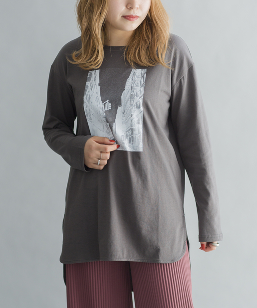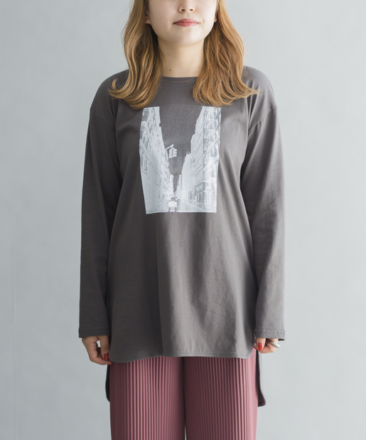 • prose verse(プロズヴェール) 【前後ヘムデザイン】街並み転写プリントロングスリーブTシャツ