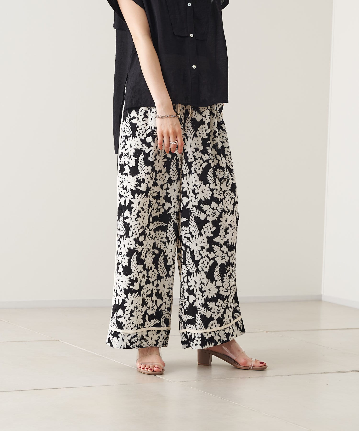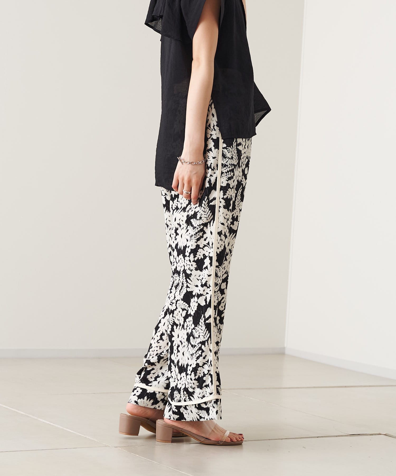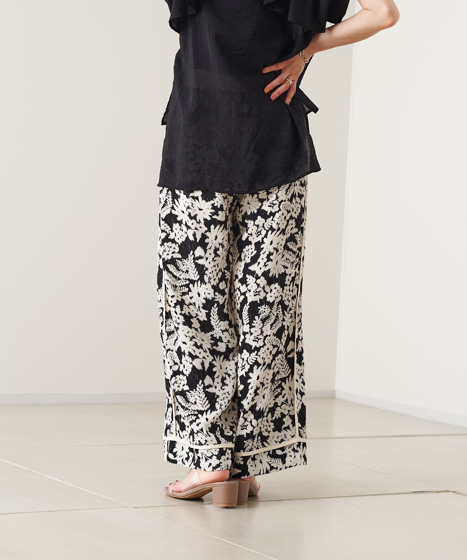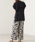 【ウエストゴム仕様】モノトーン花柄パイピングパンツ