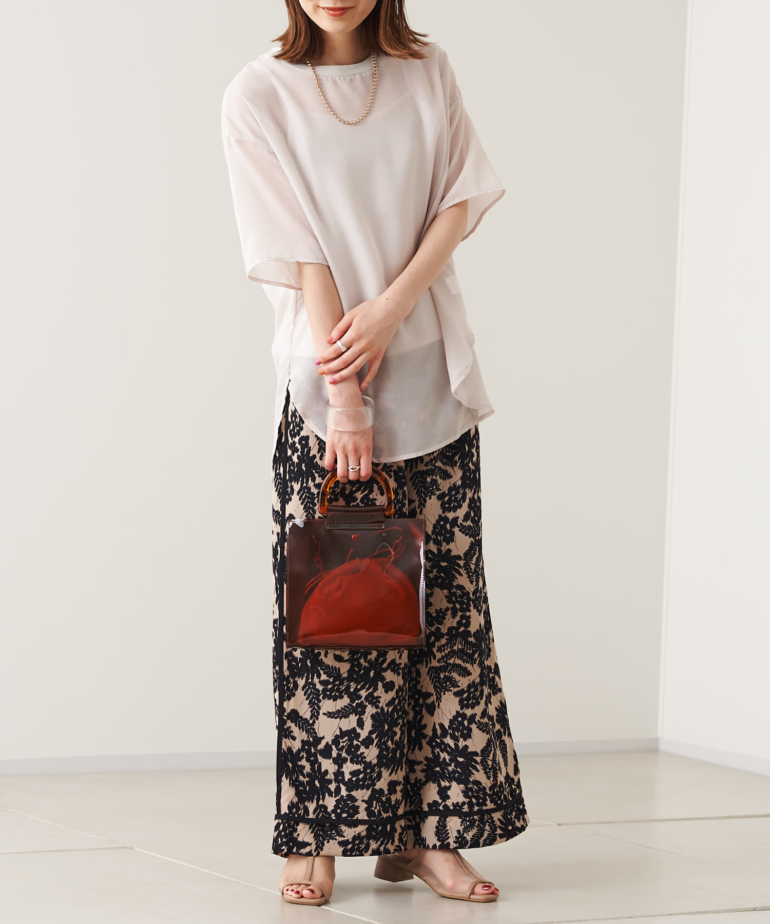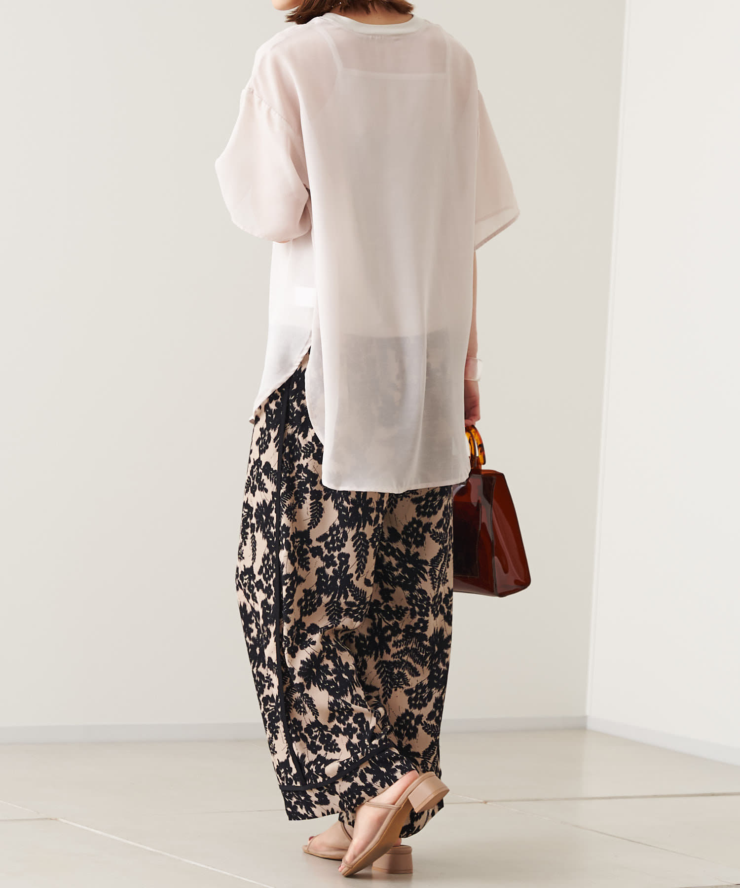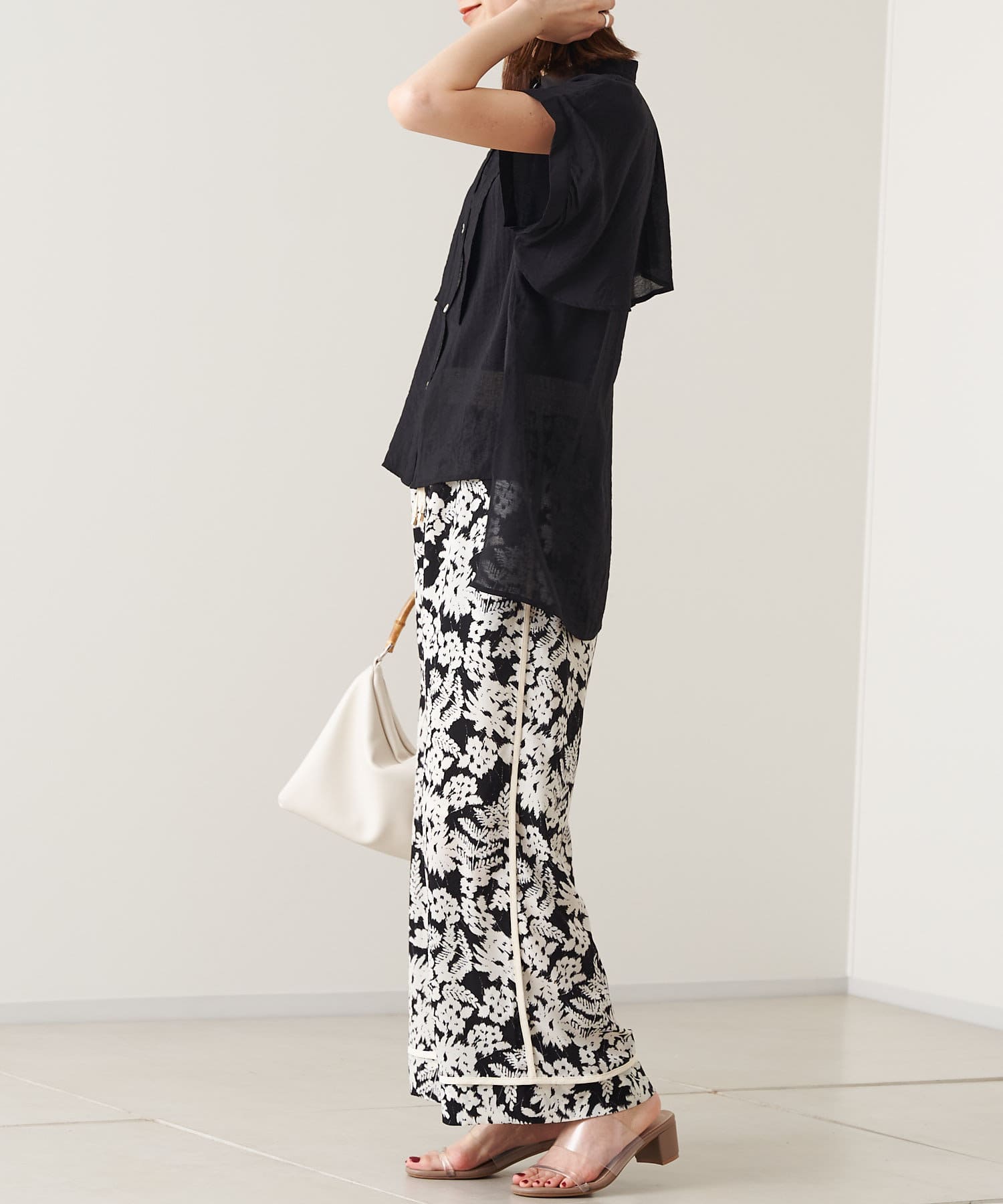 モノトーンな花柄が雰囲気のある大人パンツ