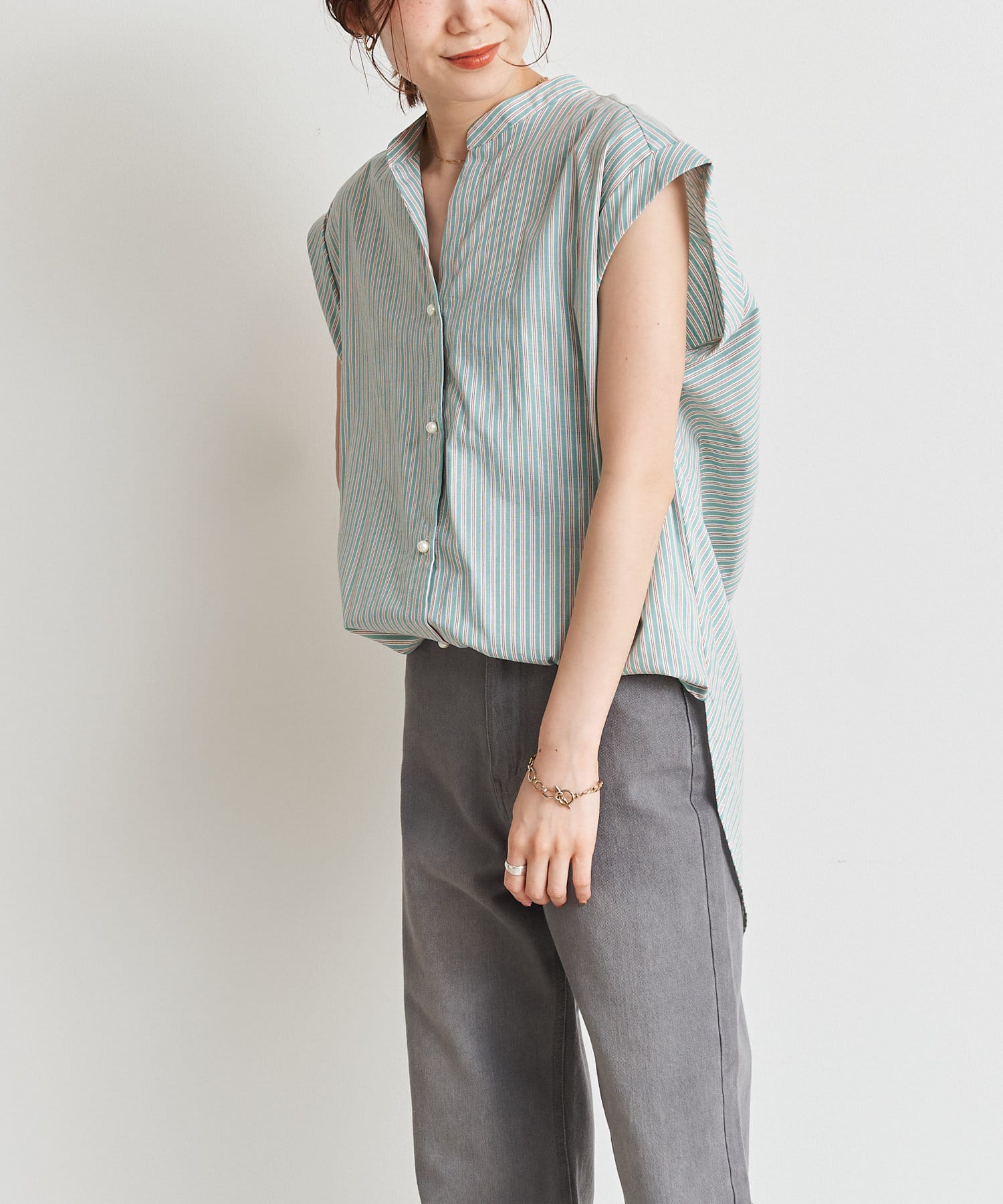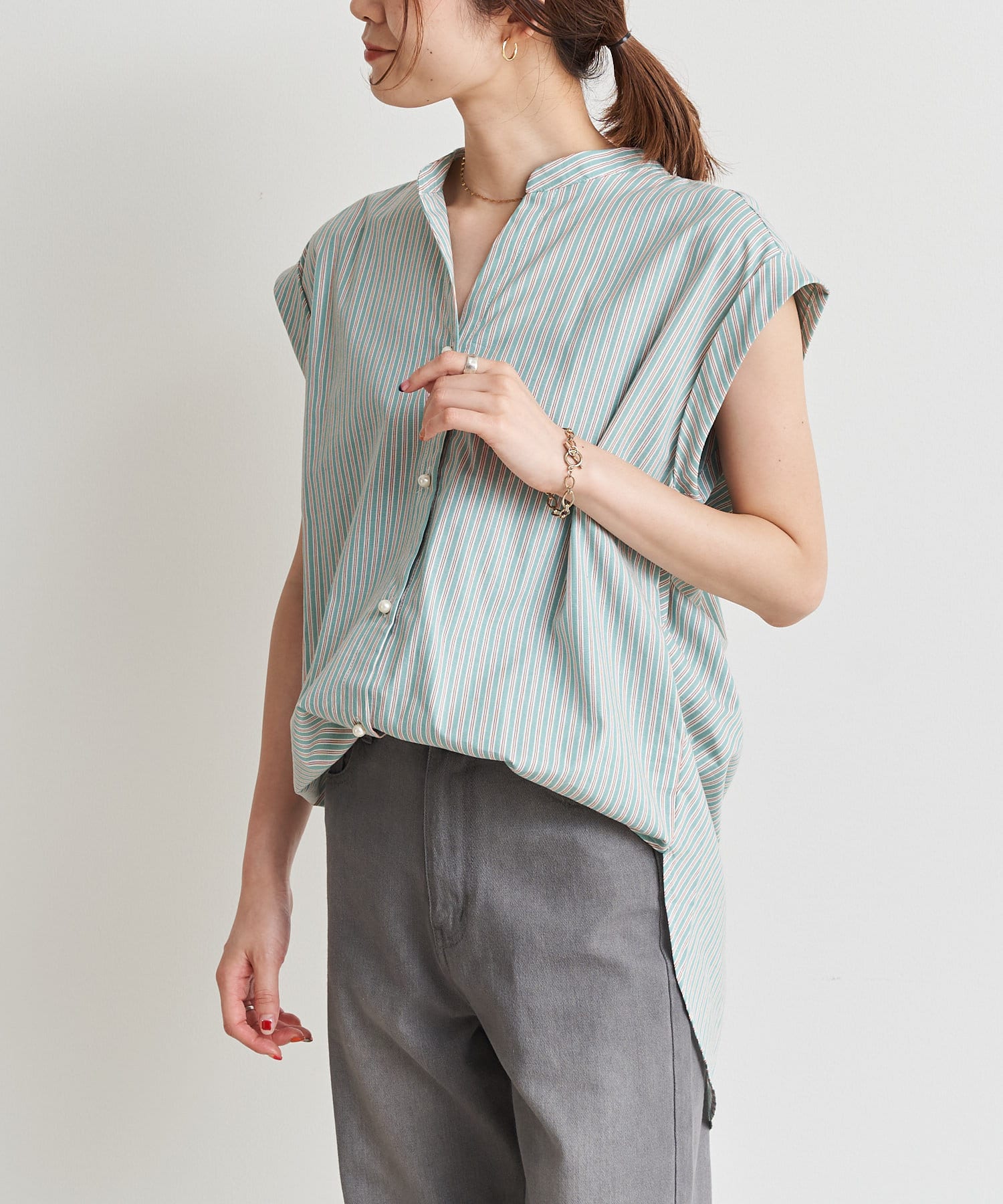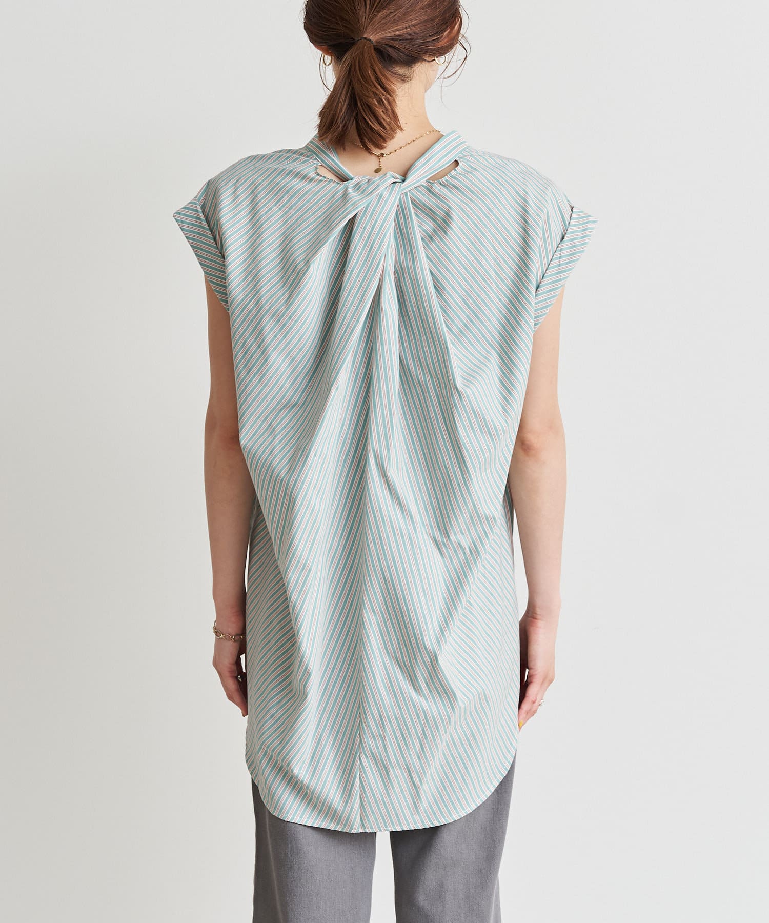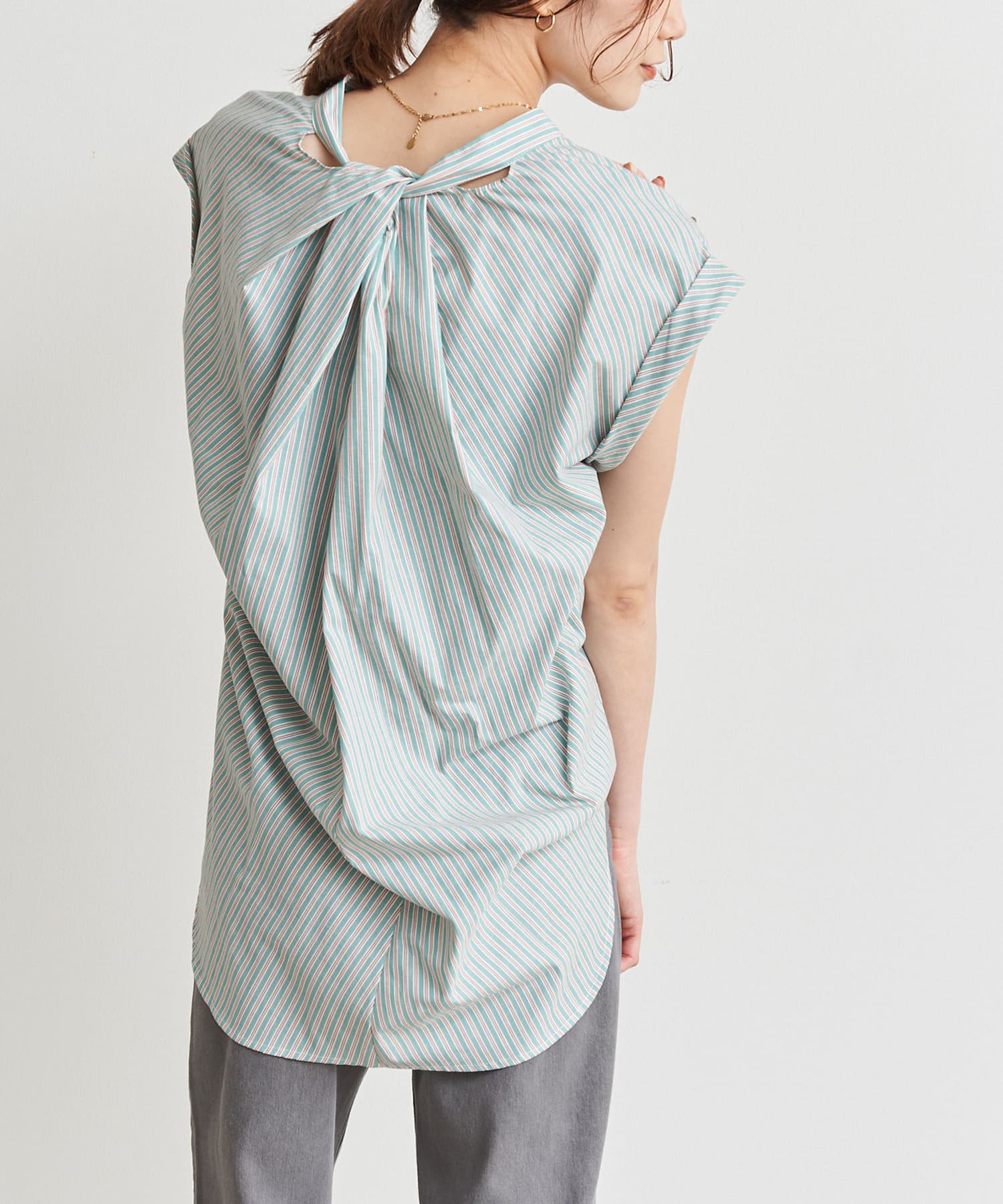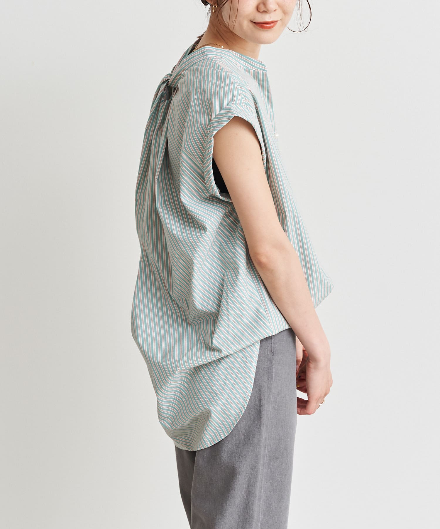 バックツイストパールボタンストライプシャツ