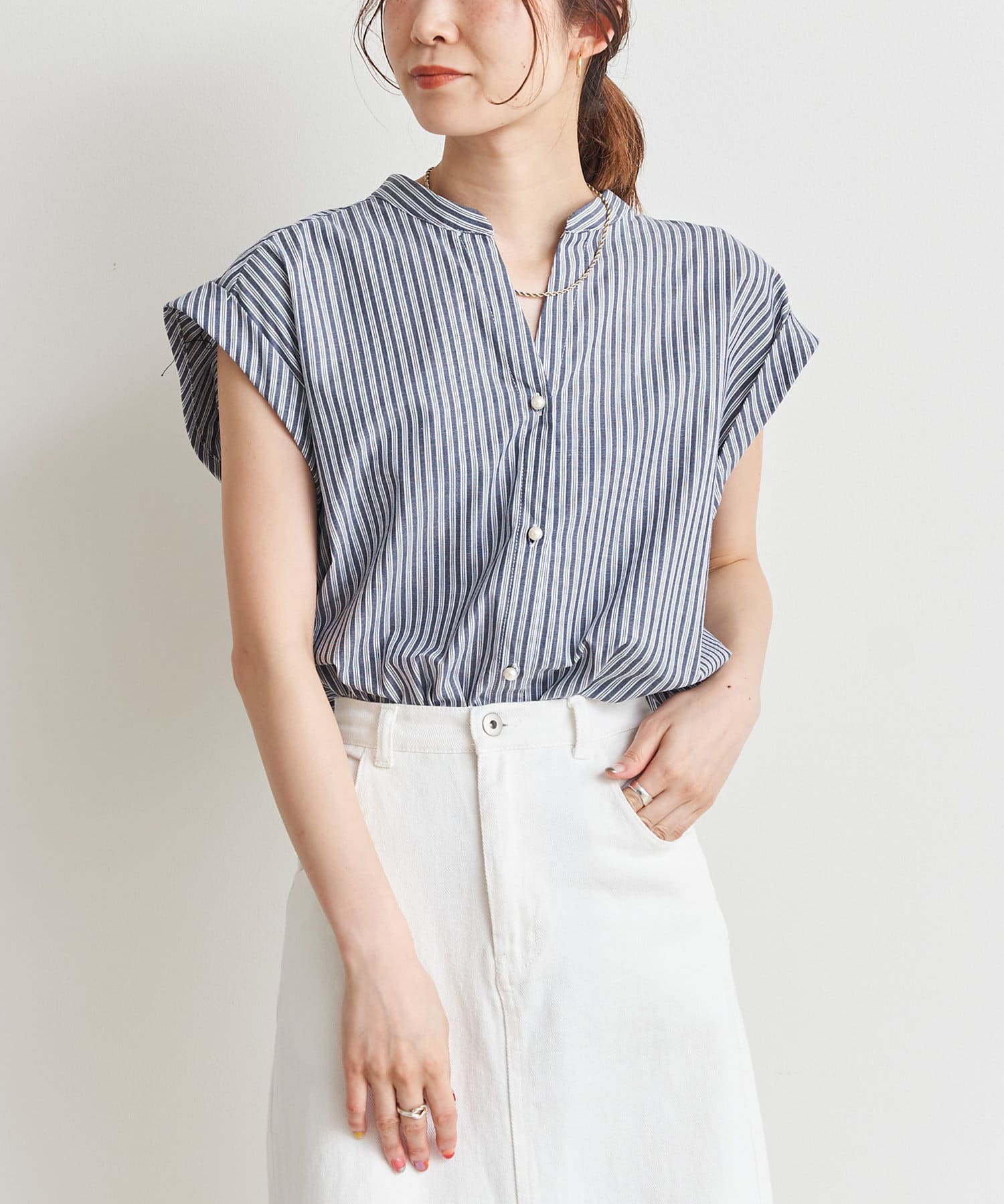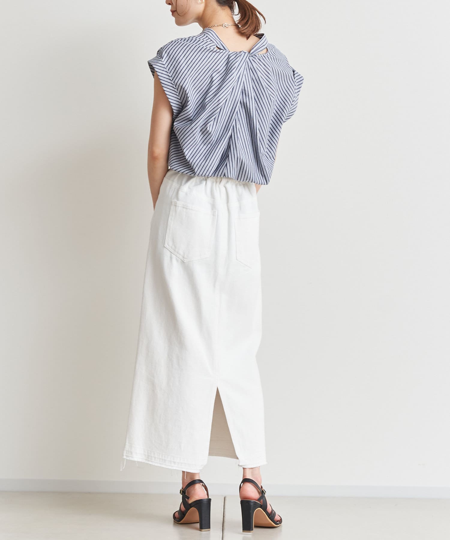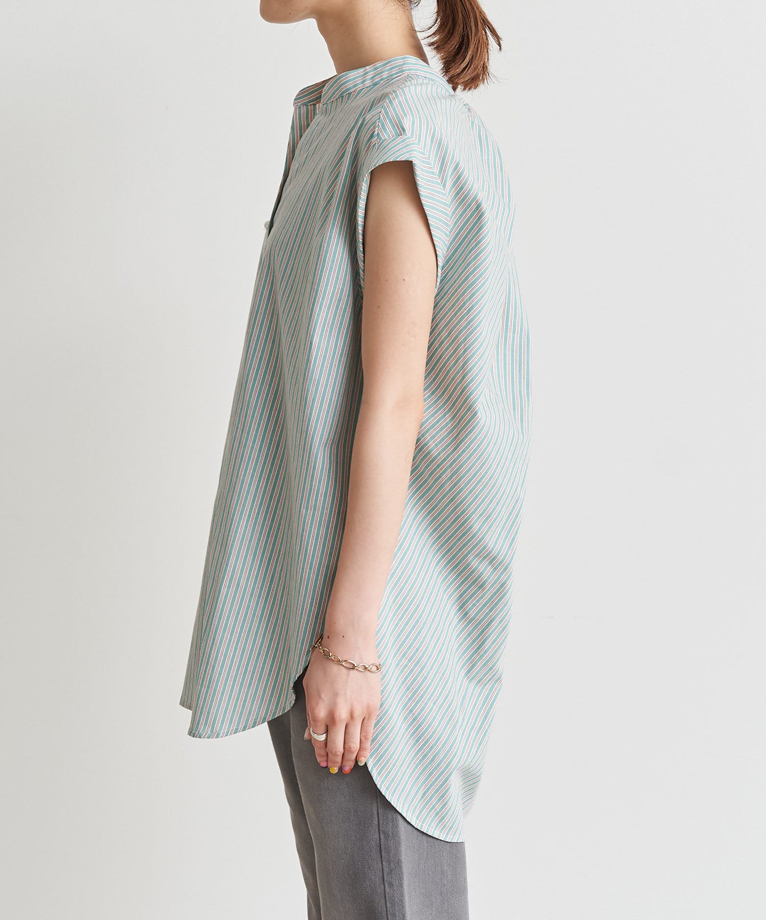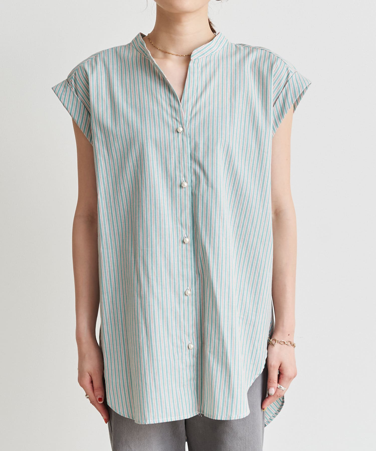 バックツイストパールボタンストライプシャツ