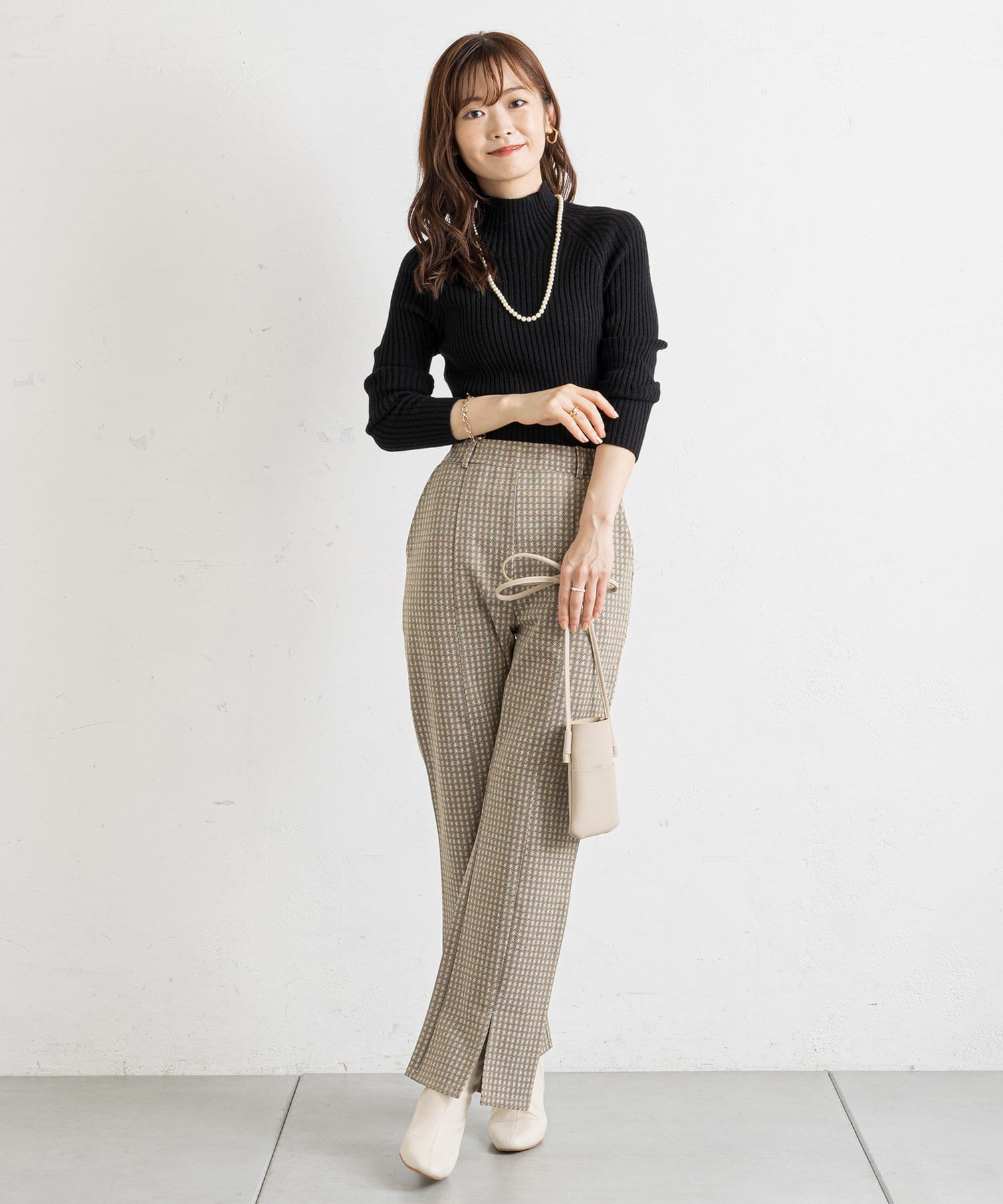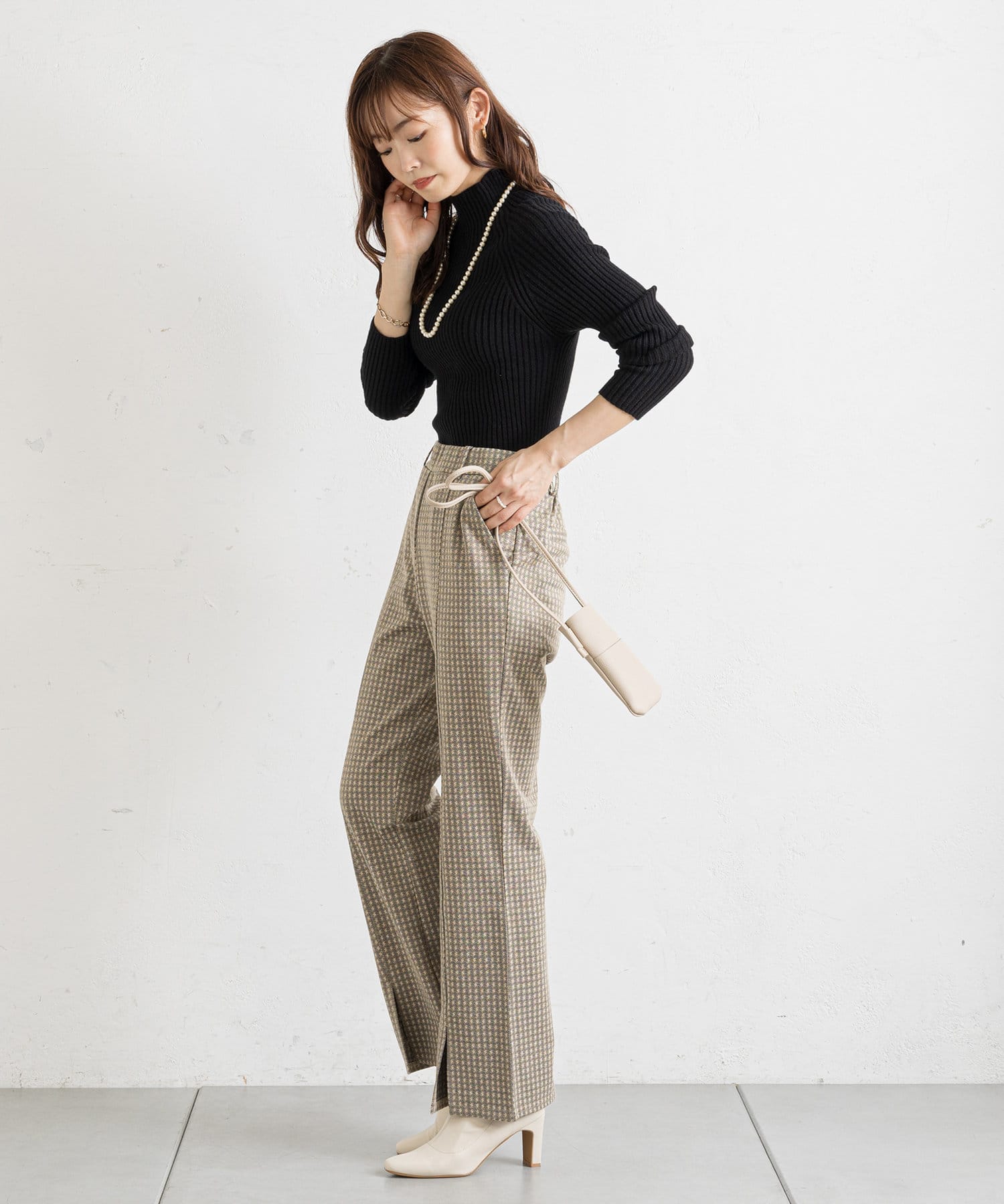 トップスはシンプルなリブニットで