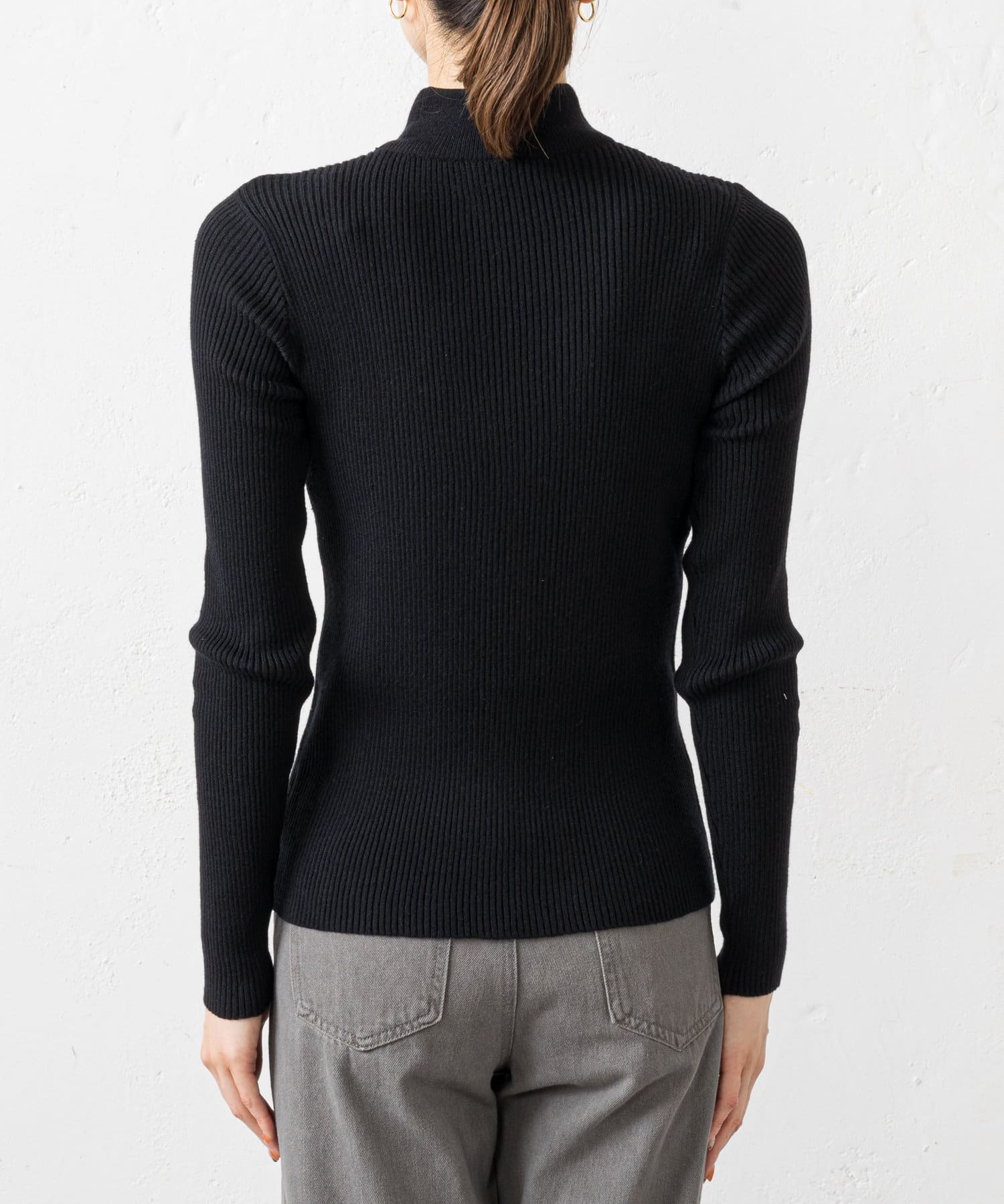 シンプルなデザイン、ブラックなので、ボトムスと合わせやすく、インナーとしても活躍、着まわし抜群のニットです。
