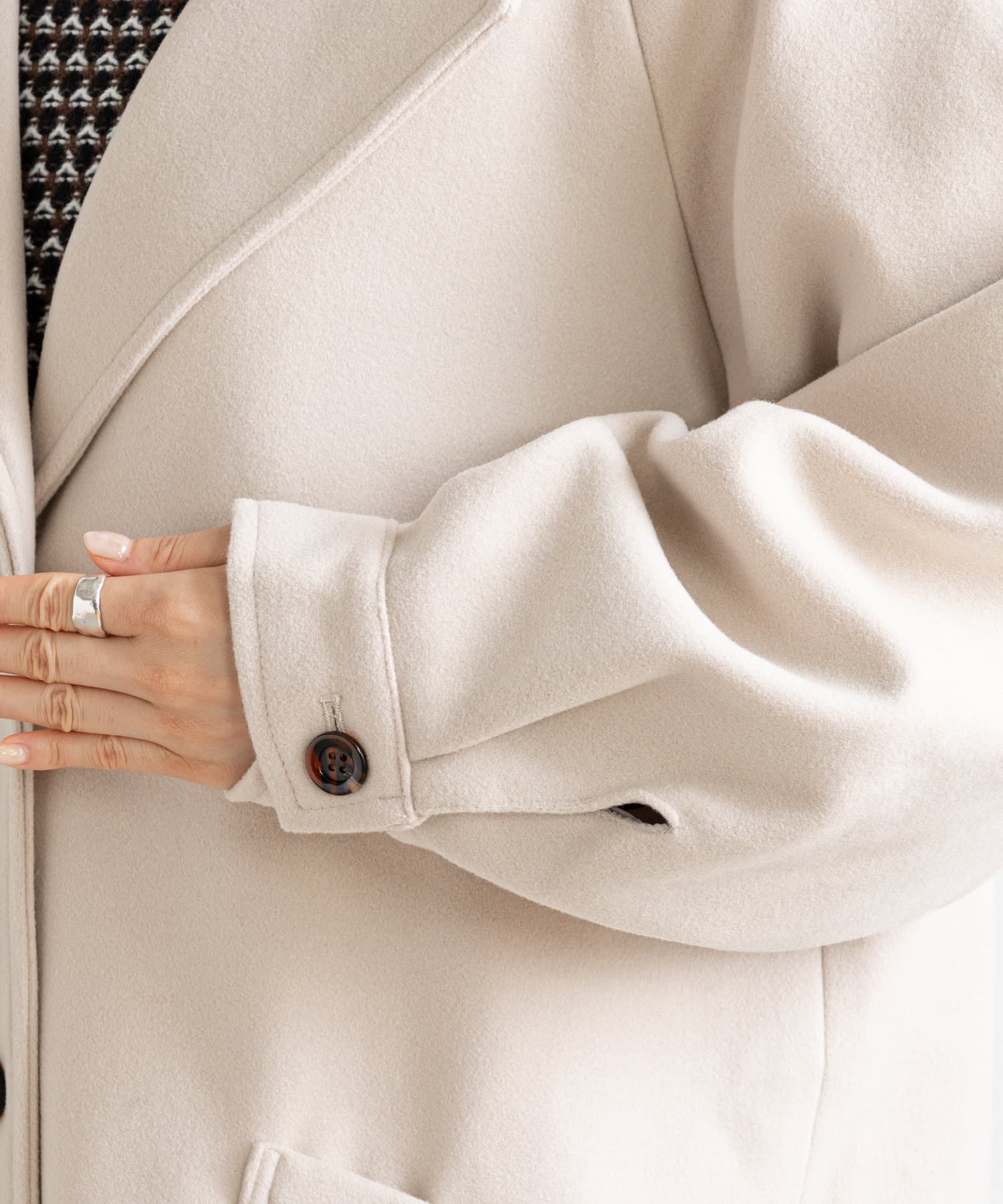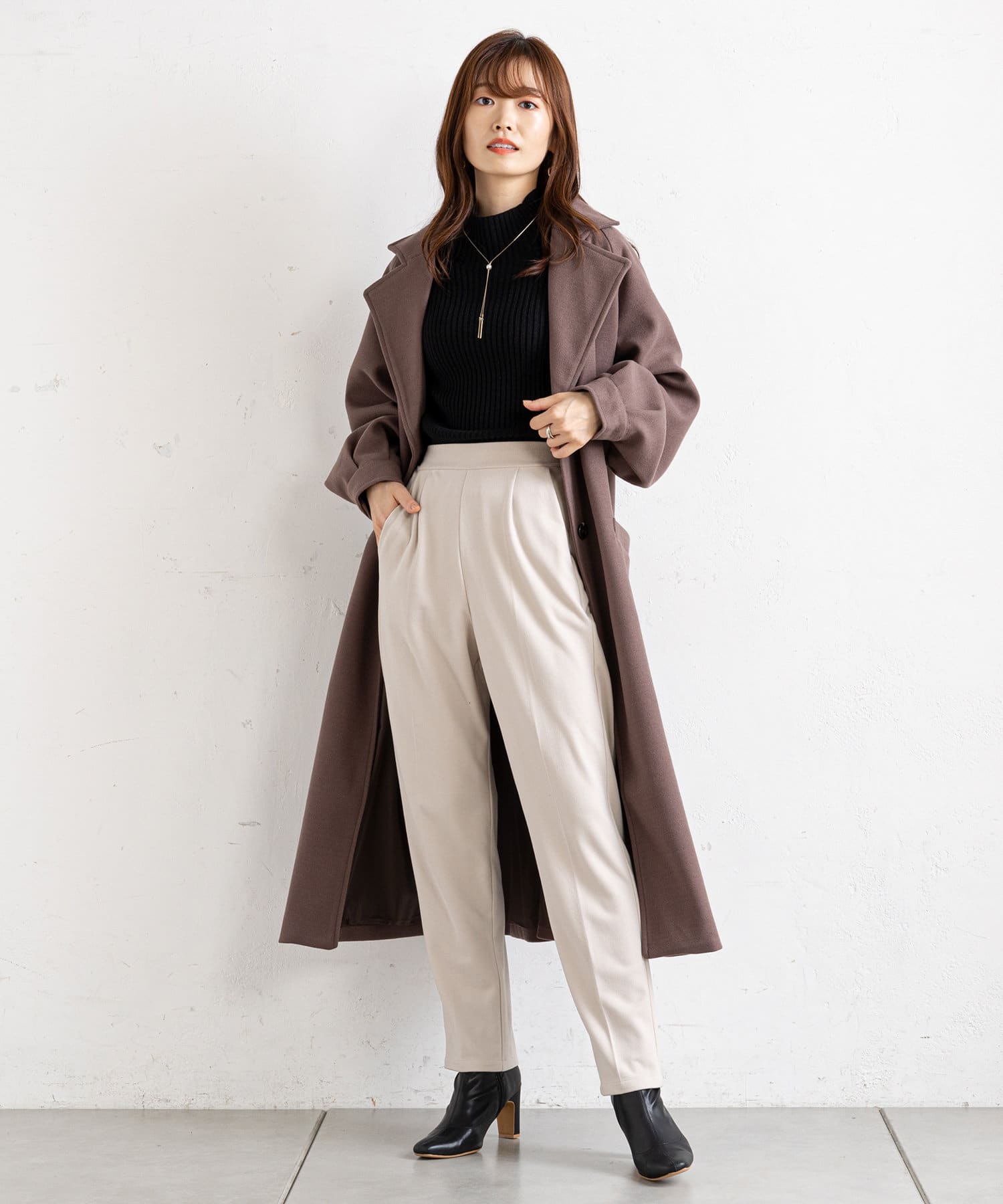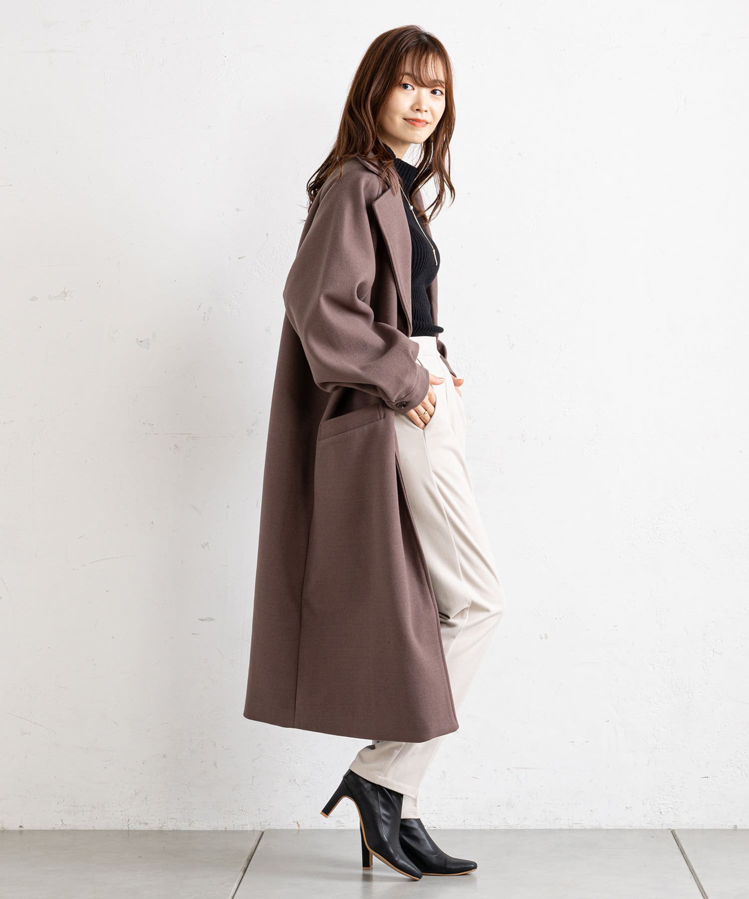 ・ハイネックニットをちらりと覗かせて、