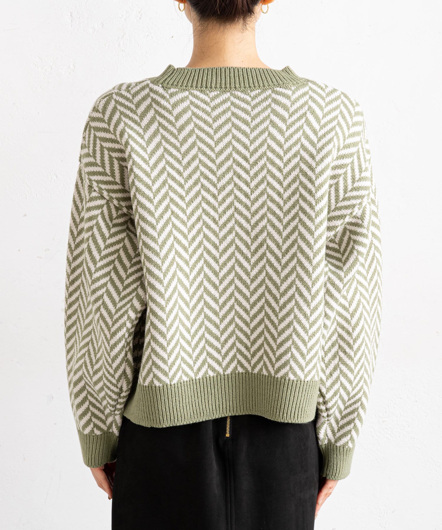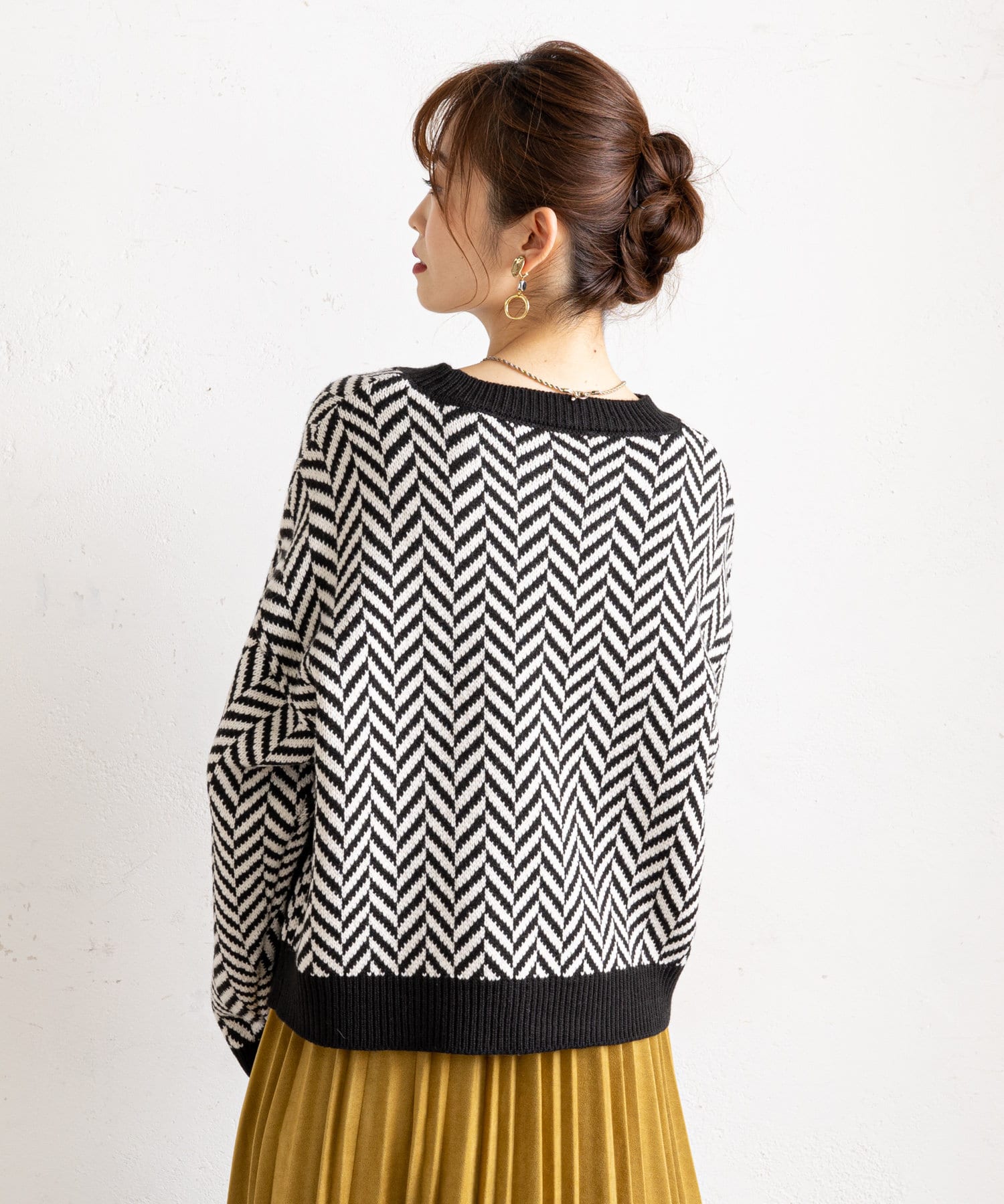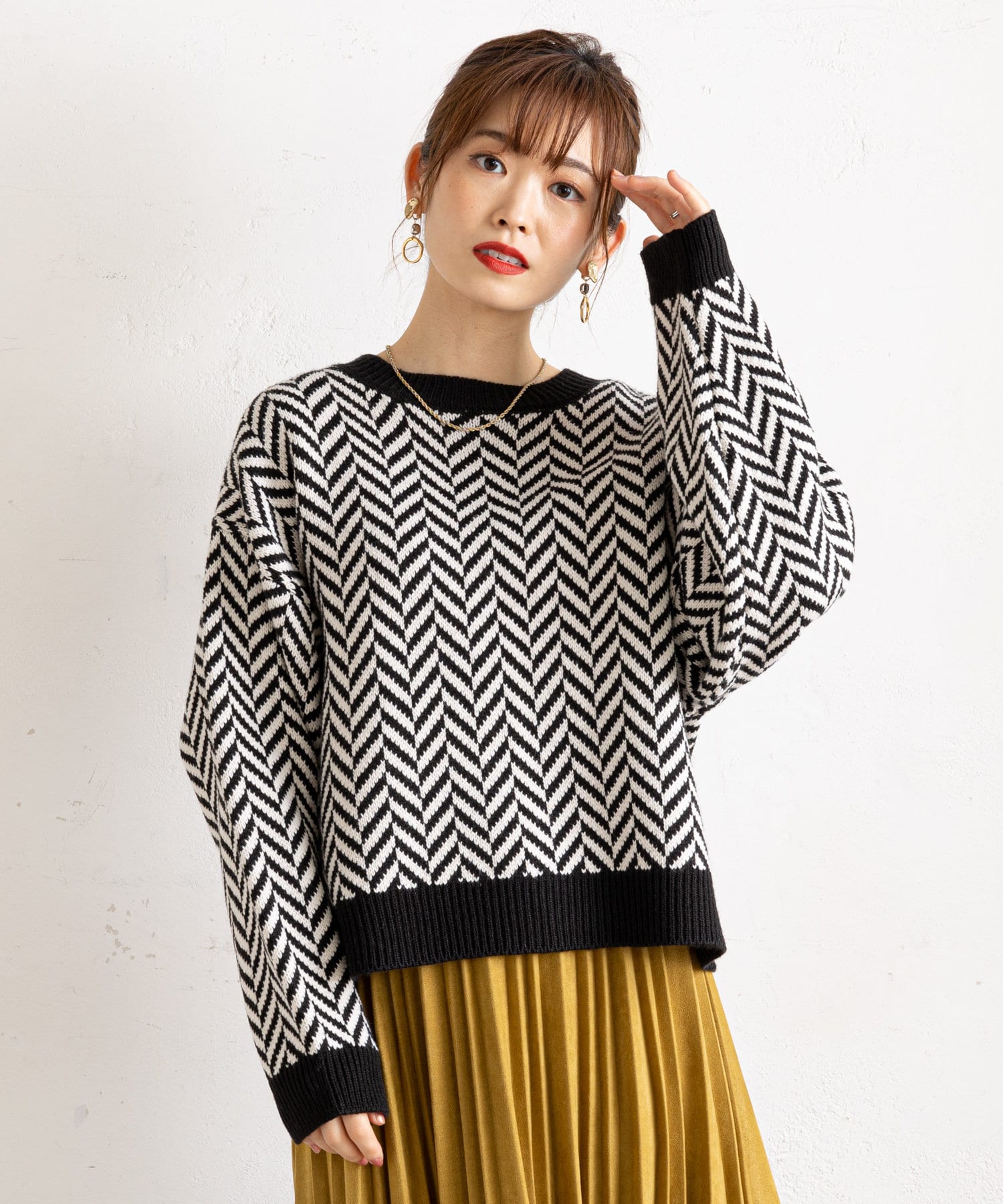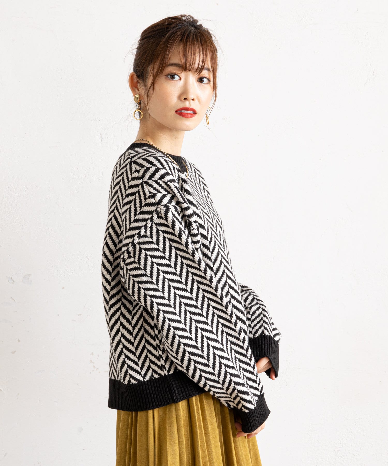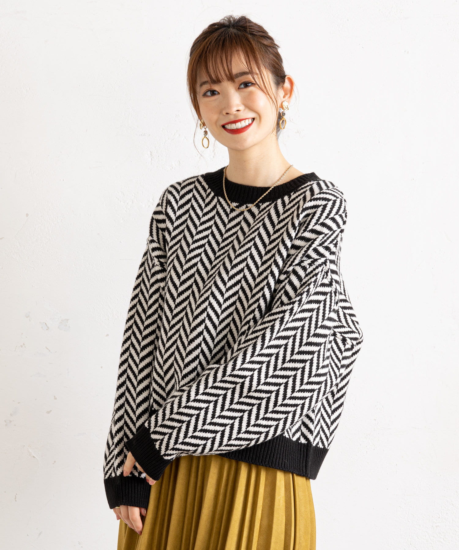 ●ヘリンボーンの総柄デザインがパッと目を引く大人ニット