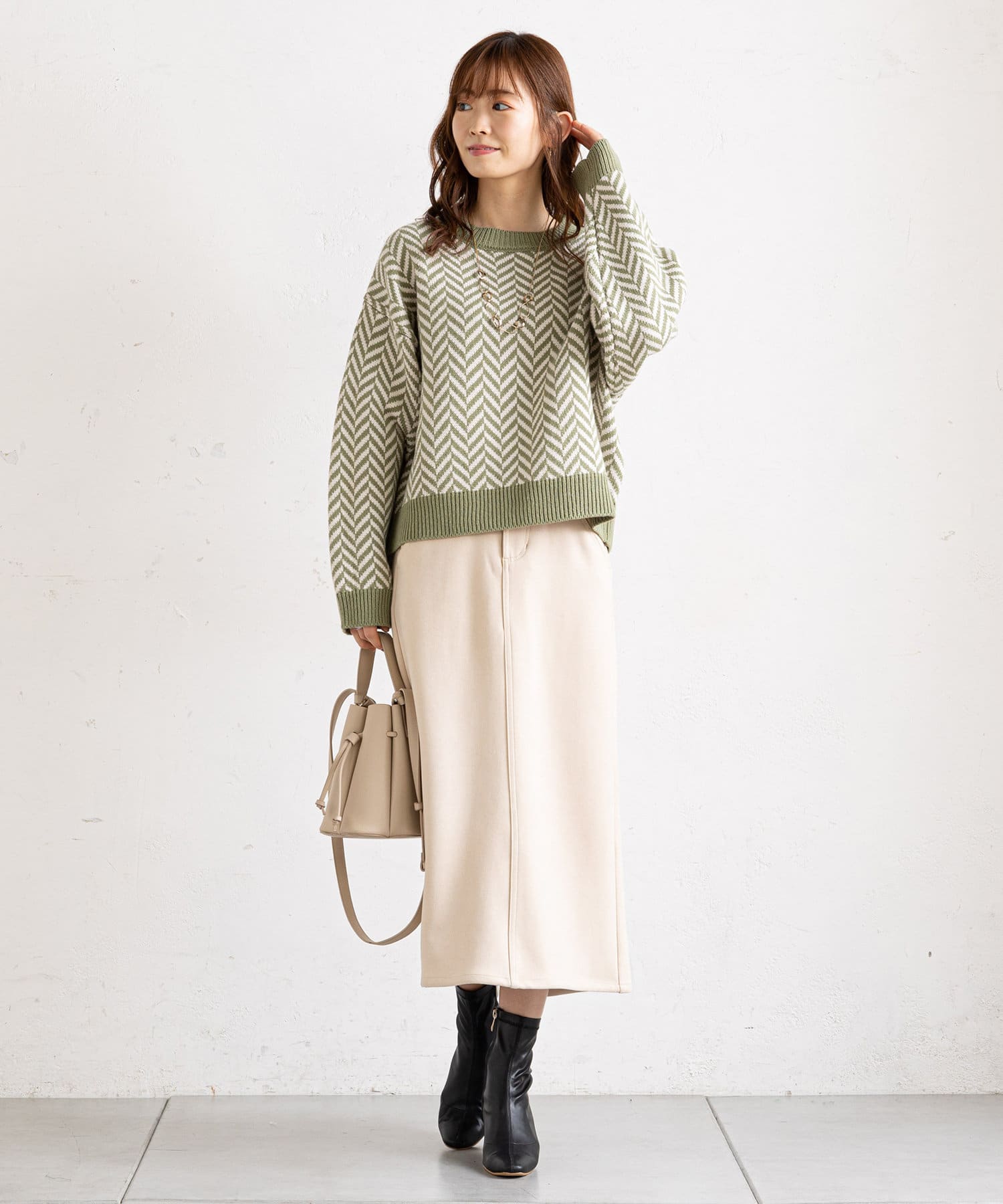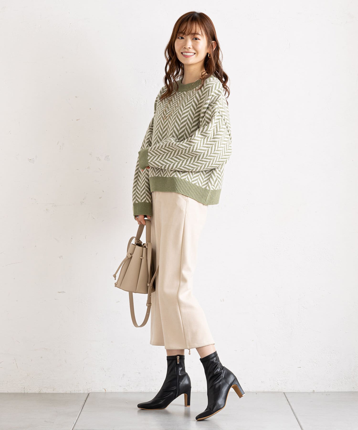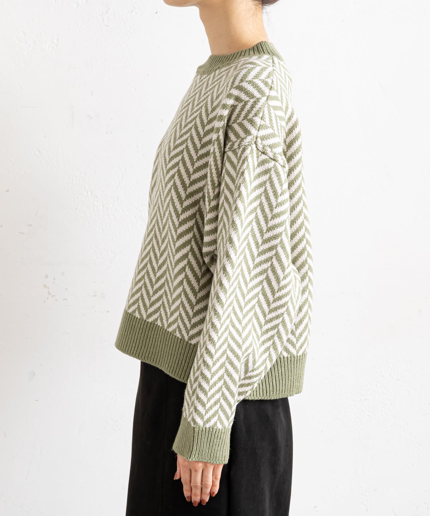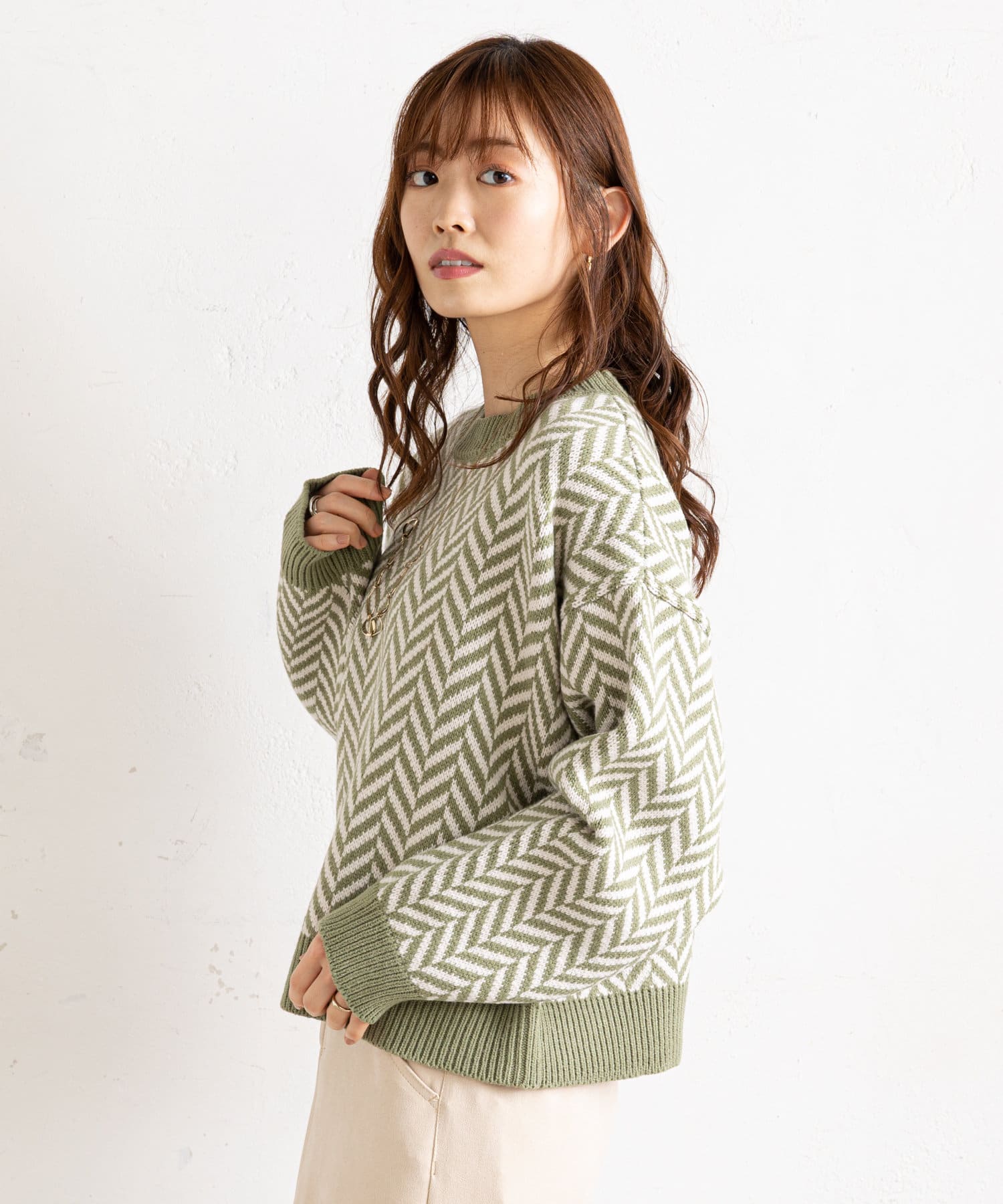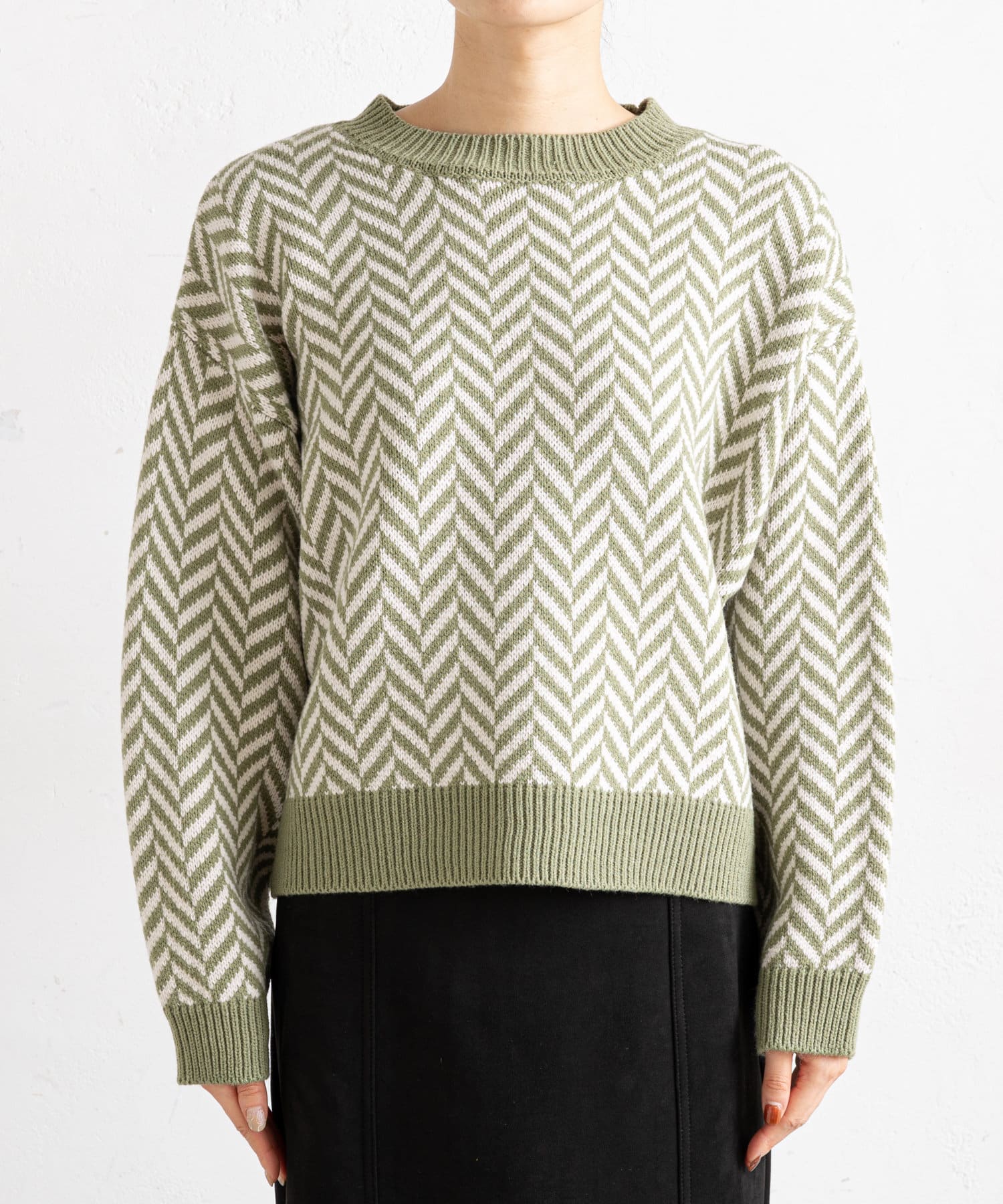 ●ヘリンボーンの総柄デザインがパッと目を引く大人ニット