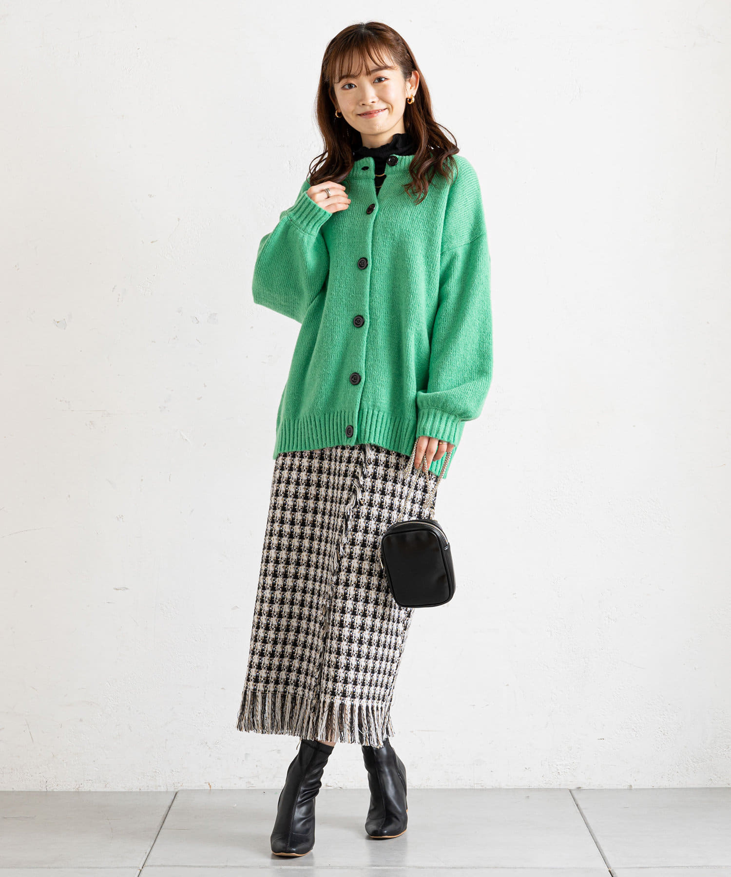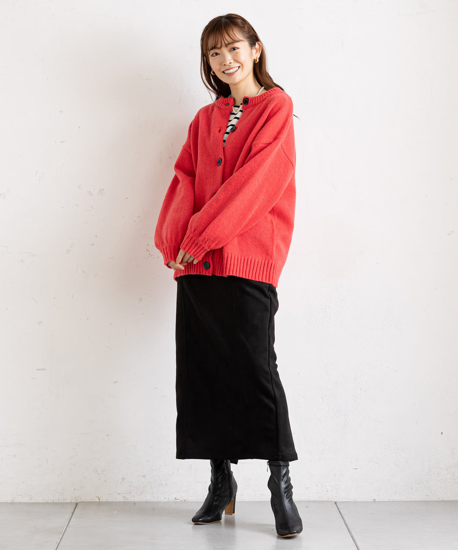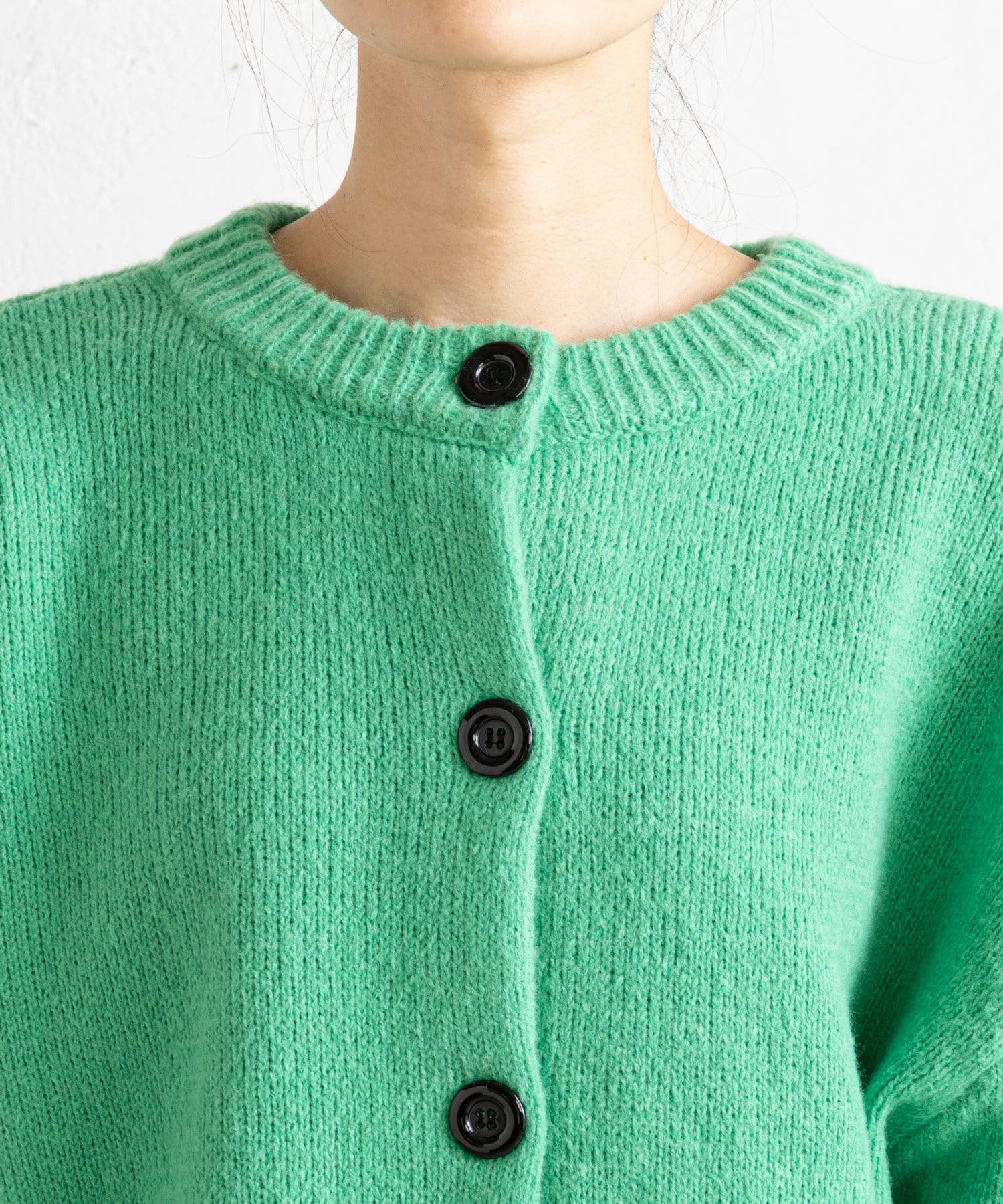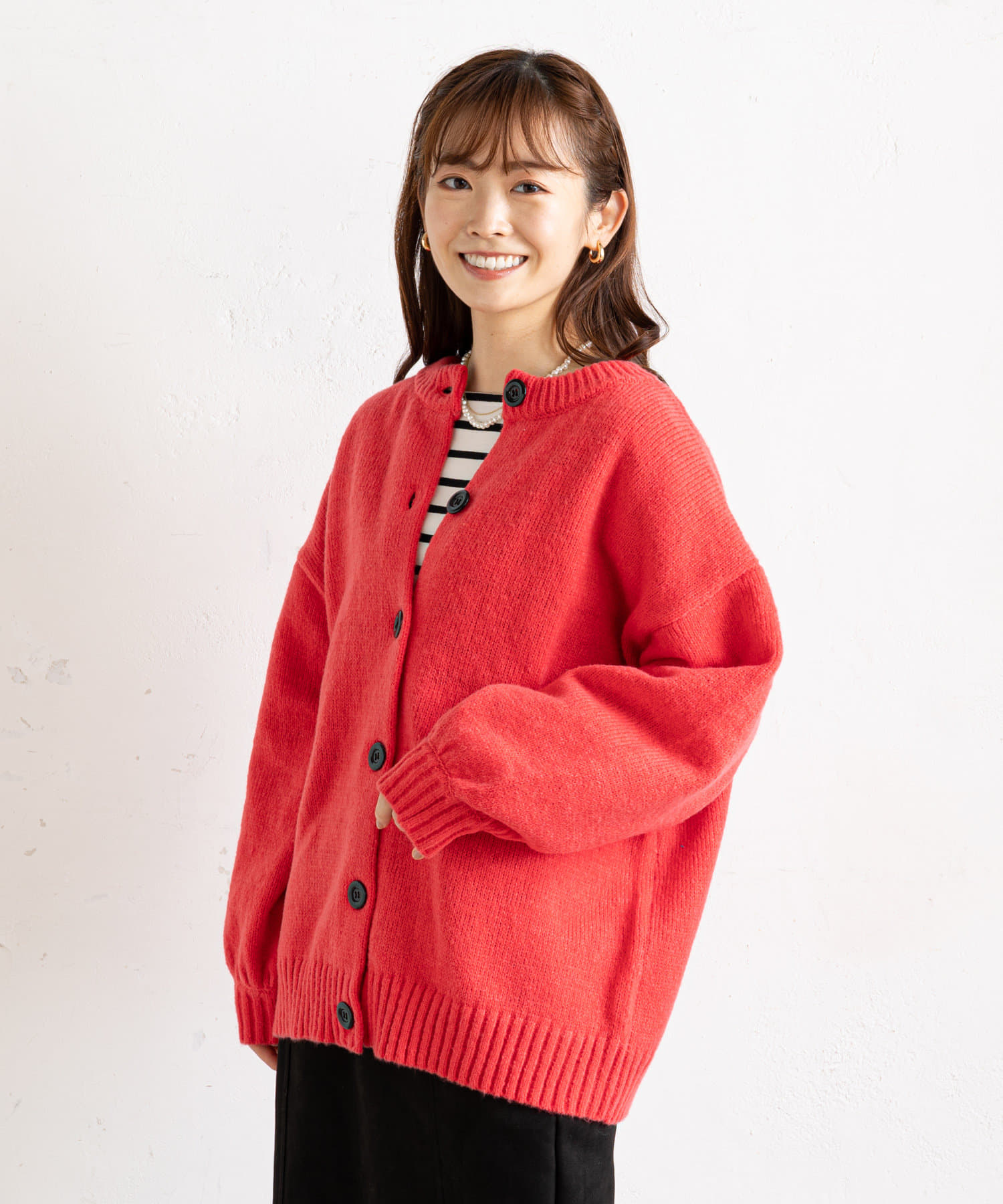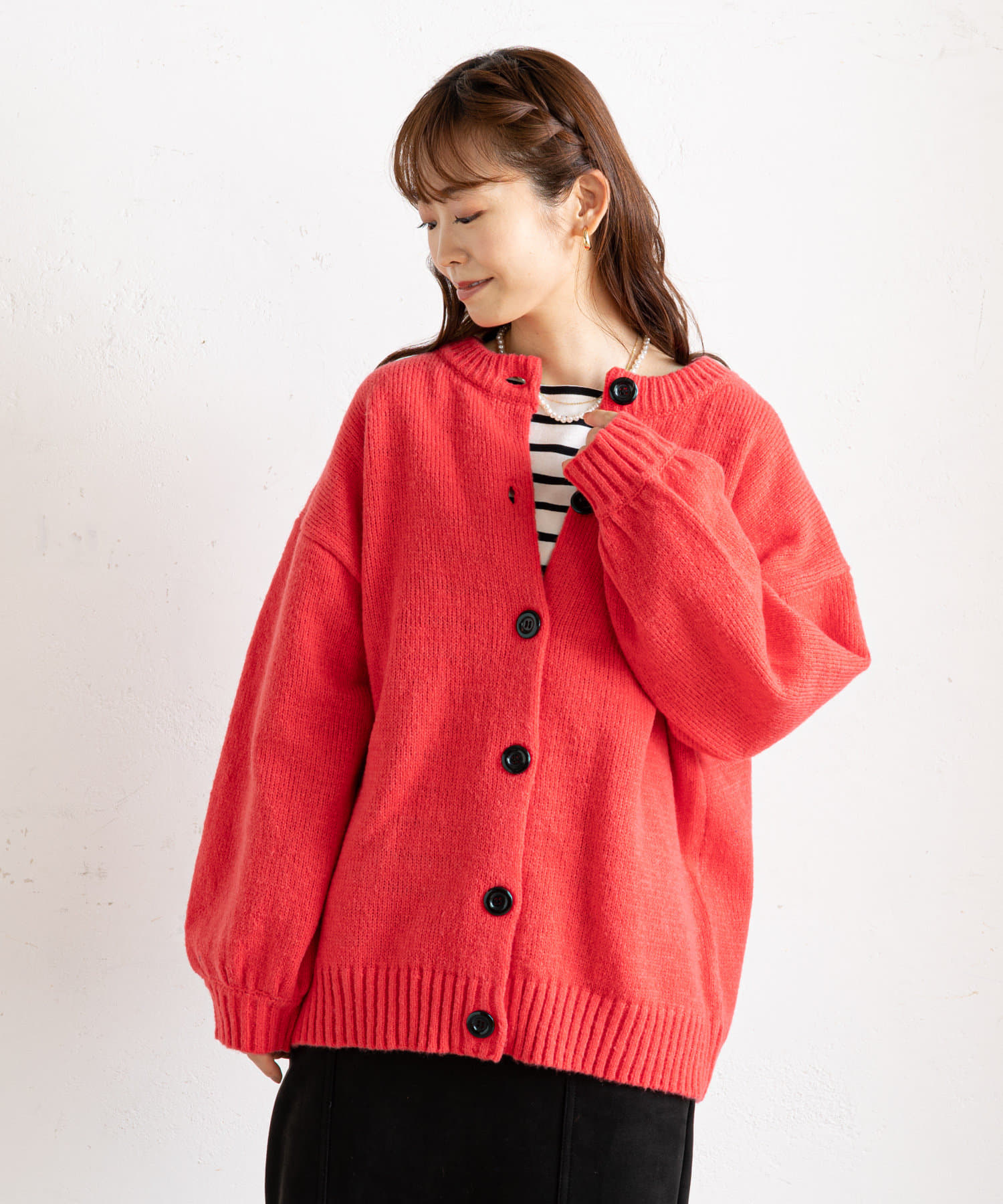 ●ボタンをフロントに持ってきた羽織カーデスタイルに加え、