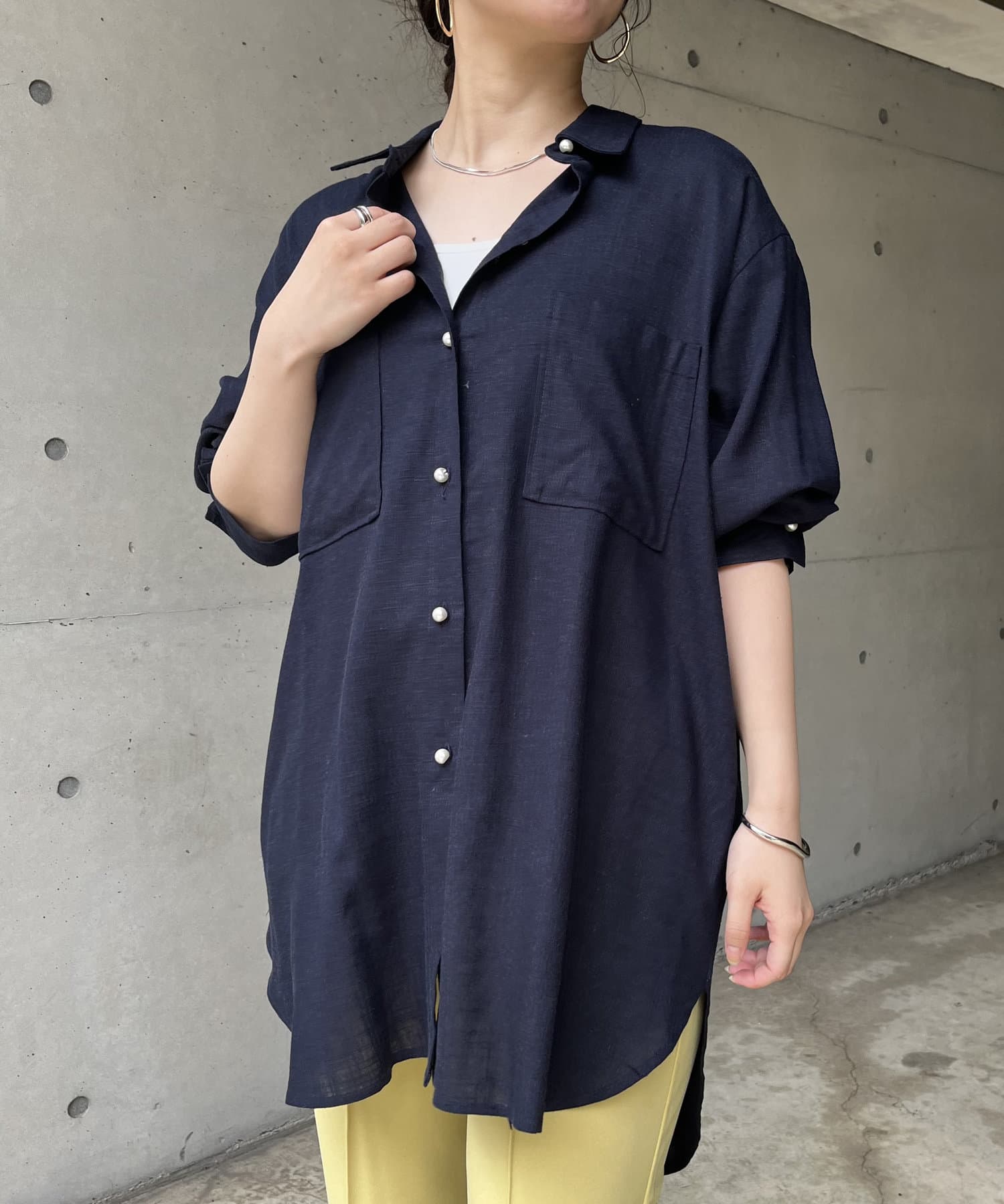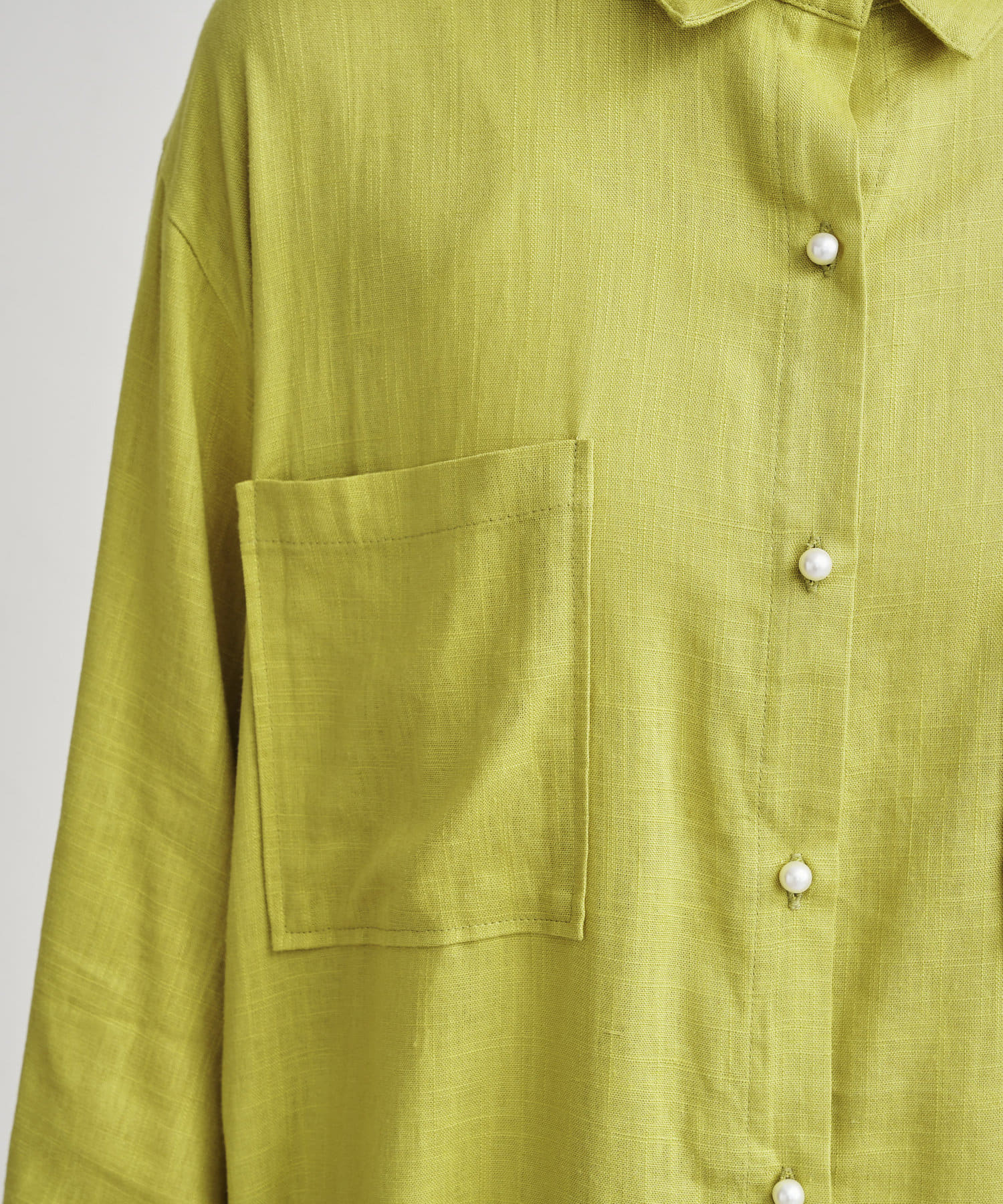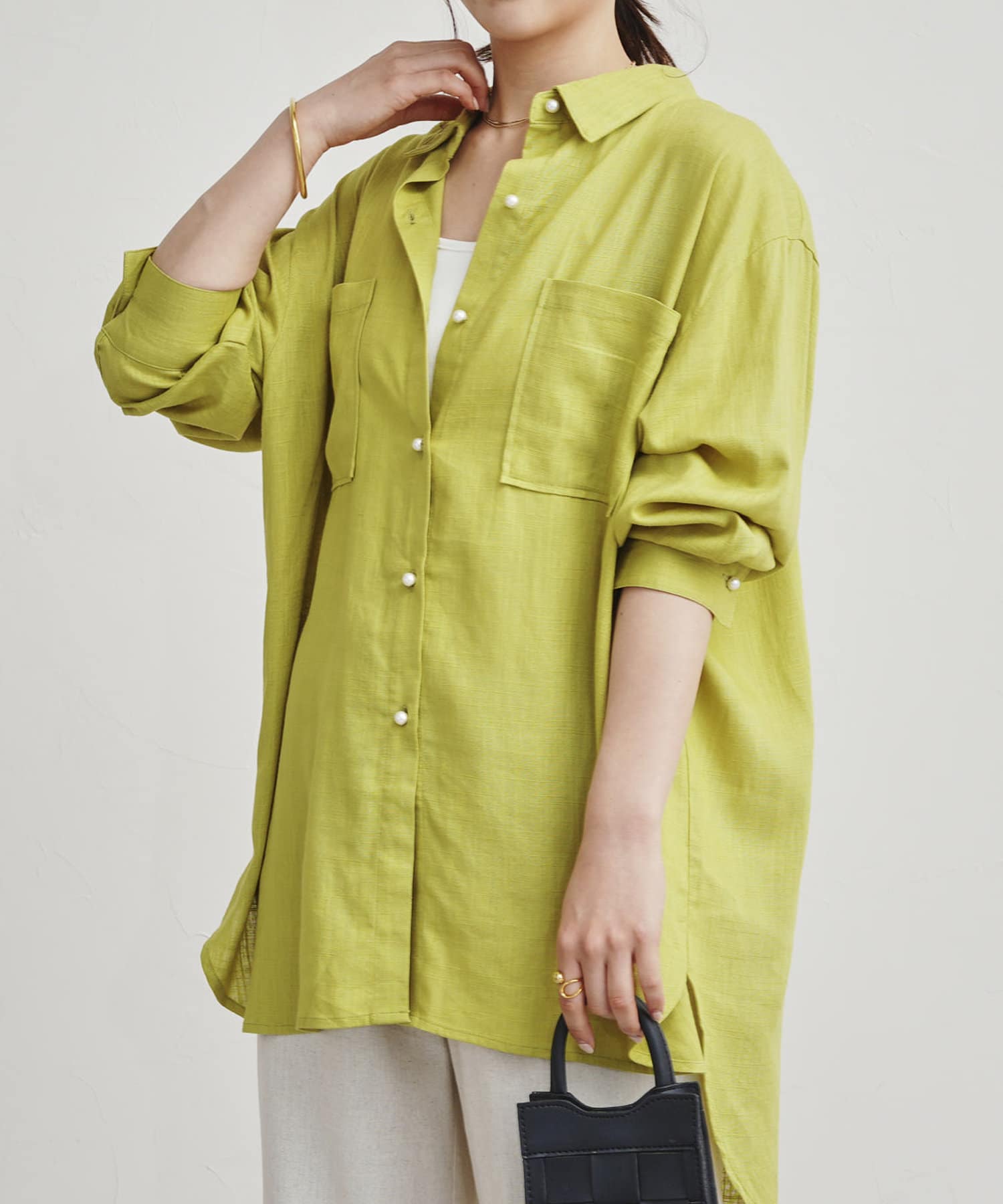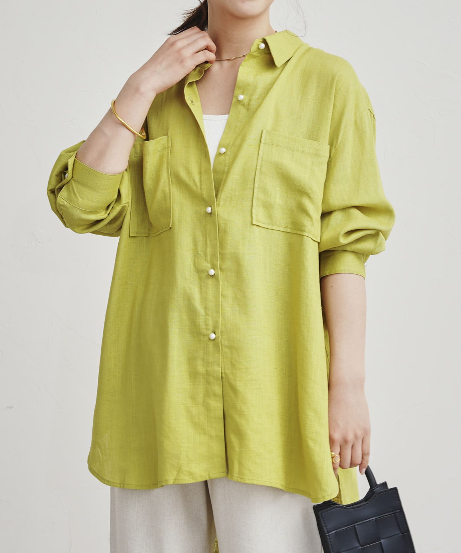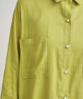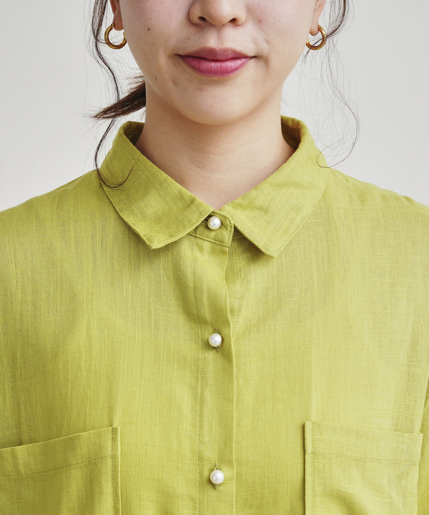 パールボタン×リネン混オーバーシャツ