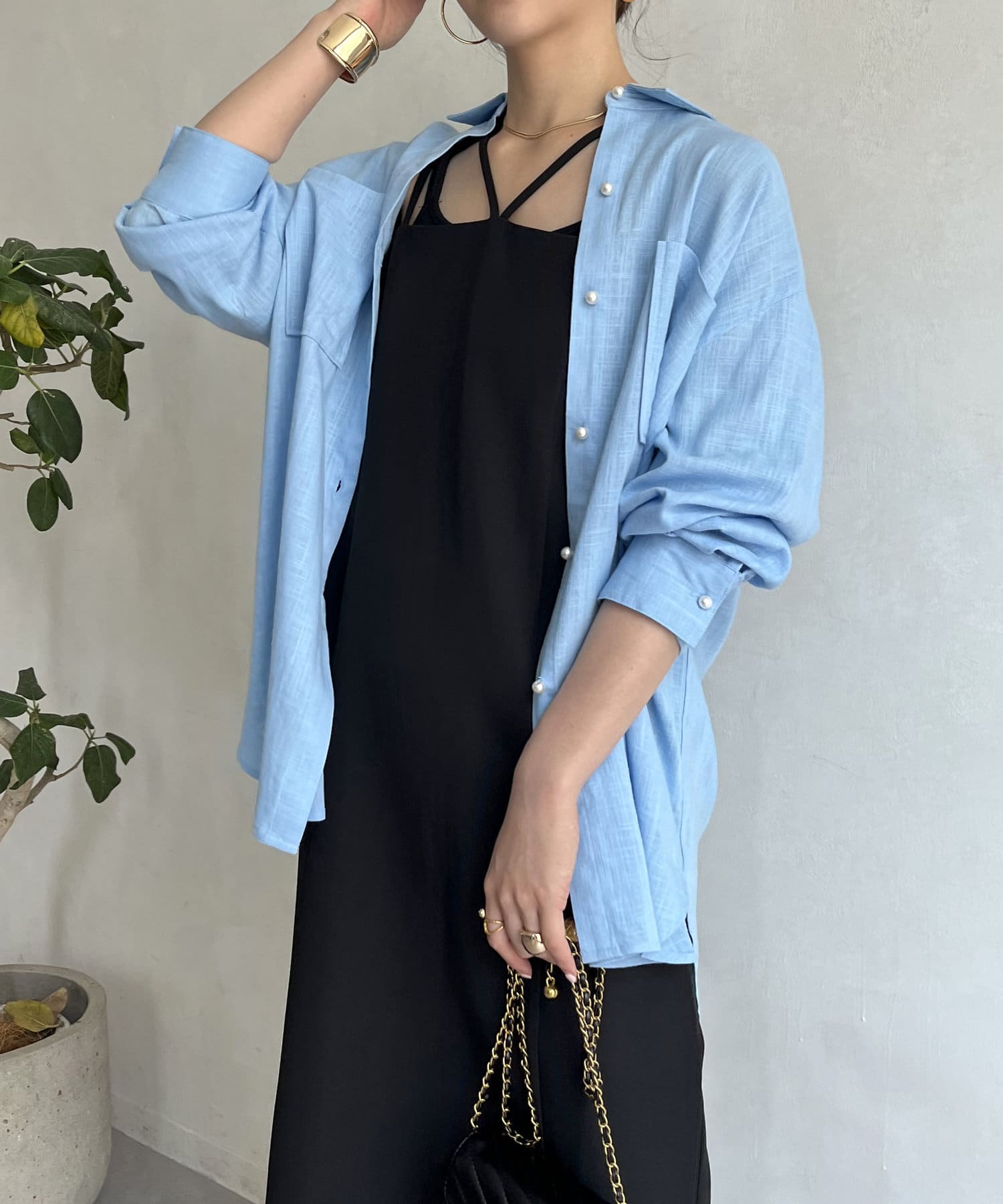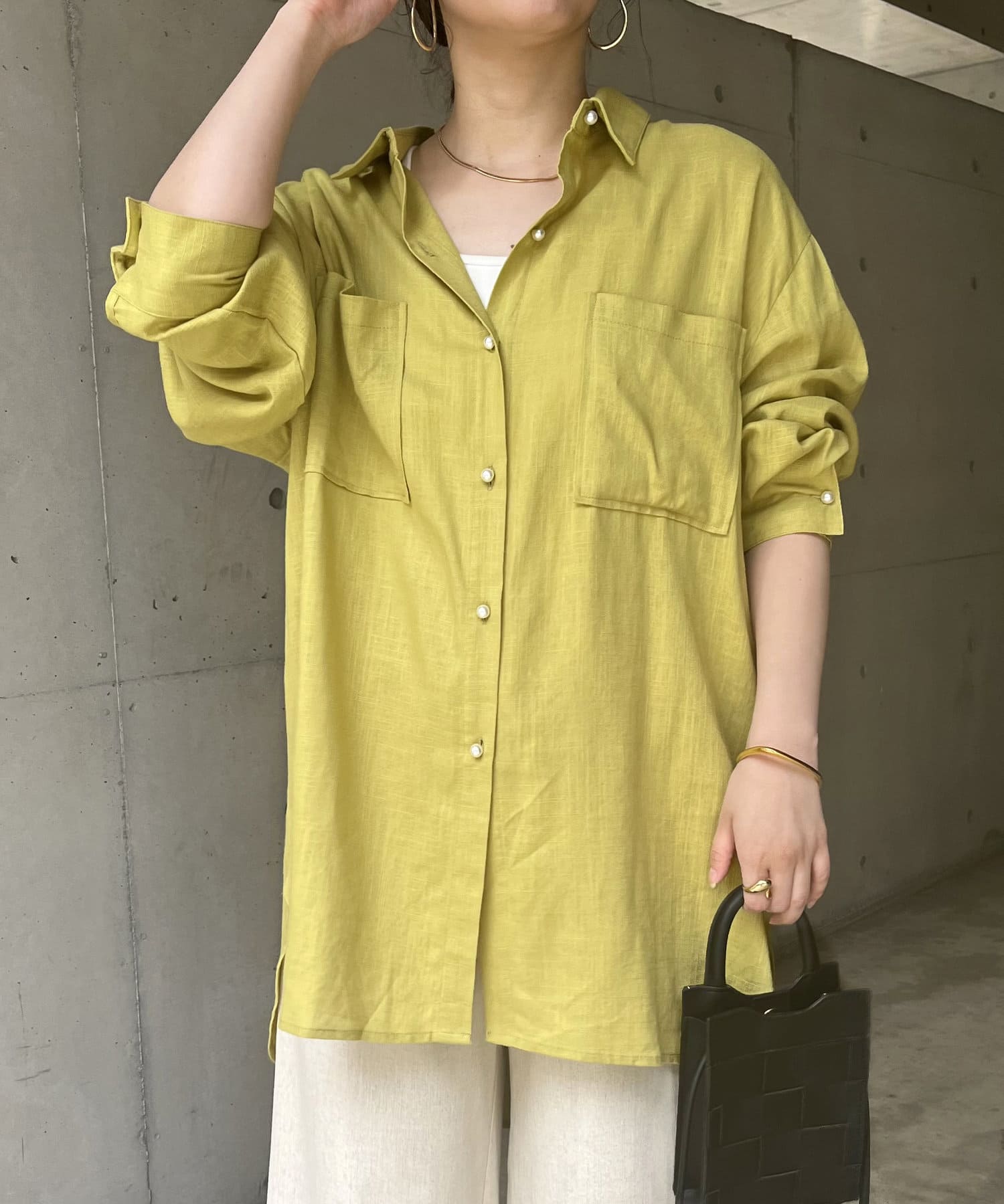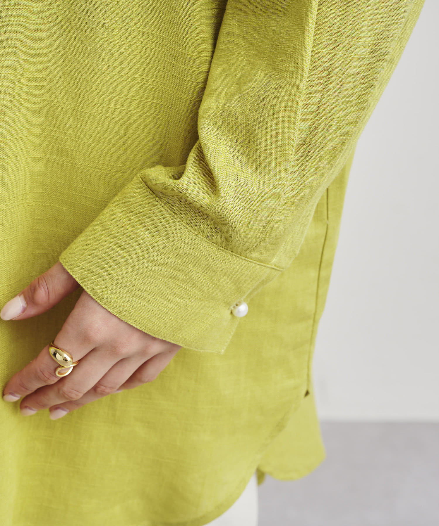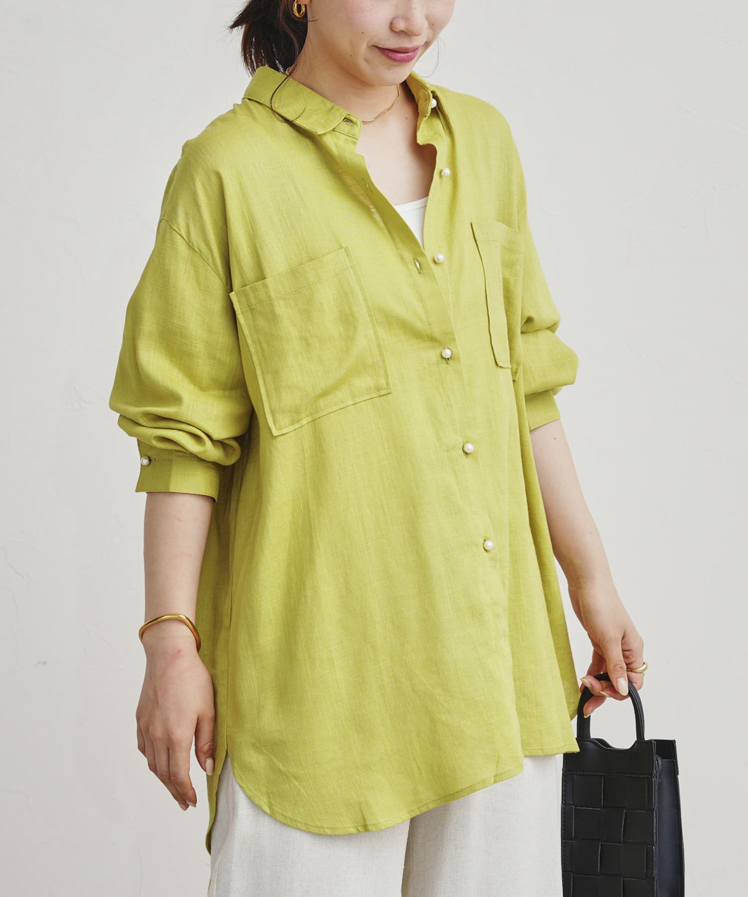 パールボタン×リネン混オーバーシャツ