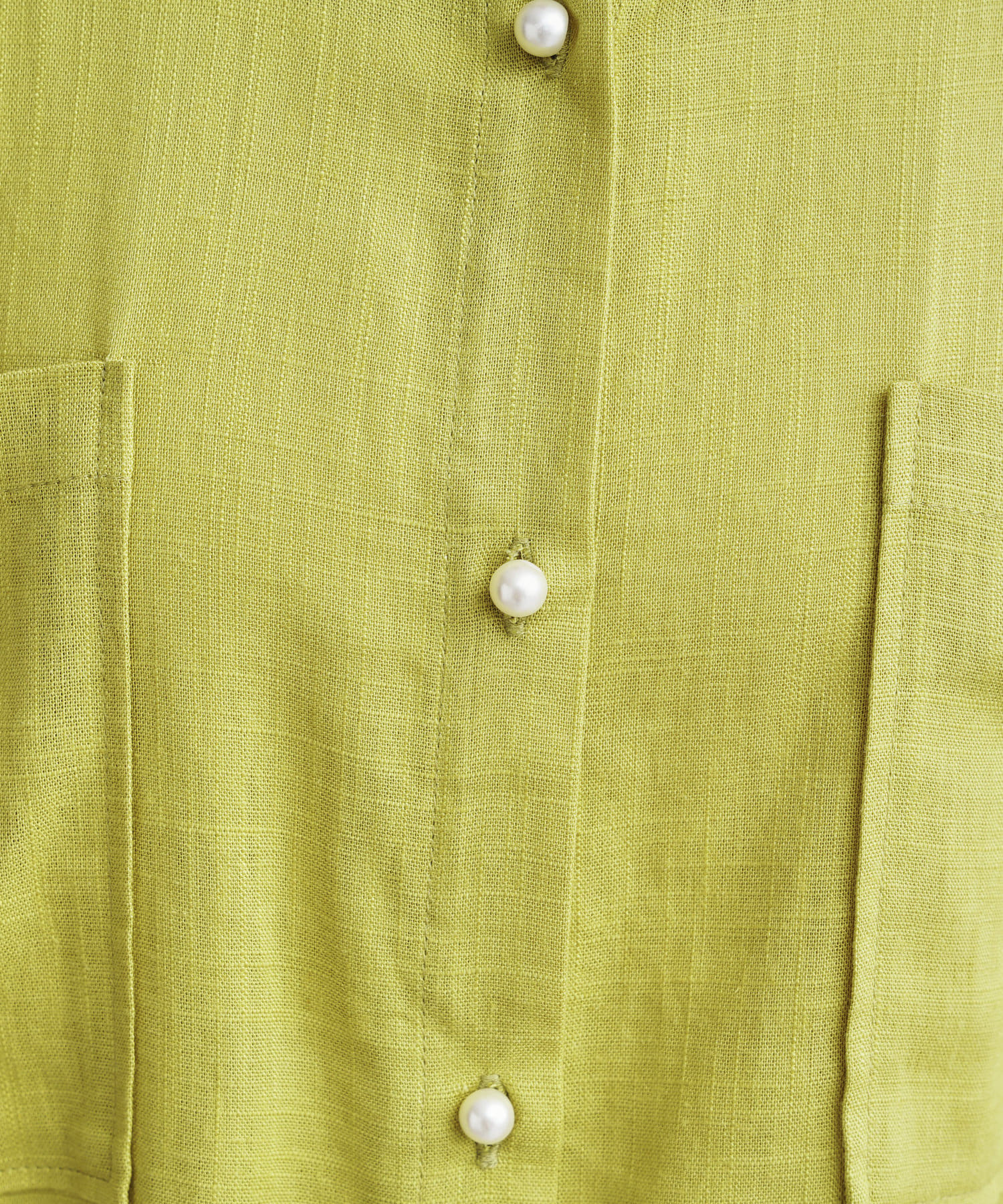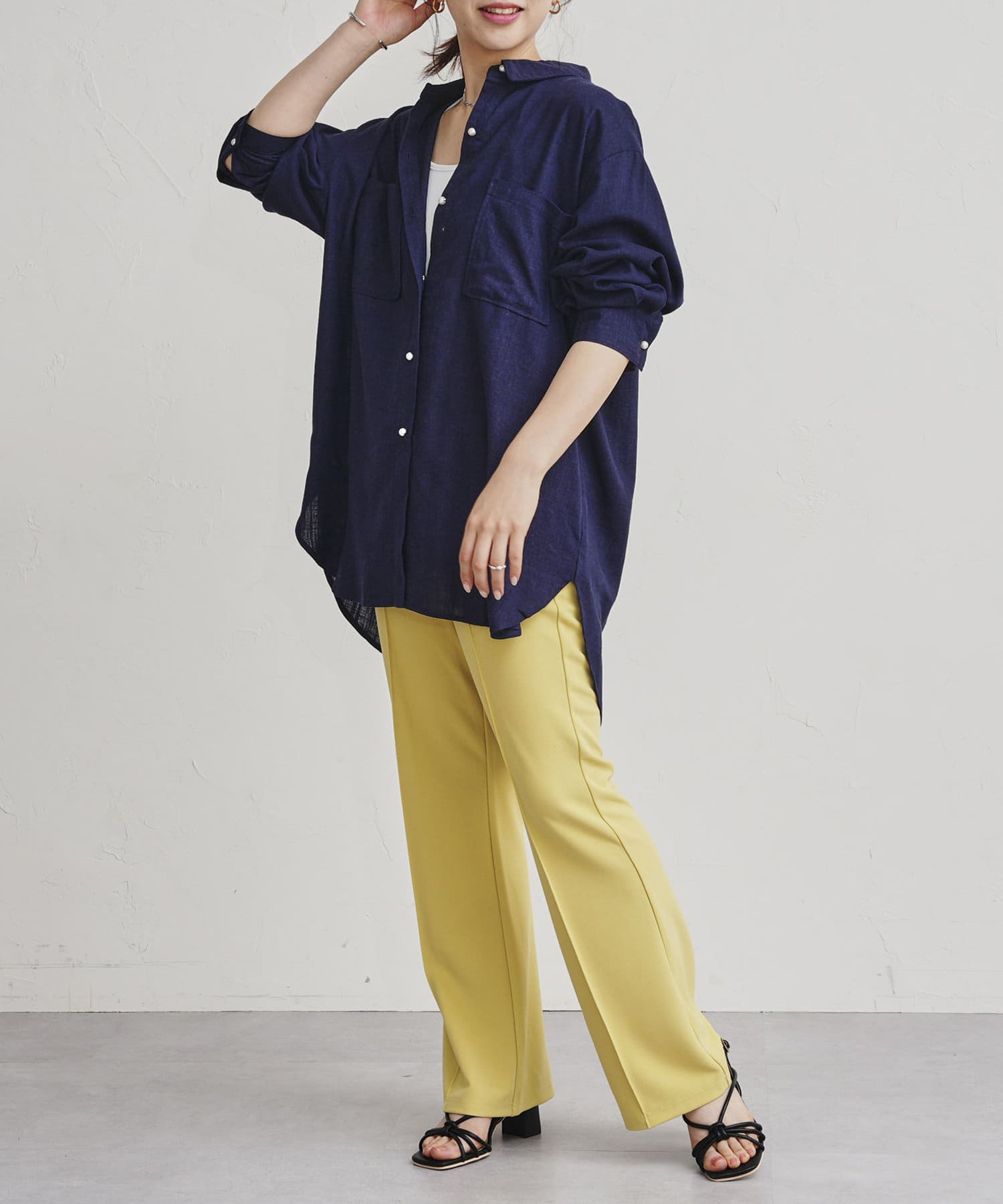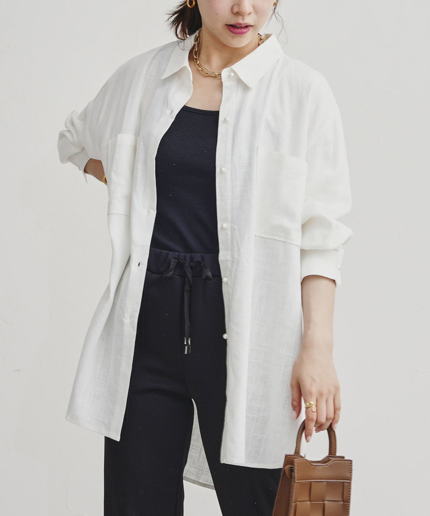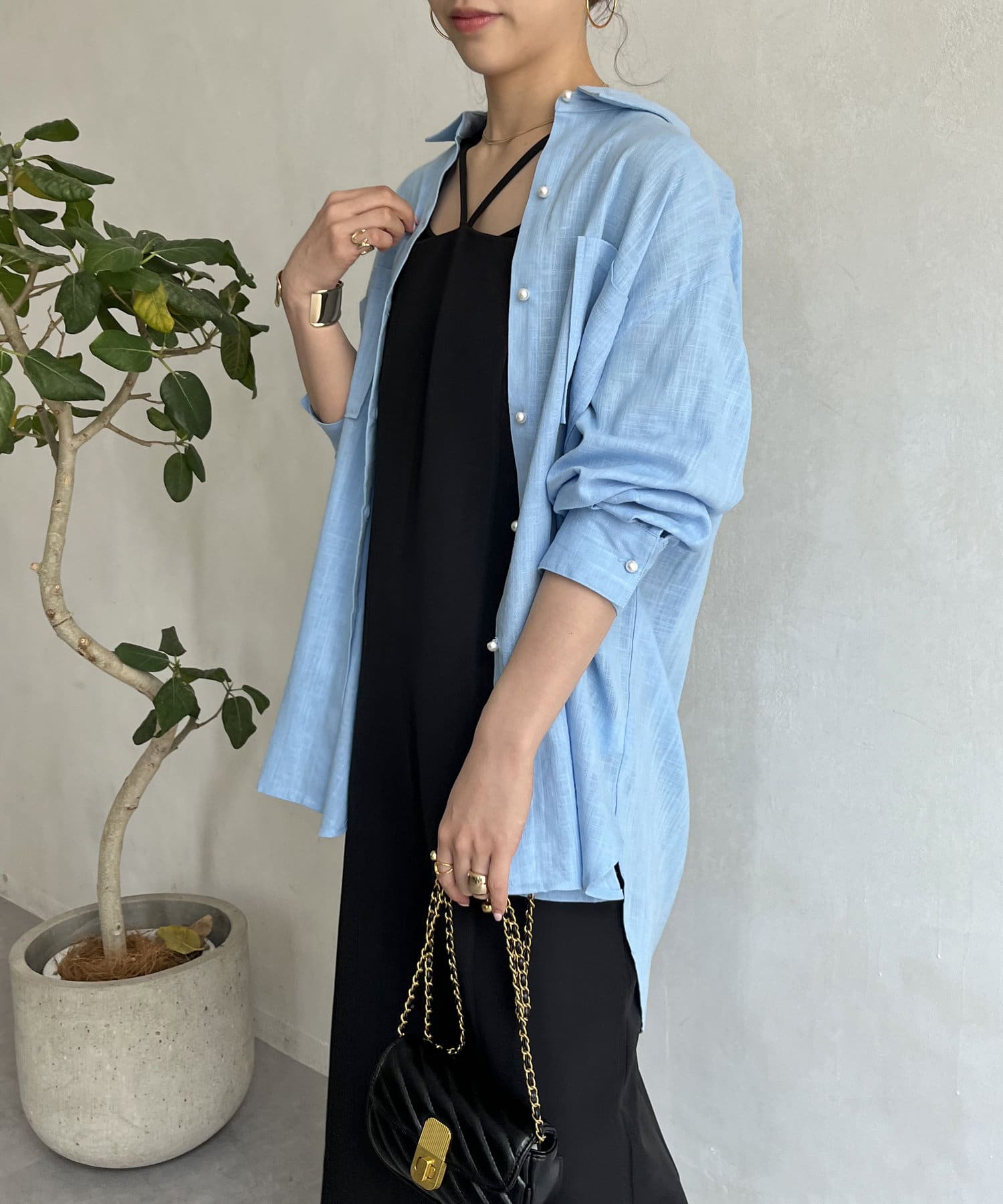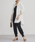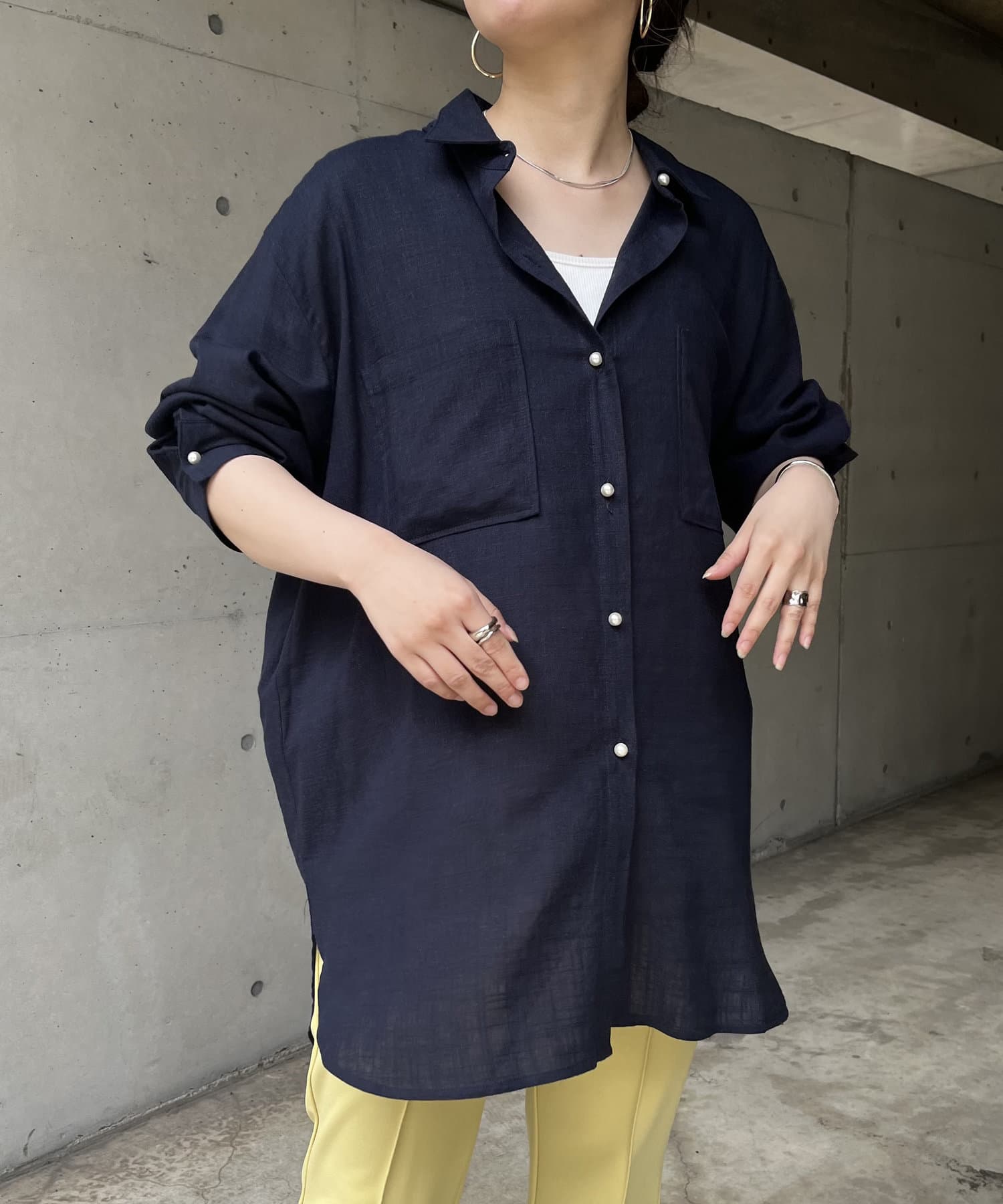 パールボタン×リネン混オーバーシャツ