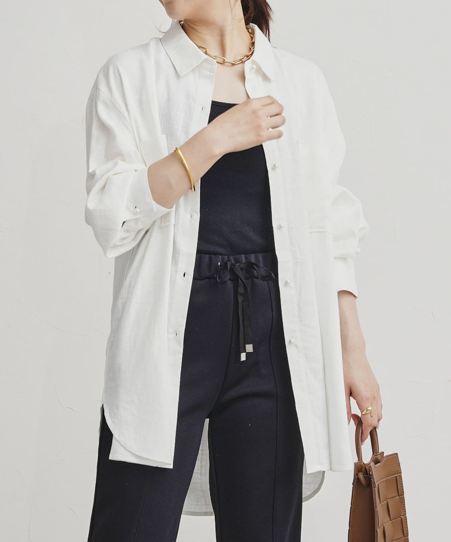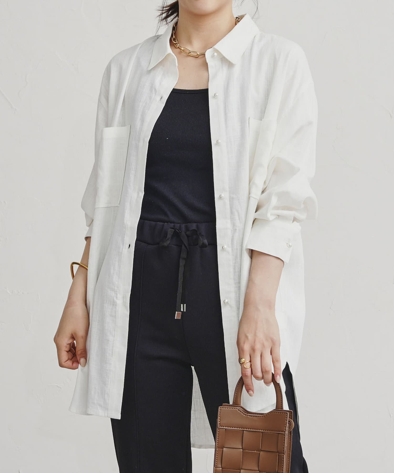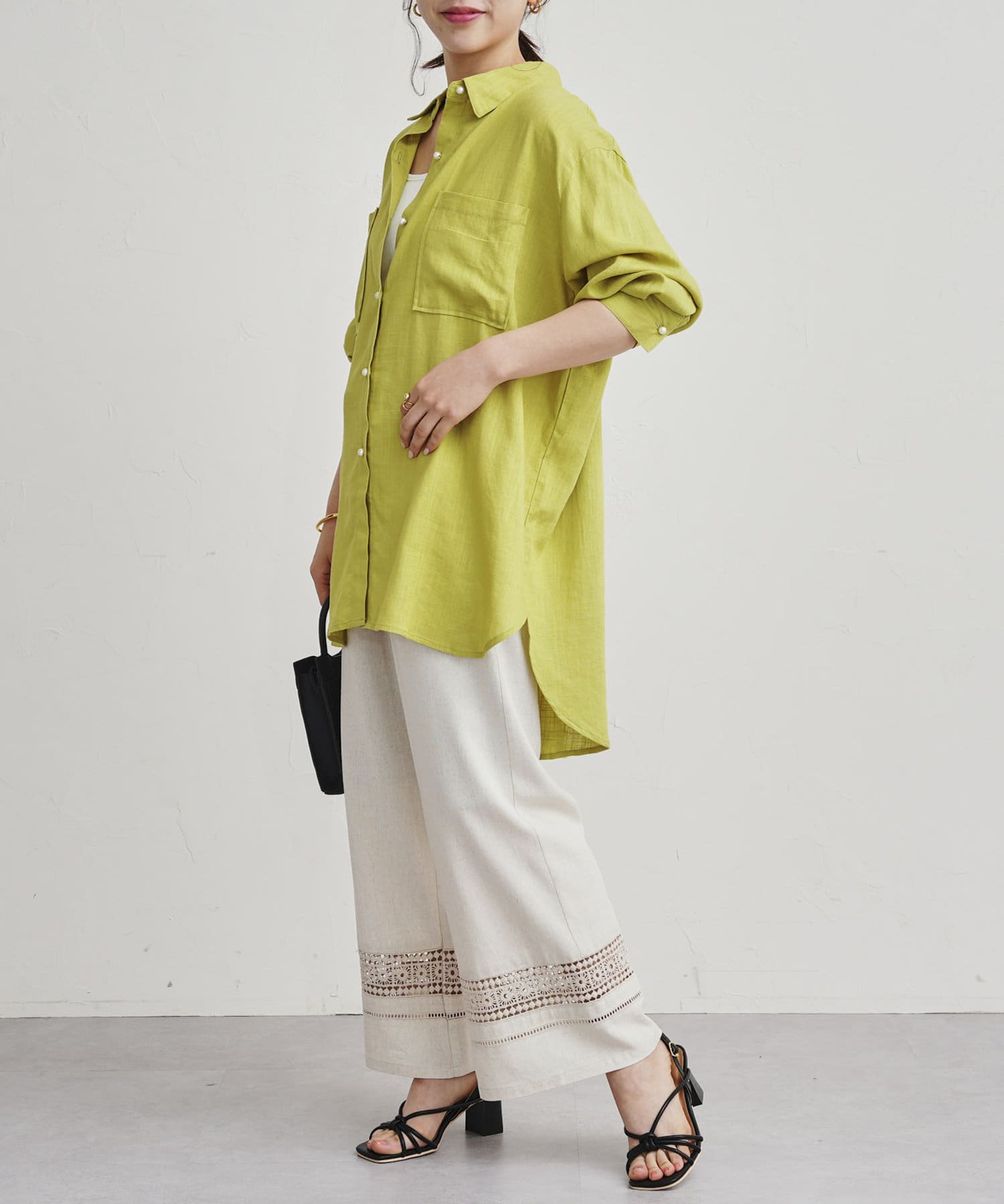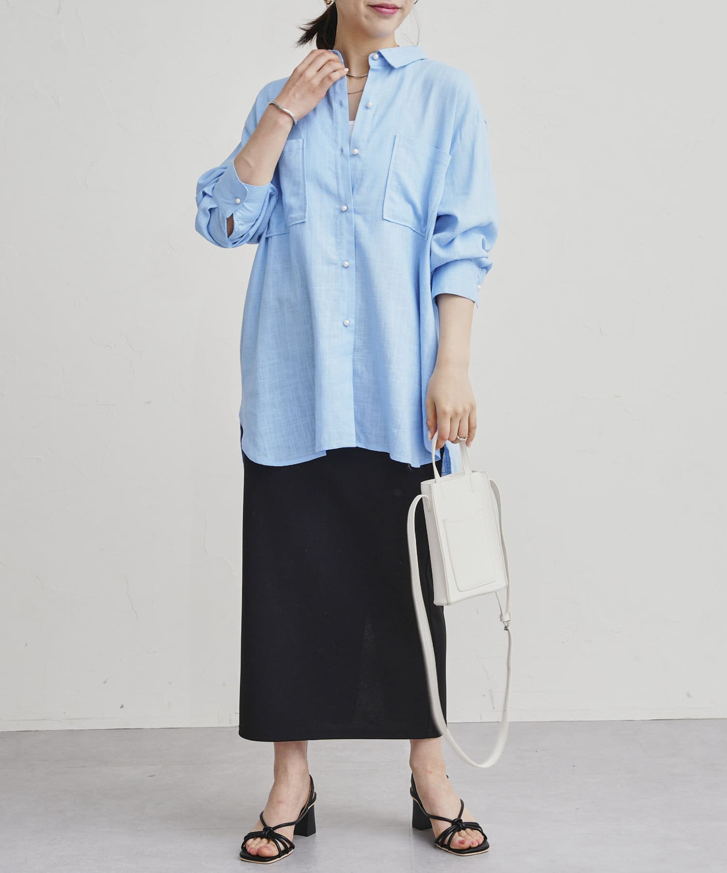 パールボタン×リネン混オーバーシャツ