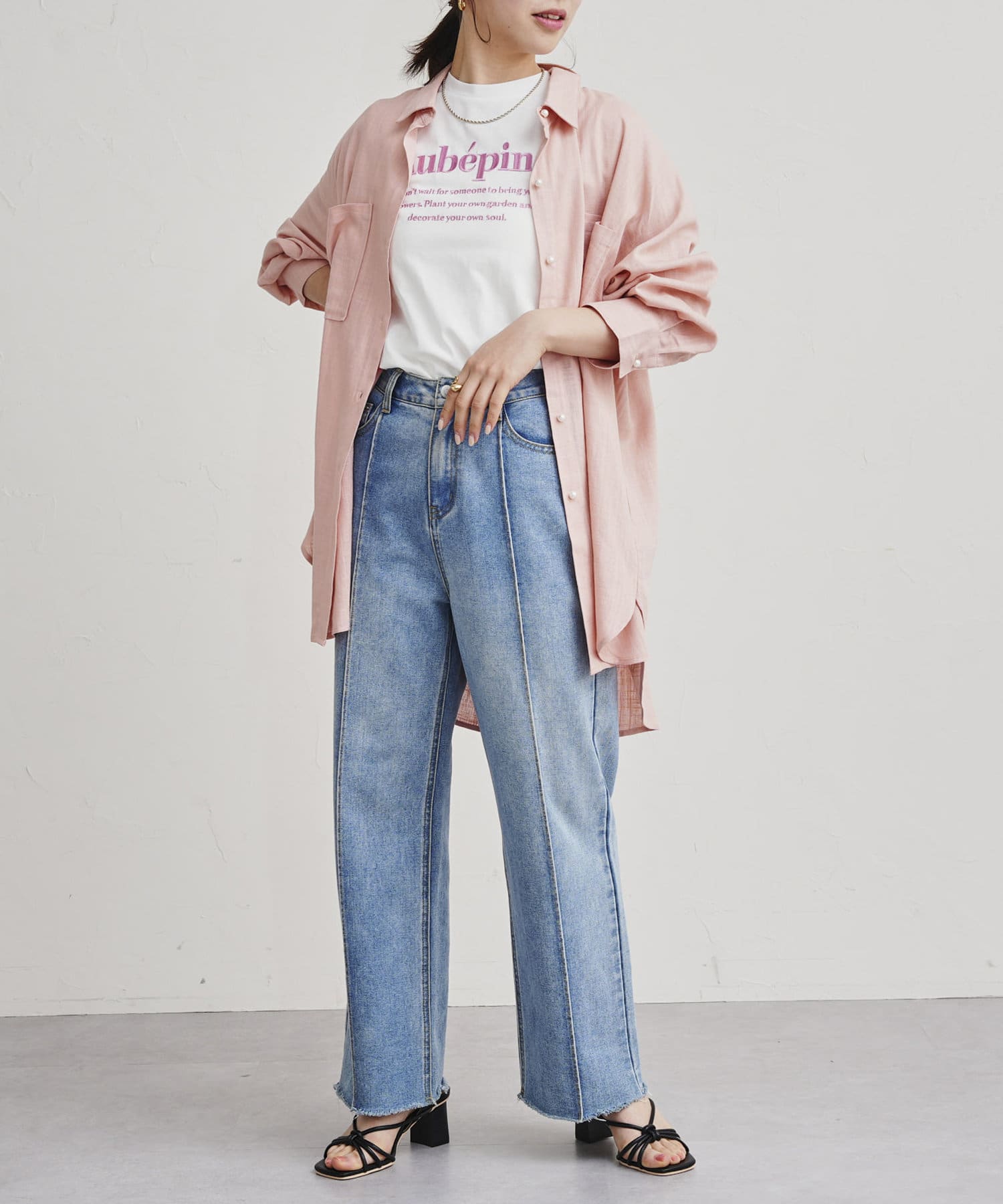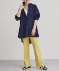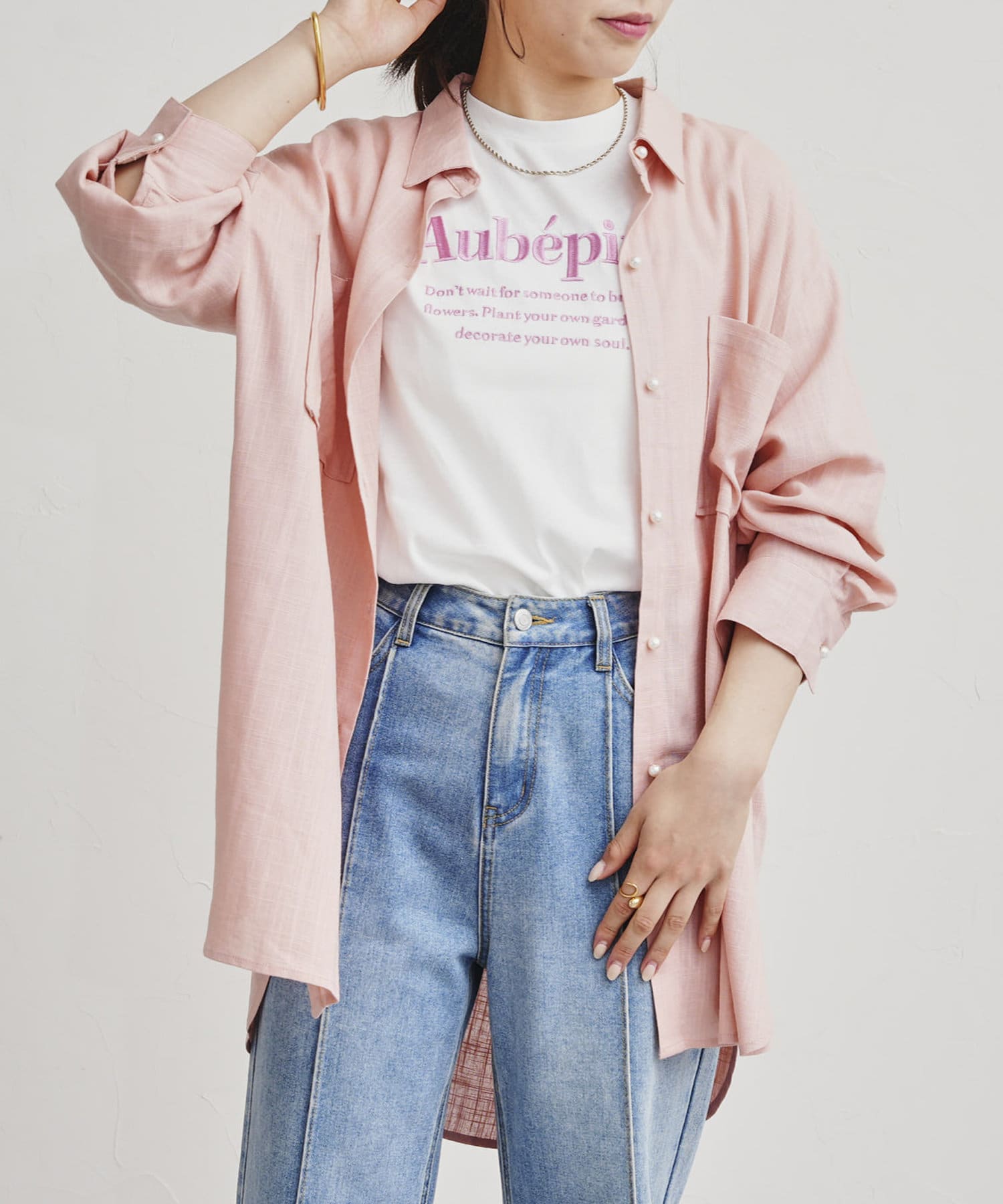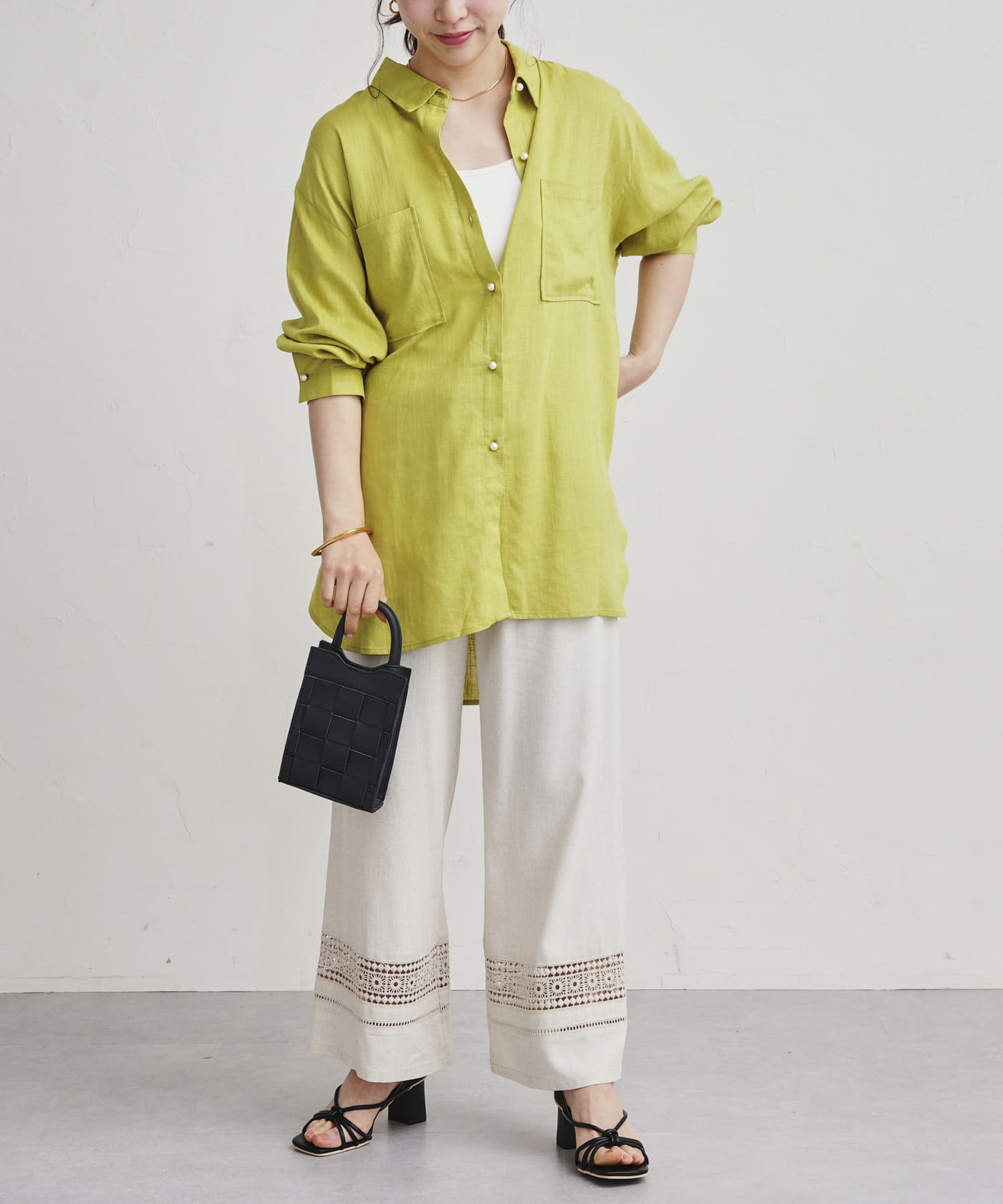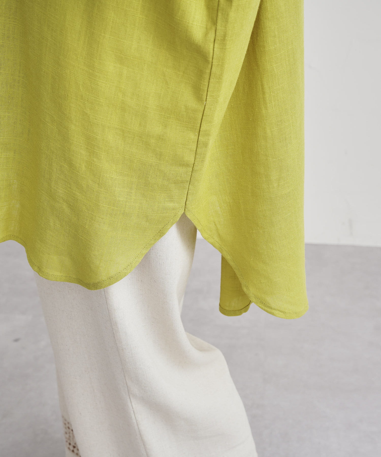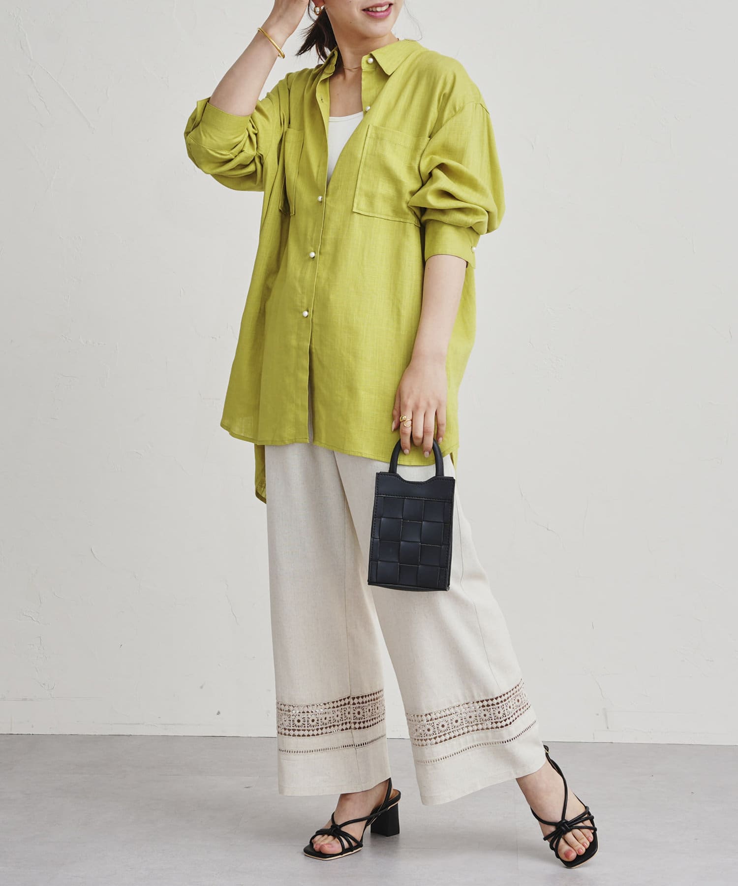 パールボタン×リネン混オーバーシャツ