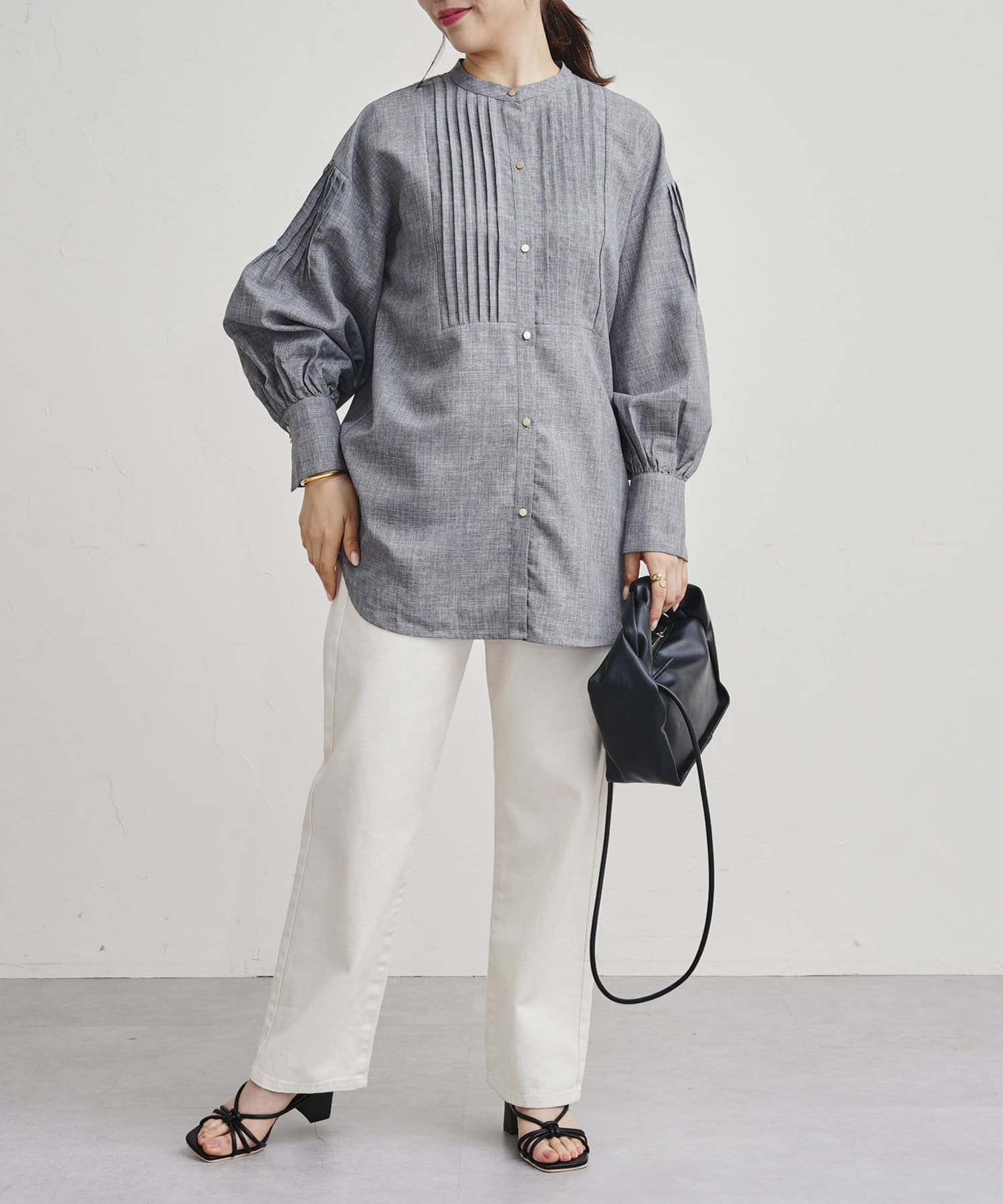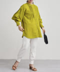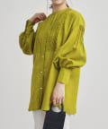 麻調フロントX袖ピンタックデザインブラウス