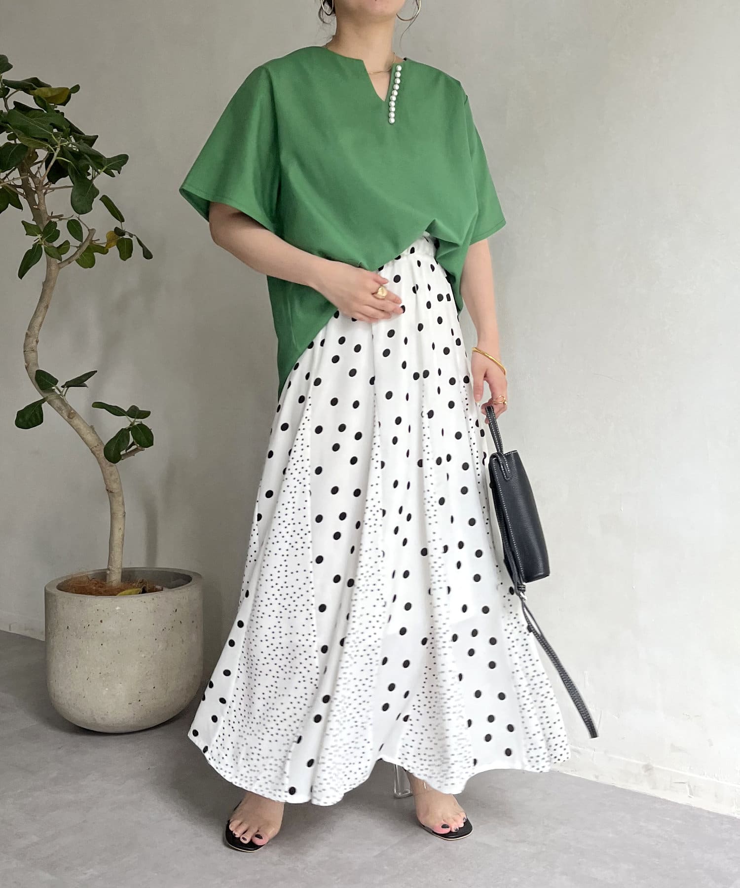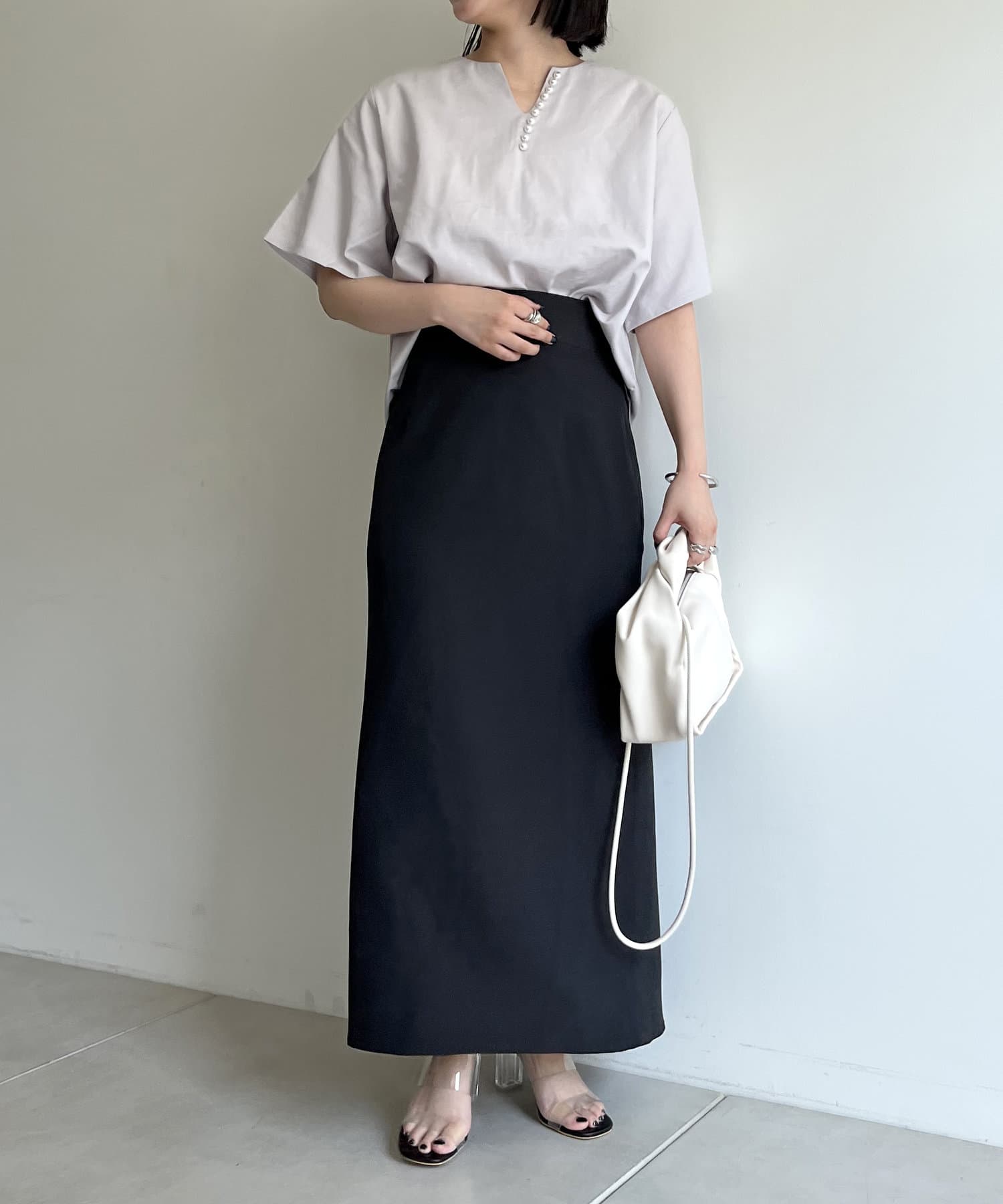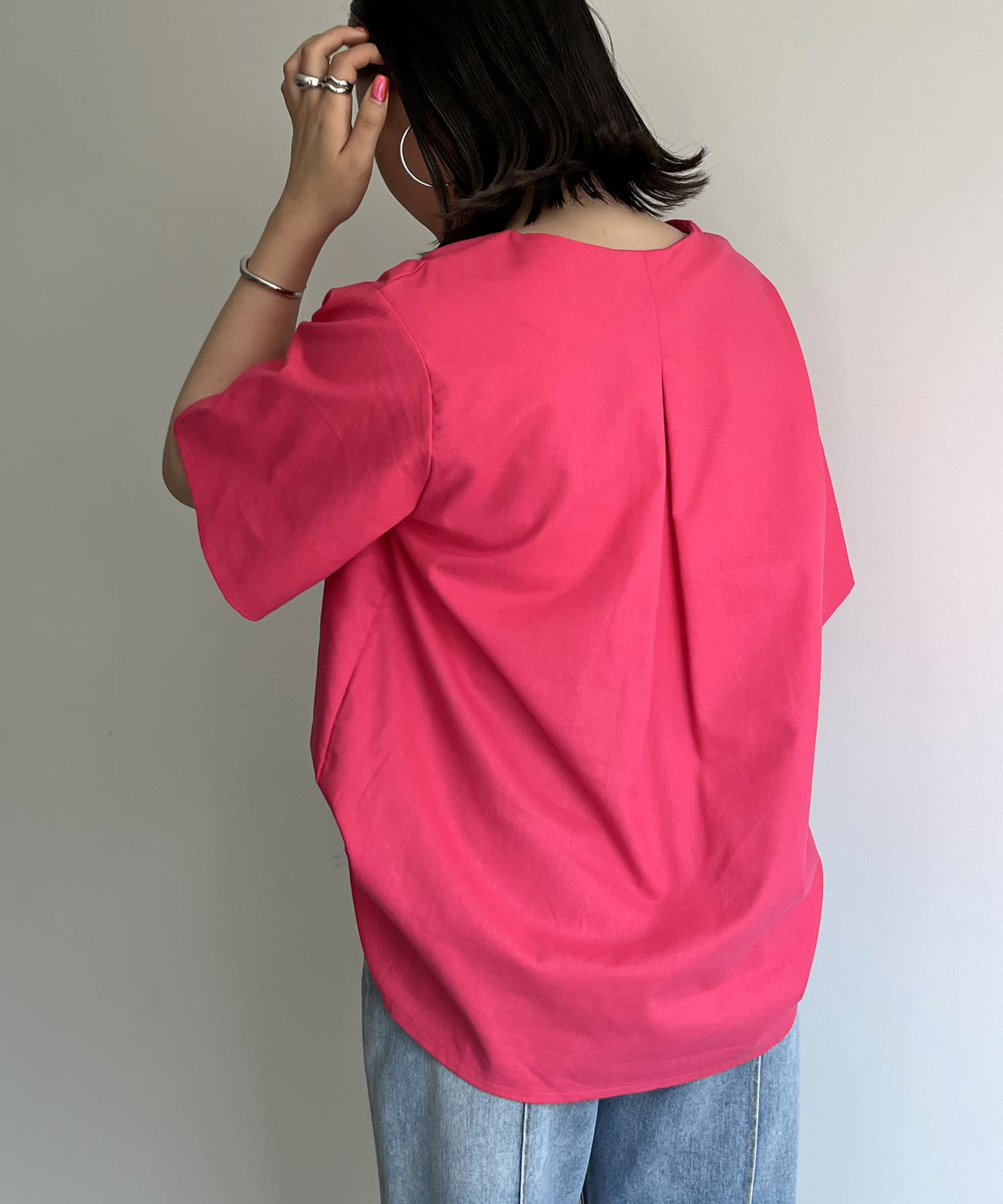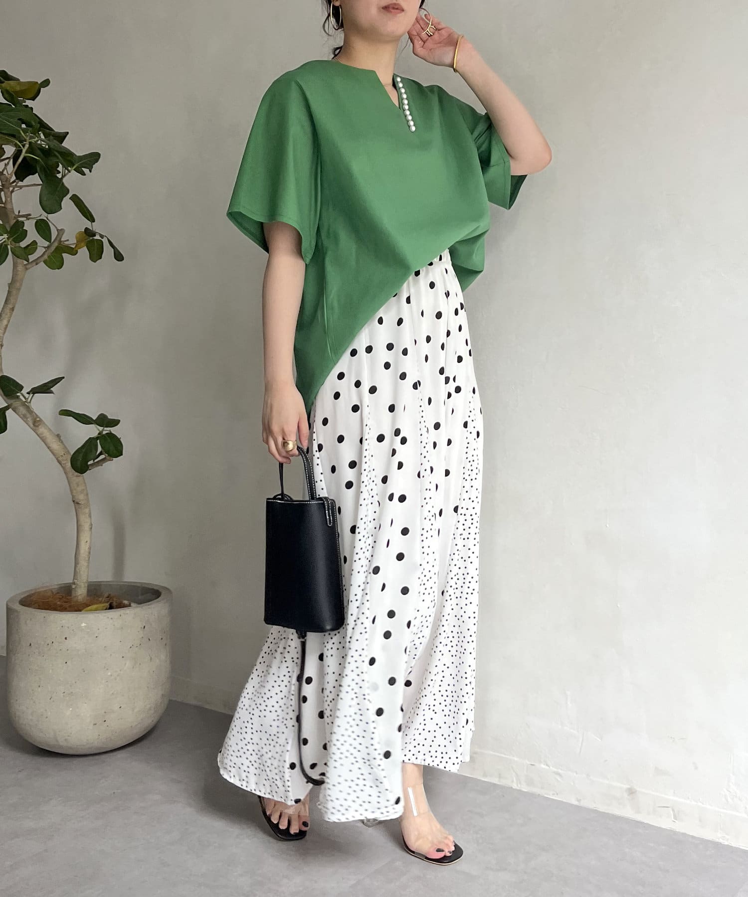 ●チラッと開いたキーネックが首元にほど良い抜け感を与えます