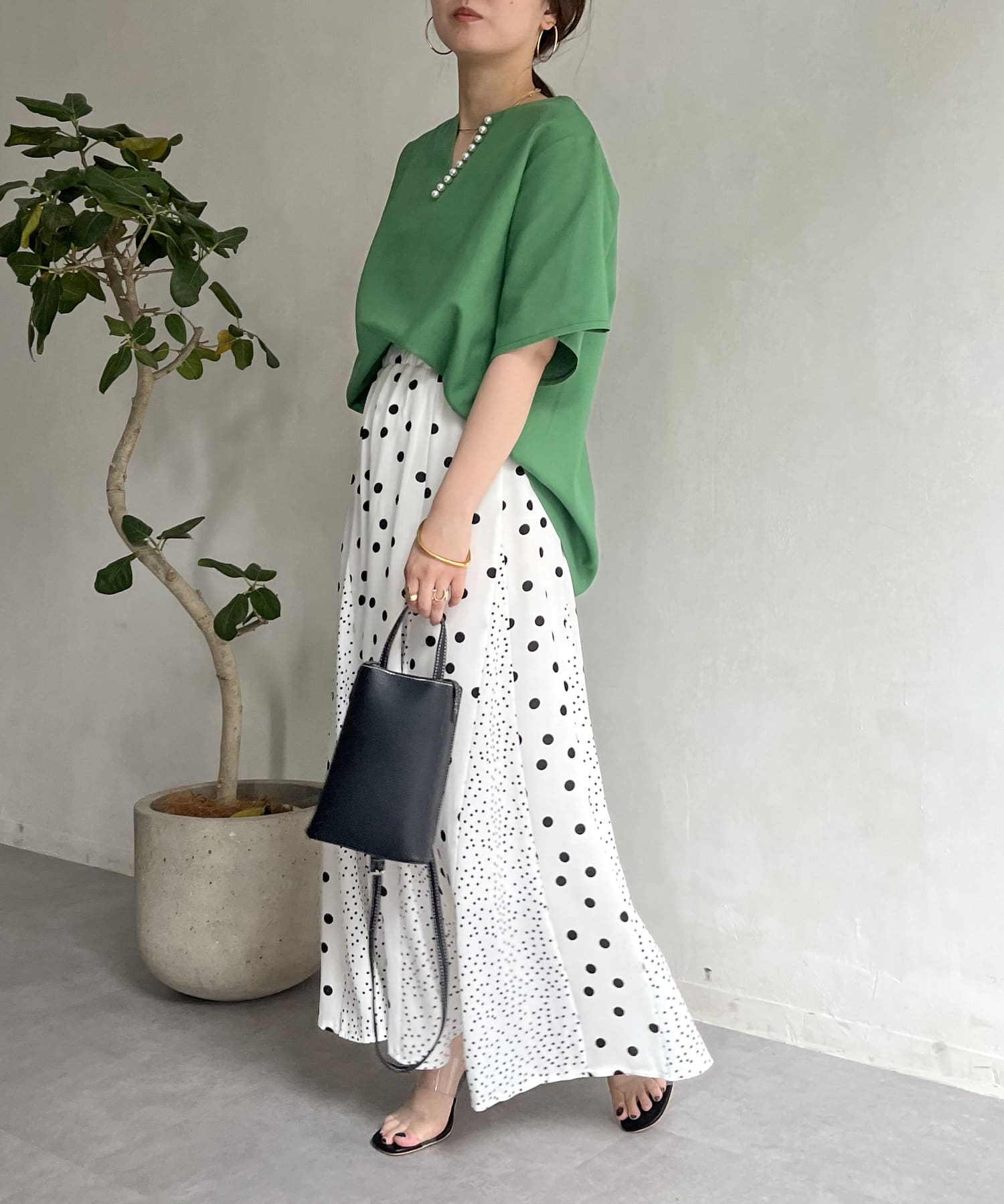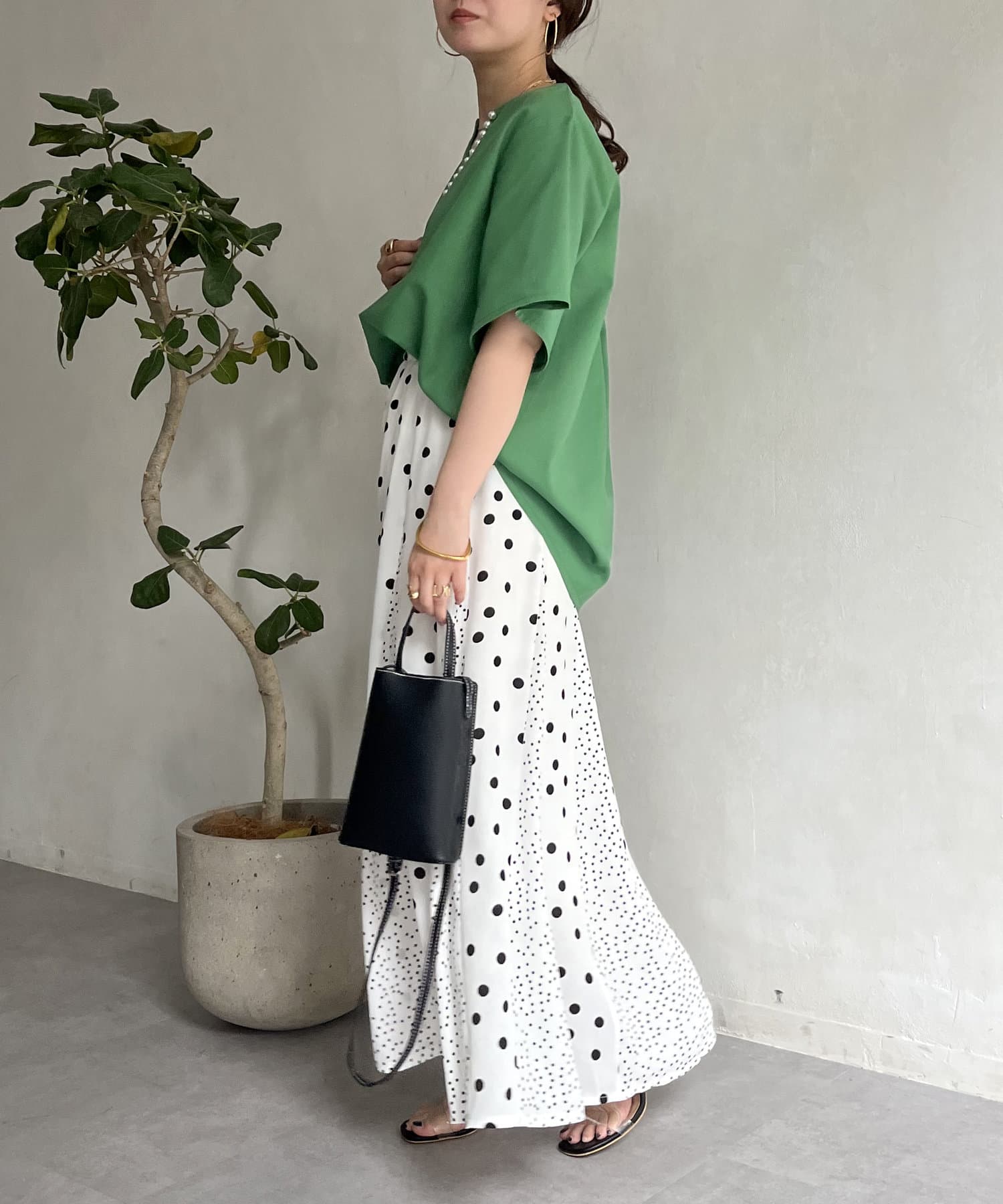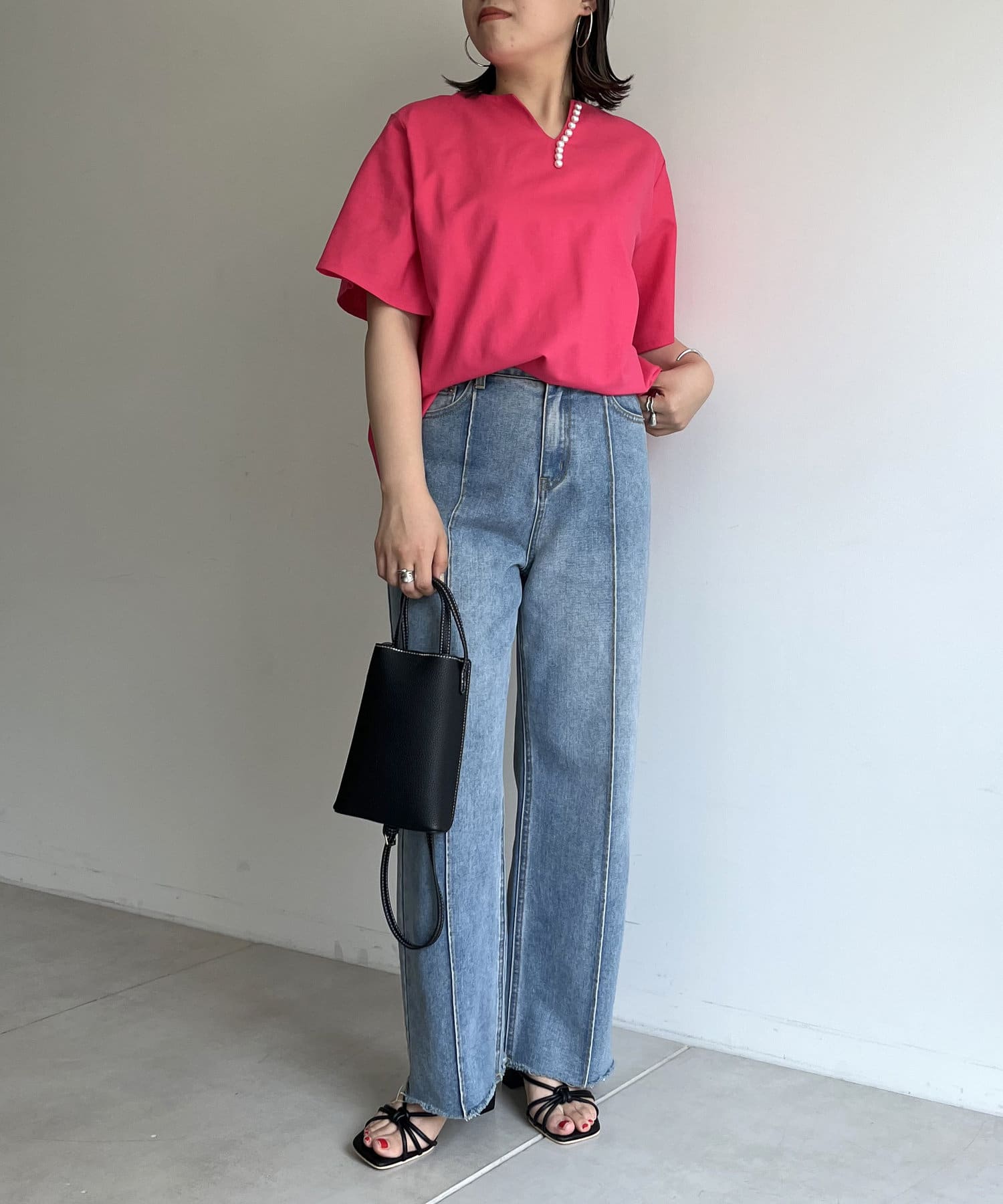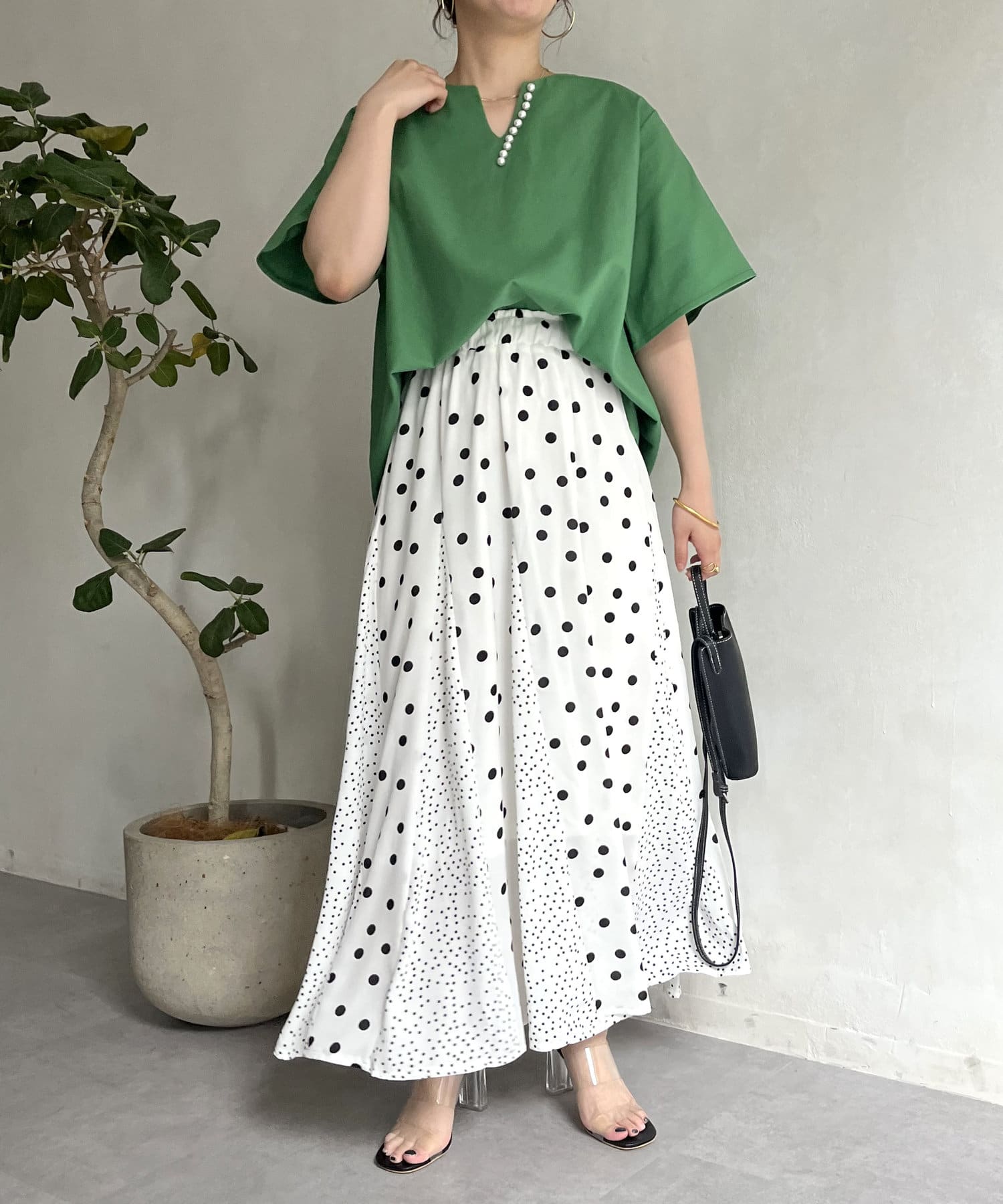 ●チラッと開いたキーネックが首元にほど良い抜け感を与えます