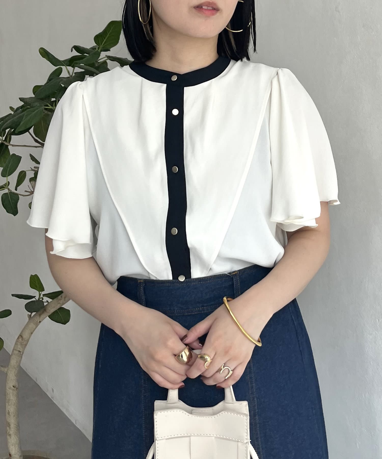 ●金釦がアクセントになり、ネックレスをしなくても華やかな印象に