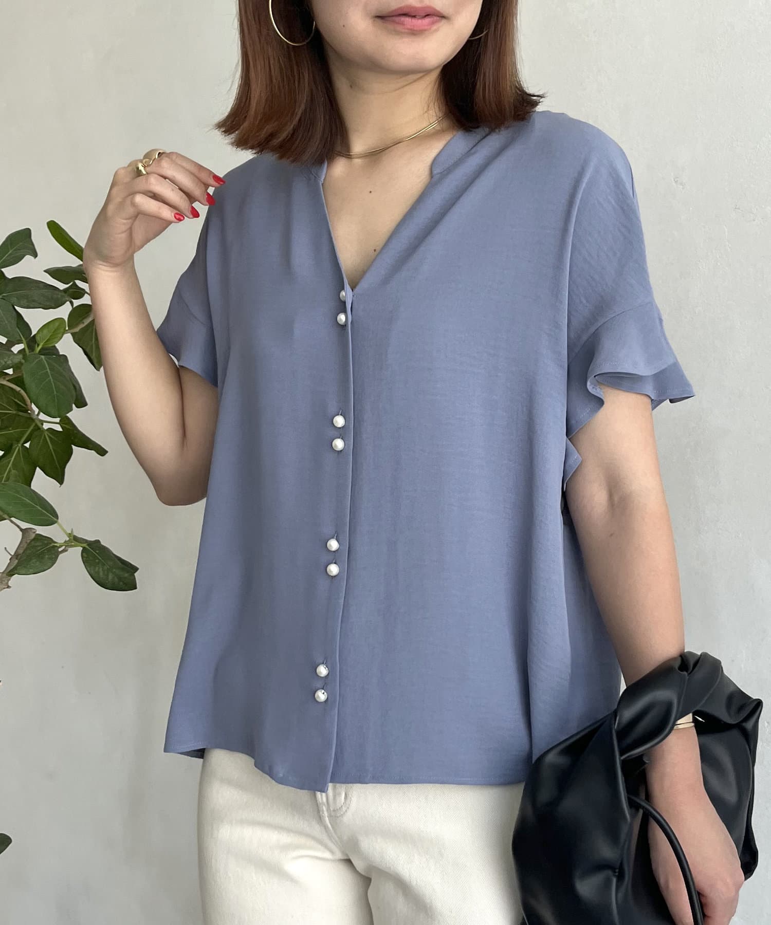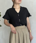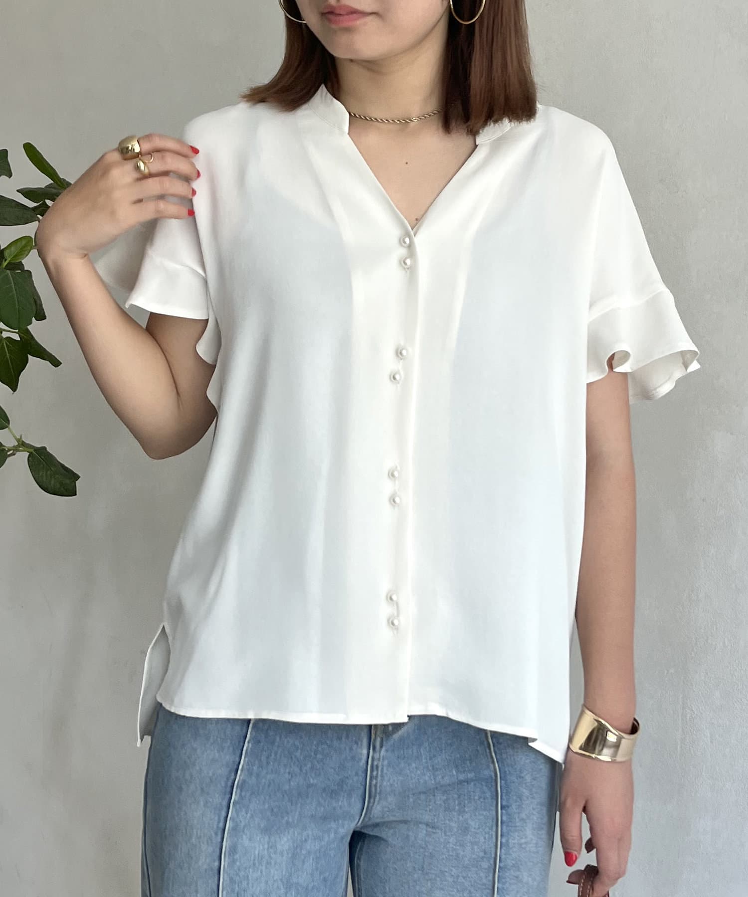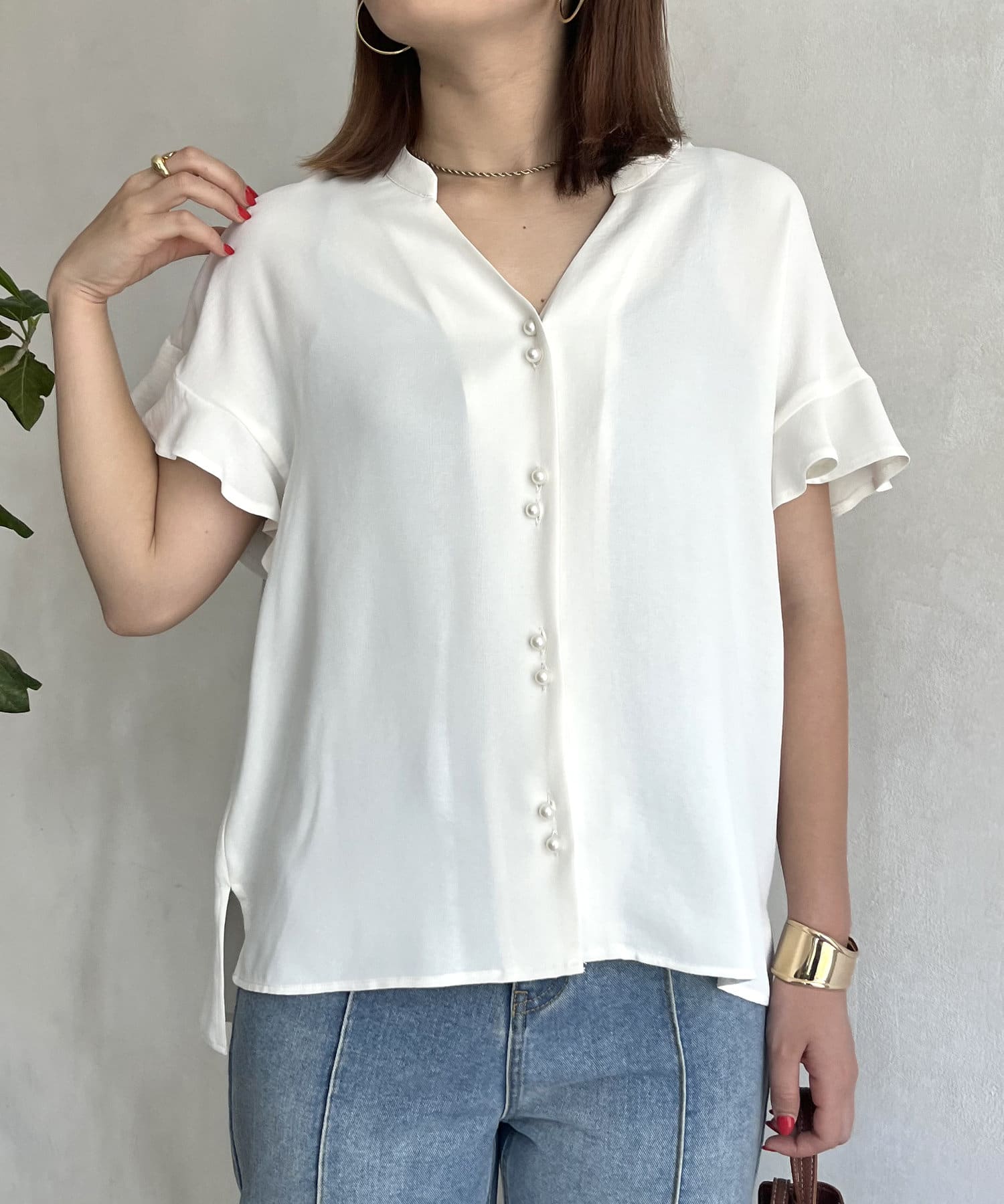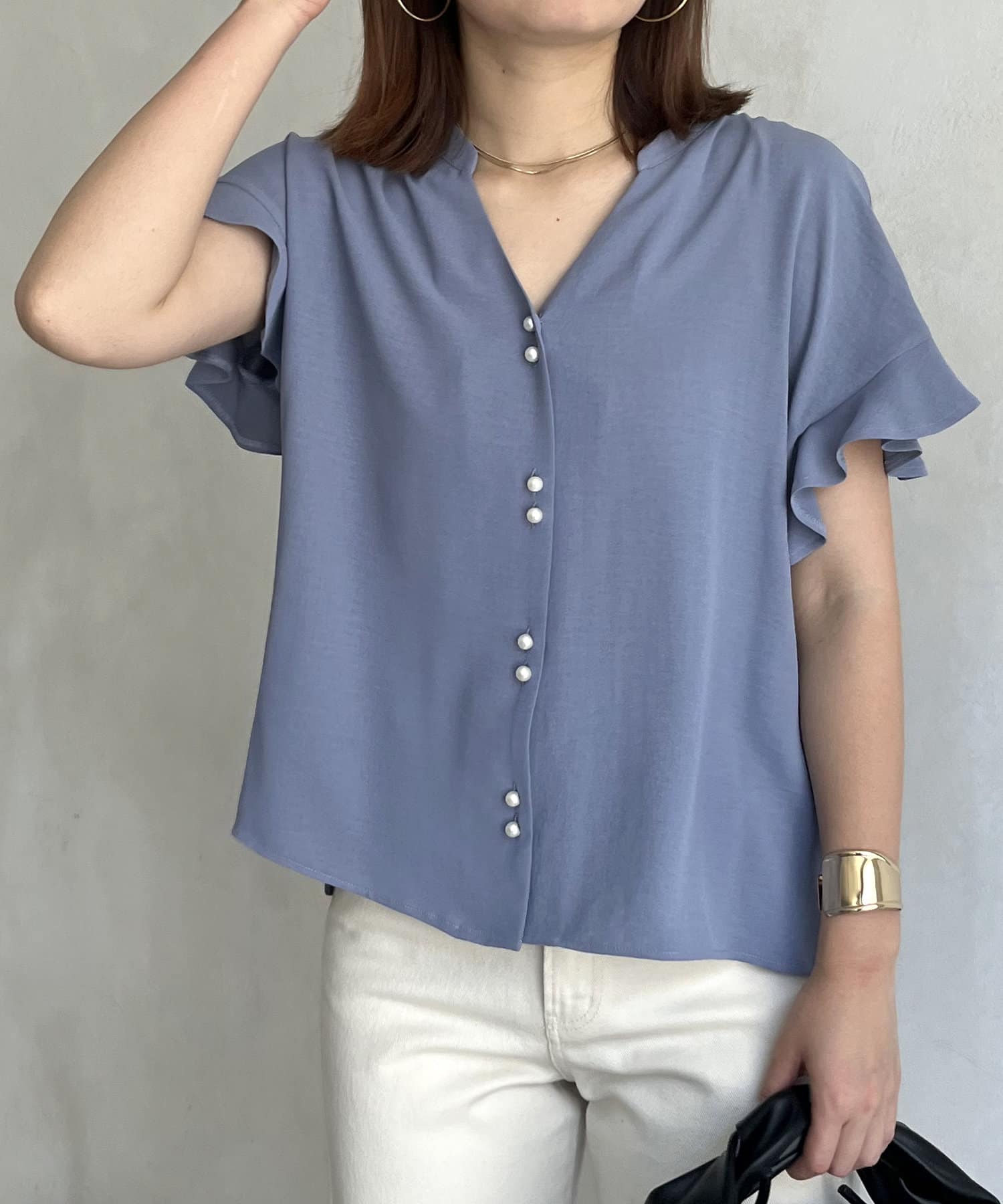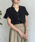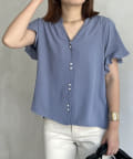 袖フリルパールボタンブラウス