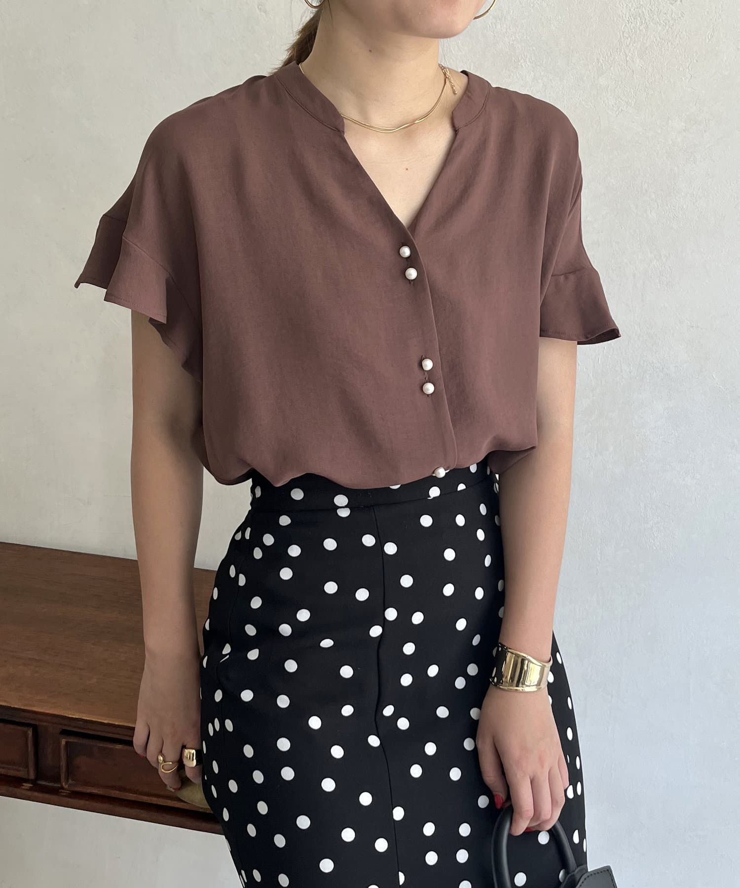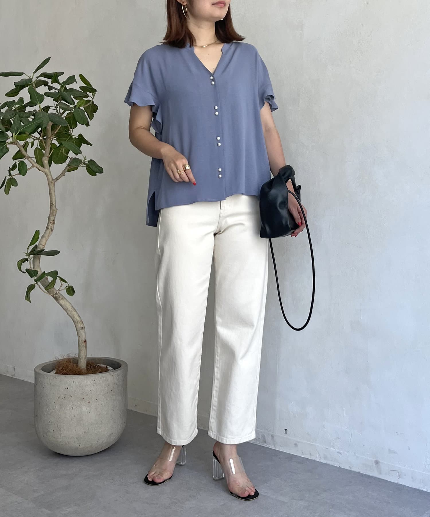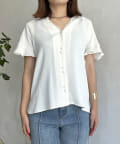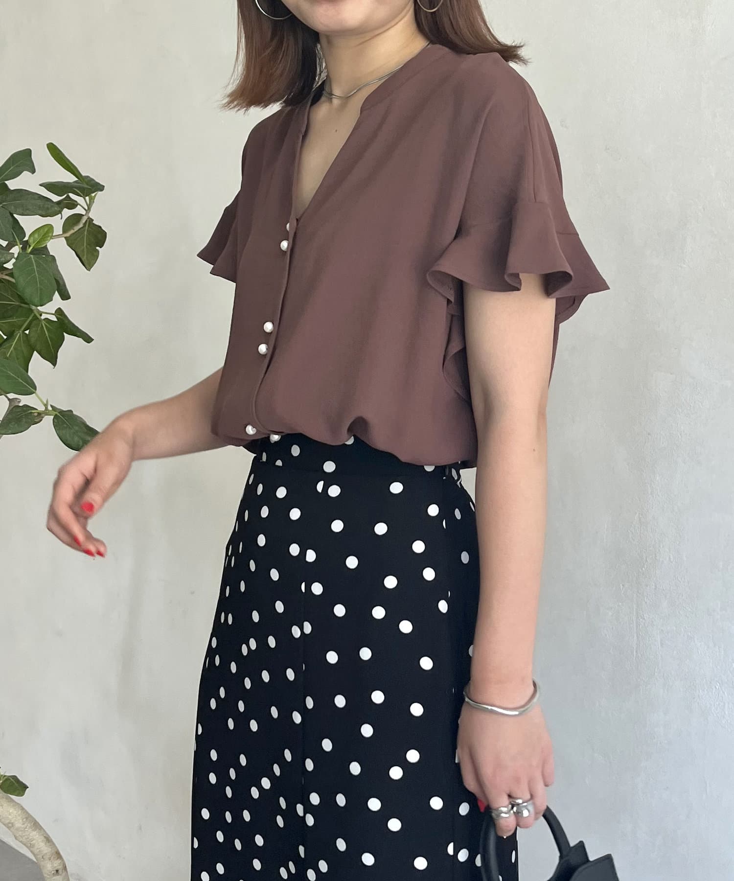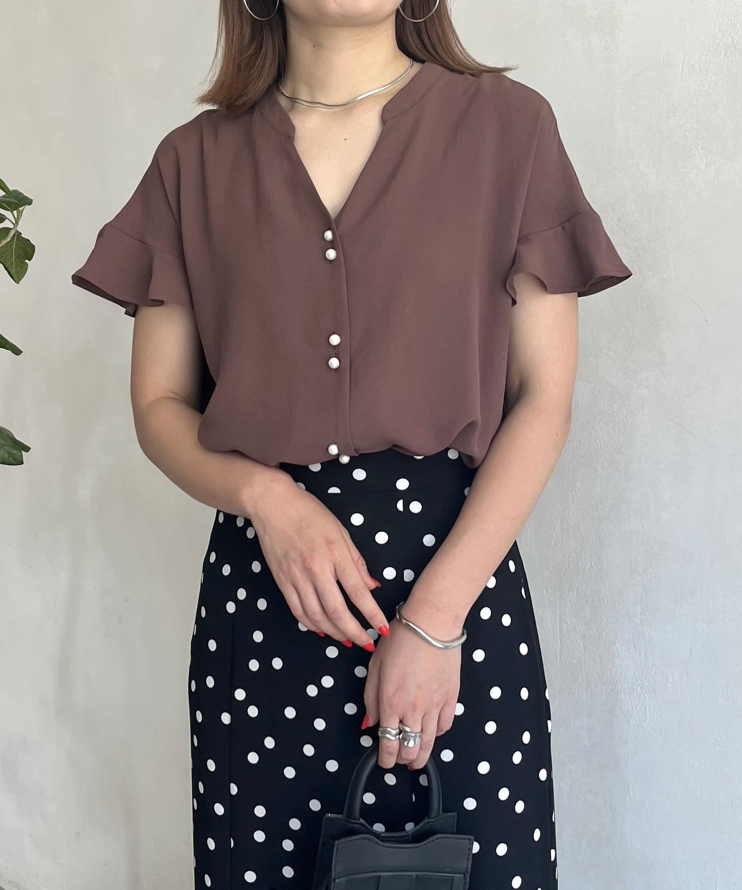 袖フリルパールボタンブラウス
