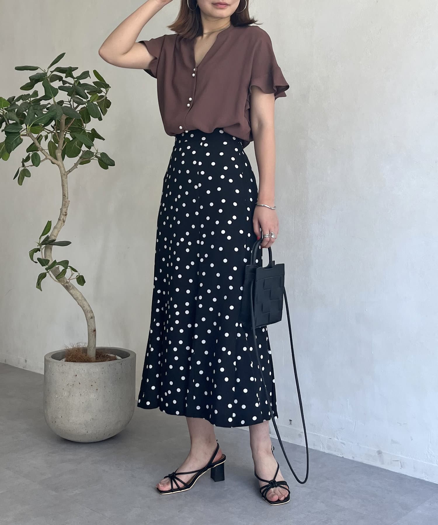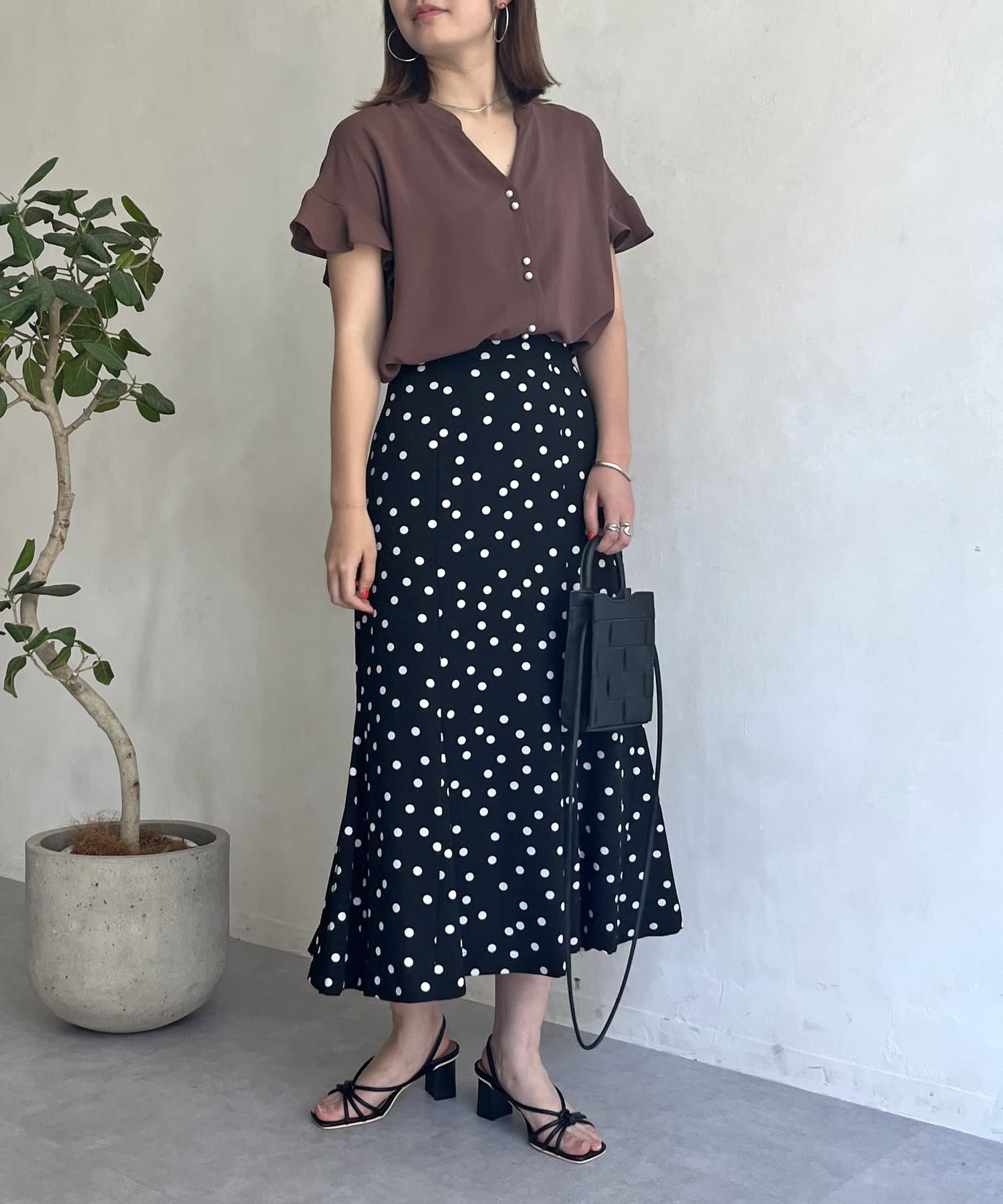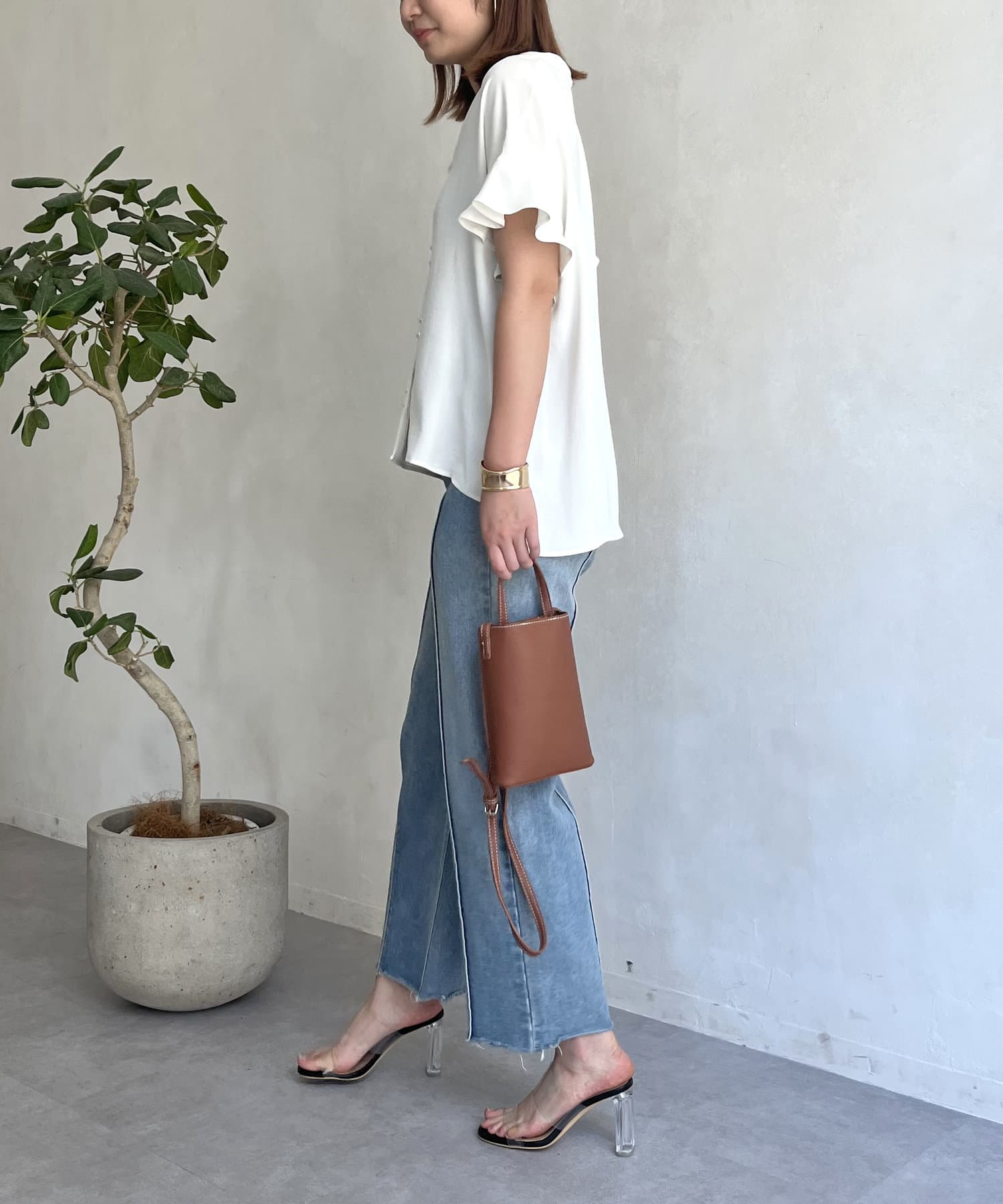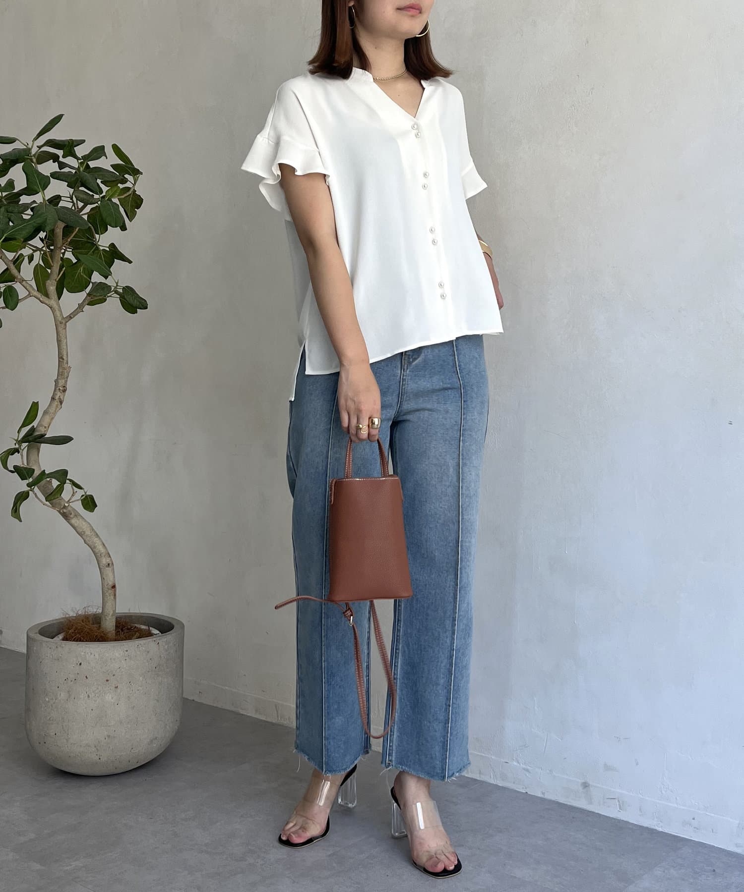 袖フリルパールボタンブラウス