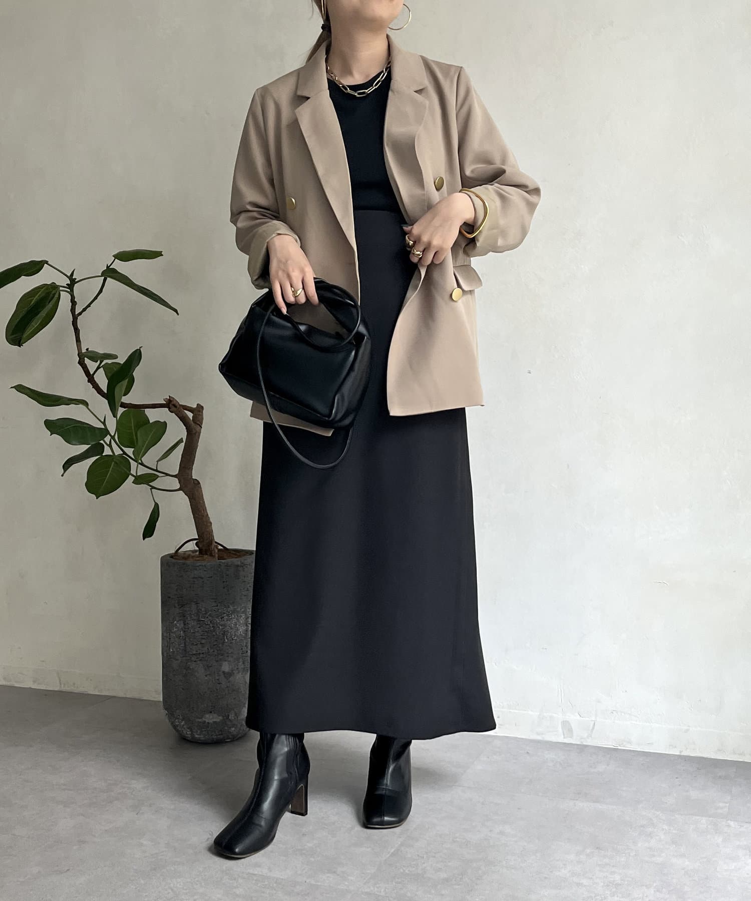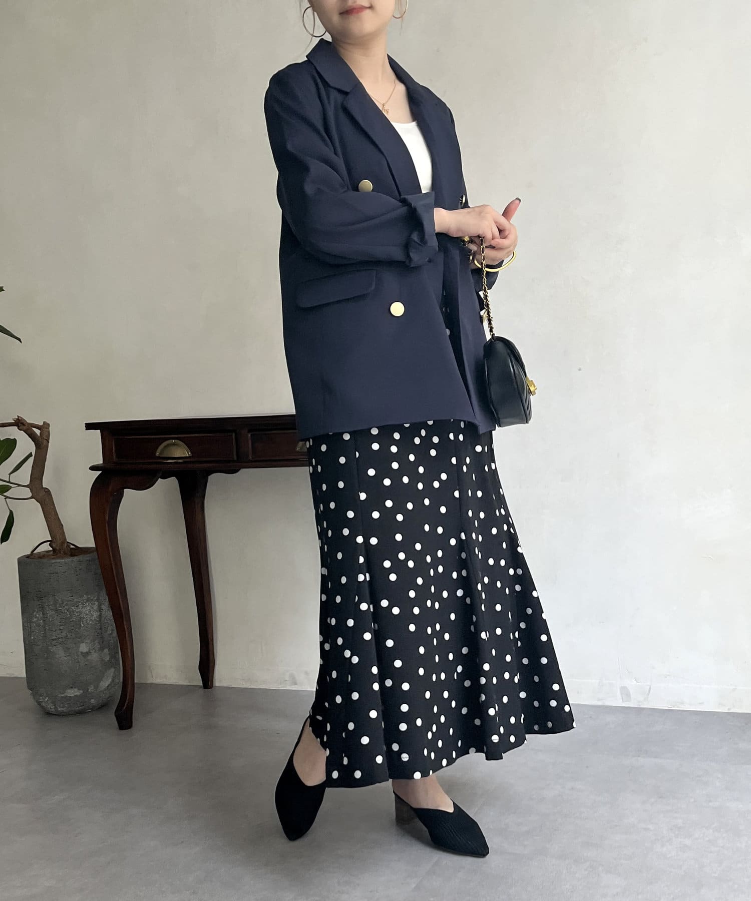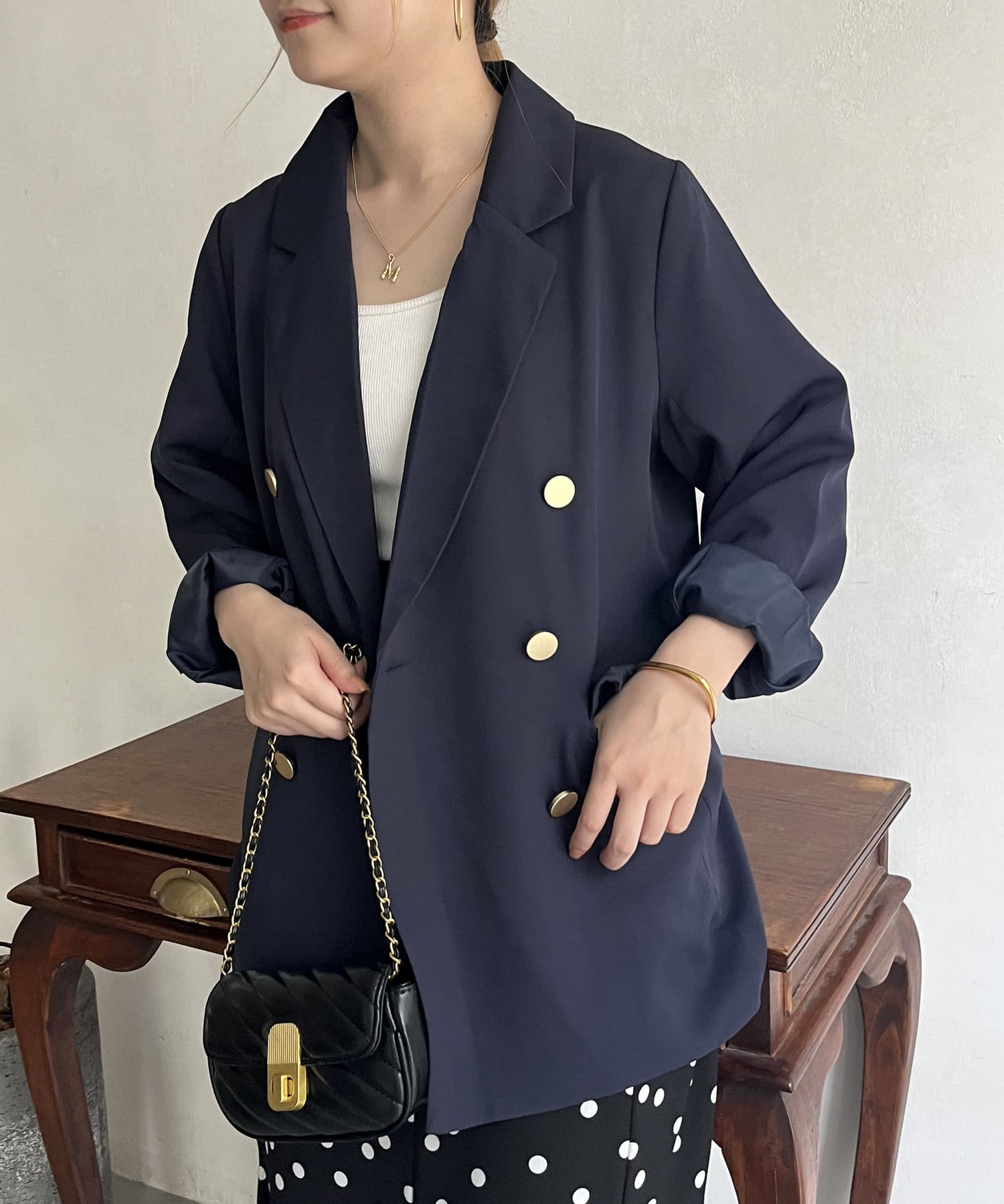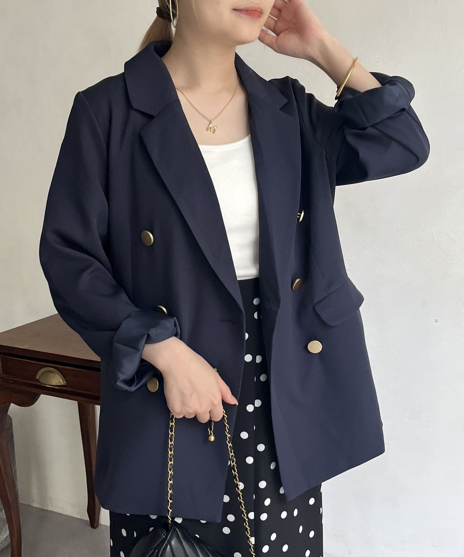 ゴールドのWボタンが上品見えするジャケット