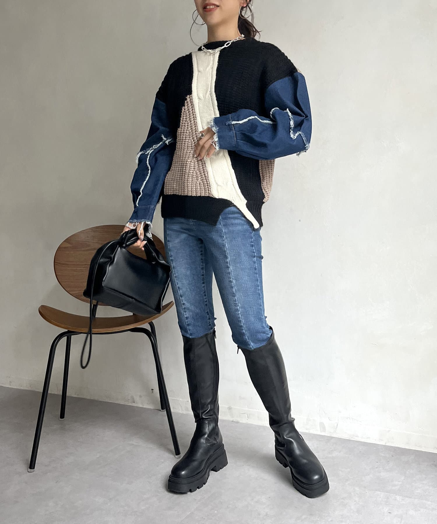 ニット/デニム/切り替え/配色/大人カジュアル/こなれ感/