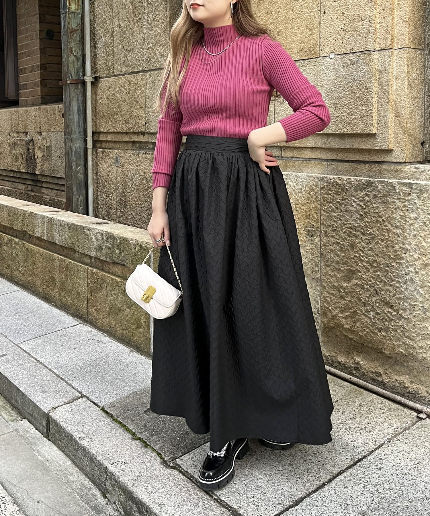 ジャガード柄がこなれた印象に見せてくれるフレアスカート