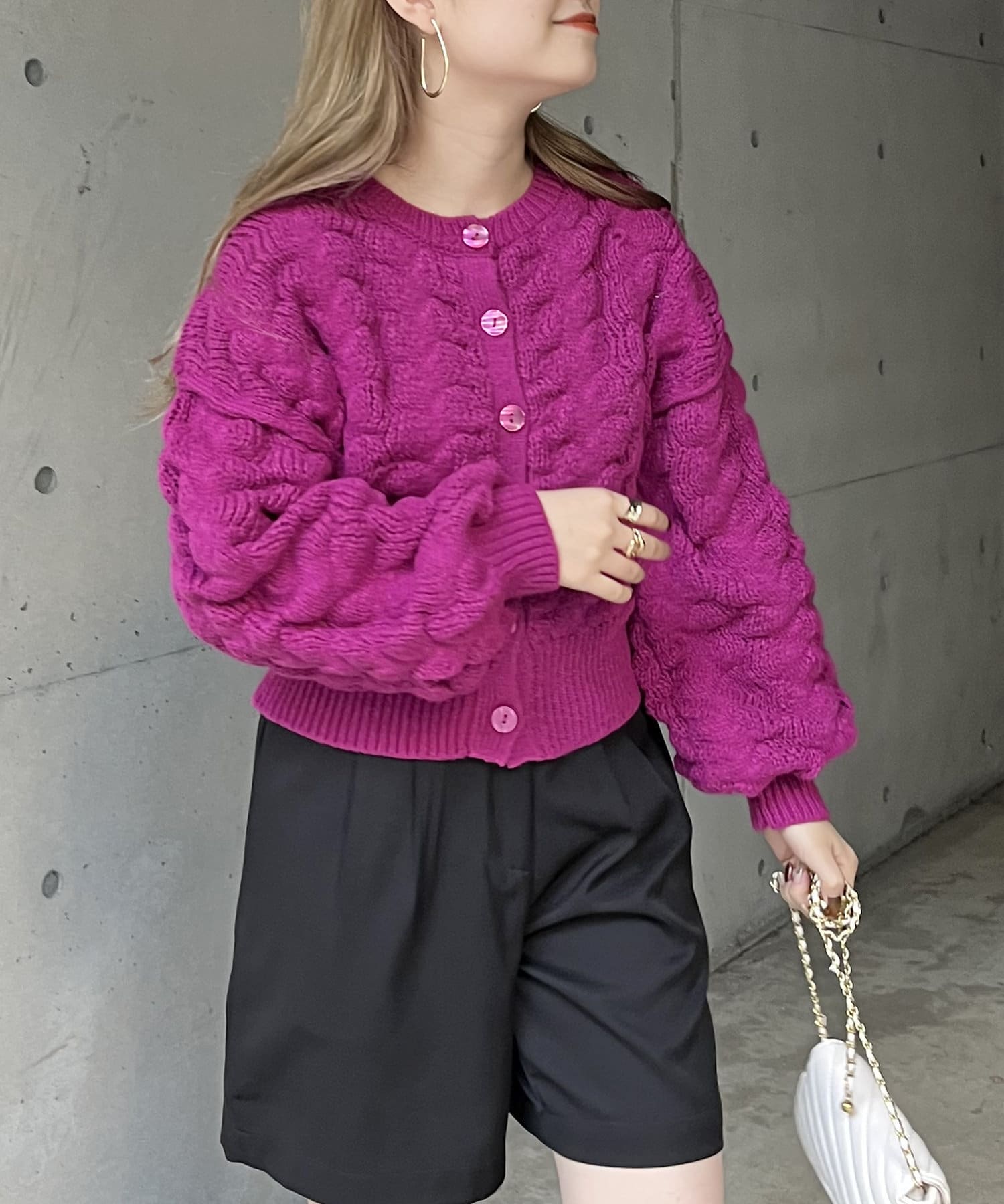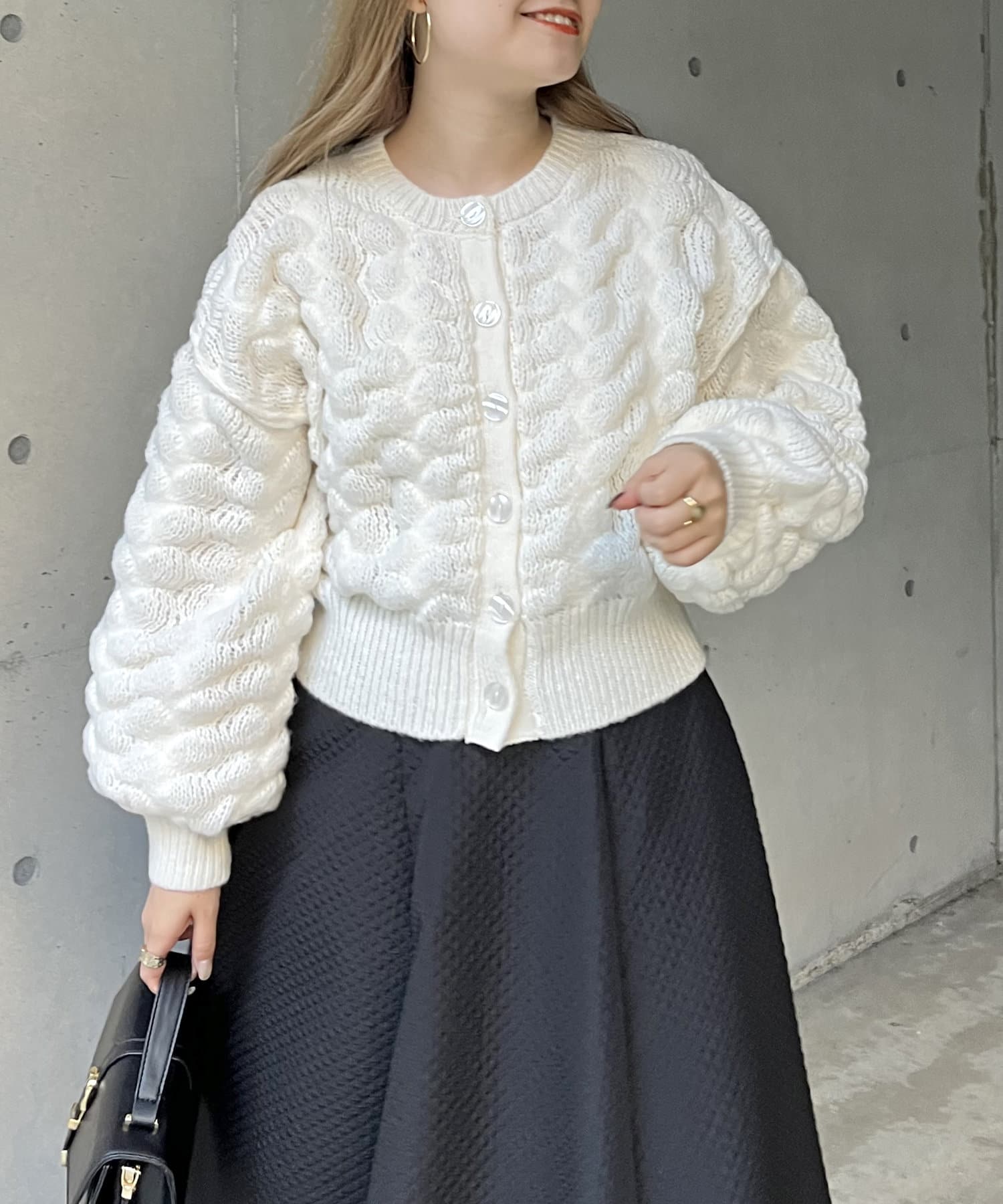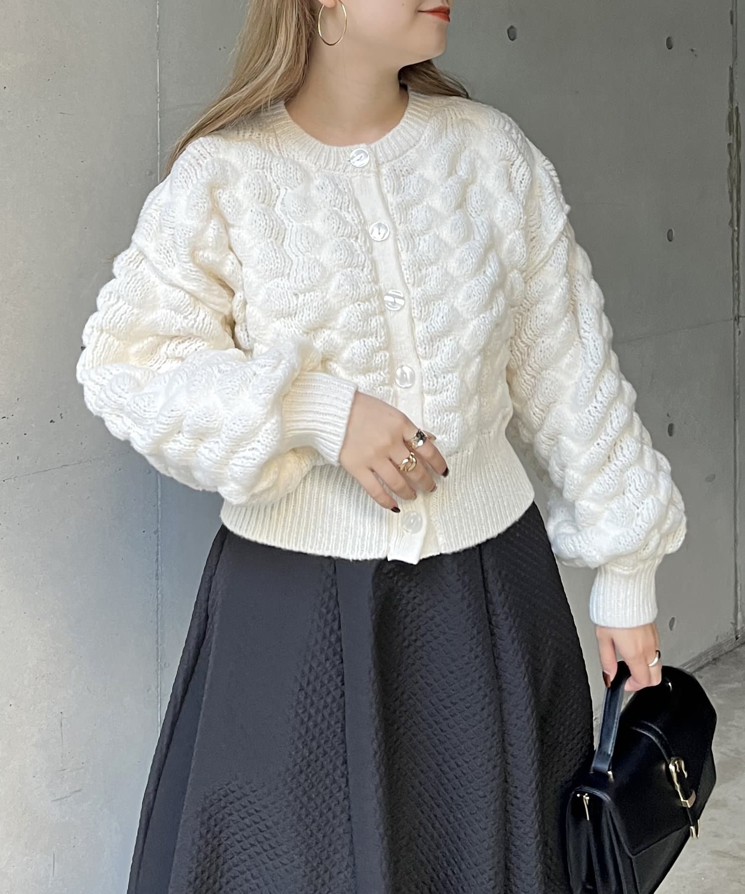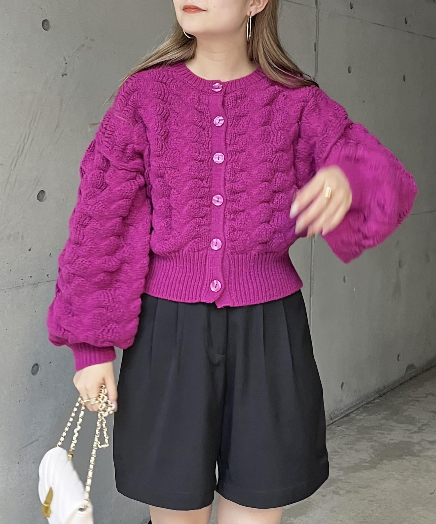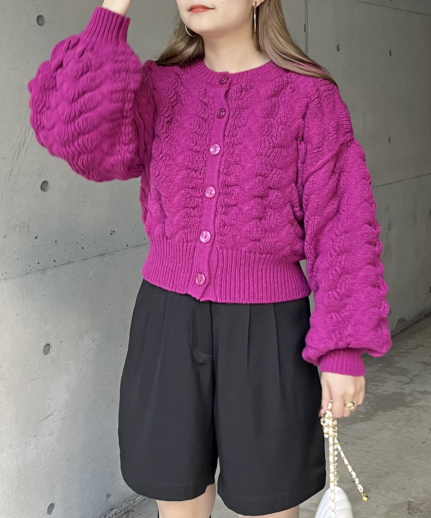 ぽこぽこが女性らしさを演出してくれるショートカーデ