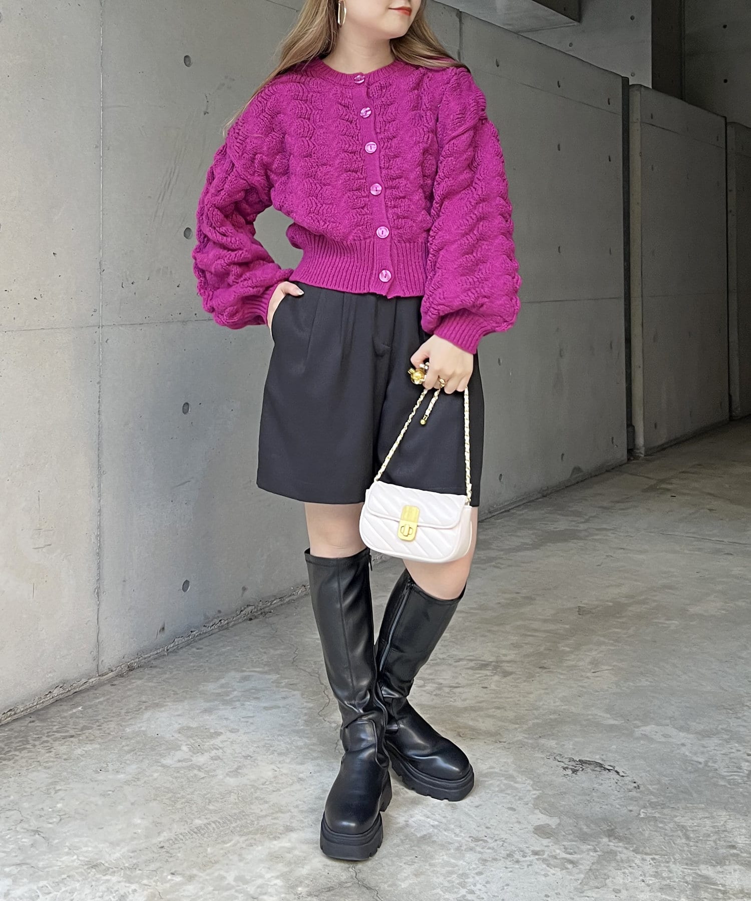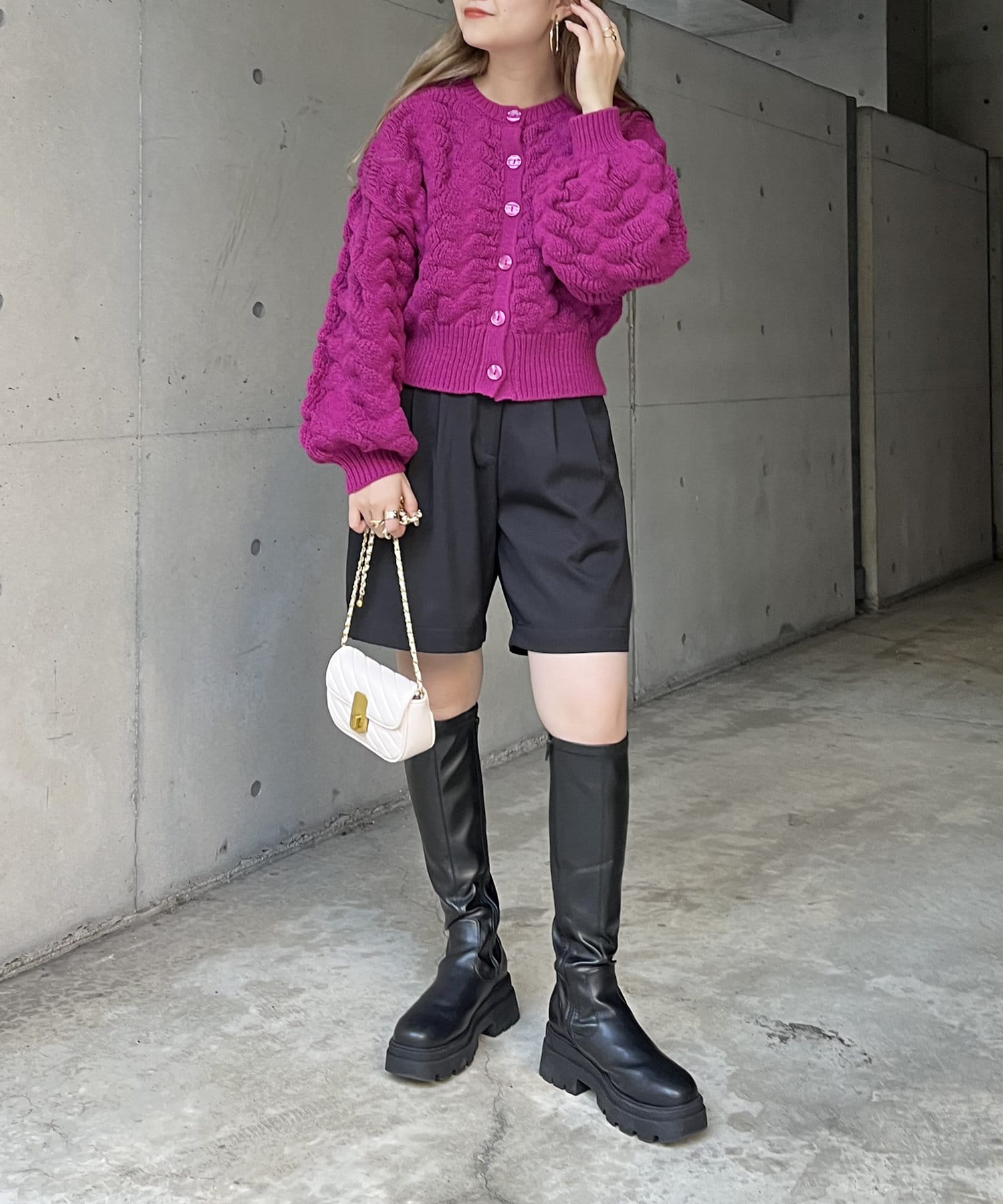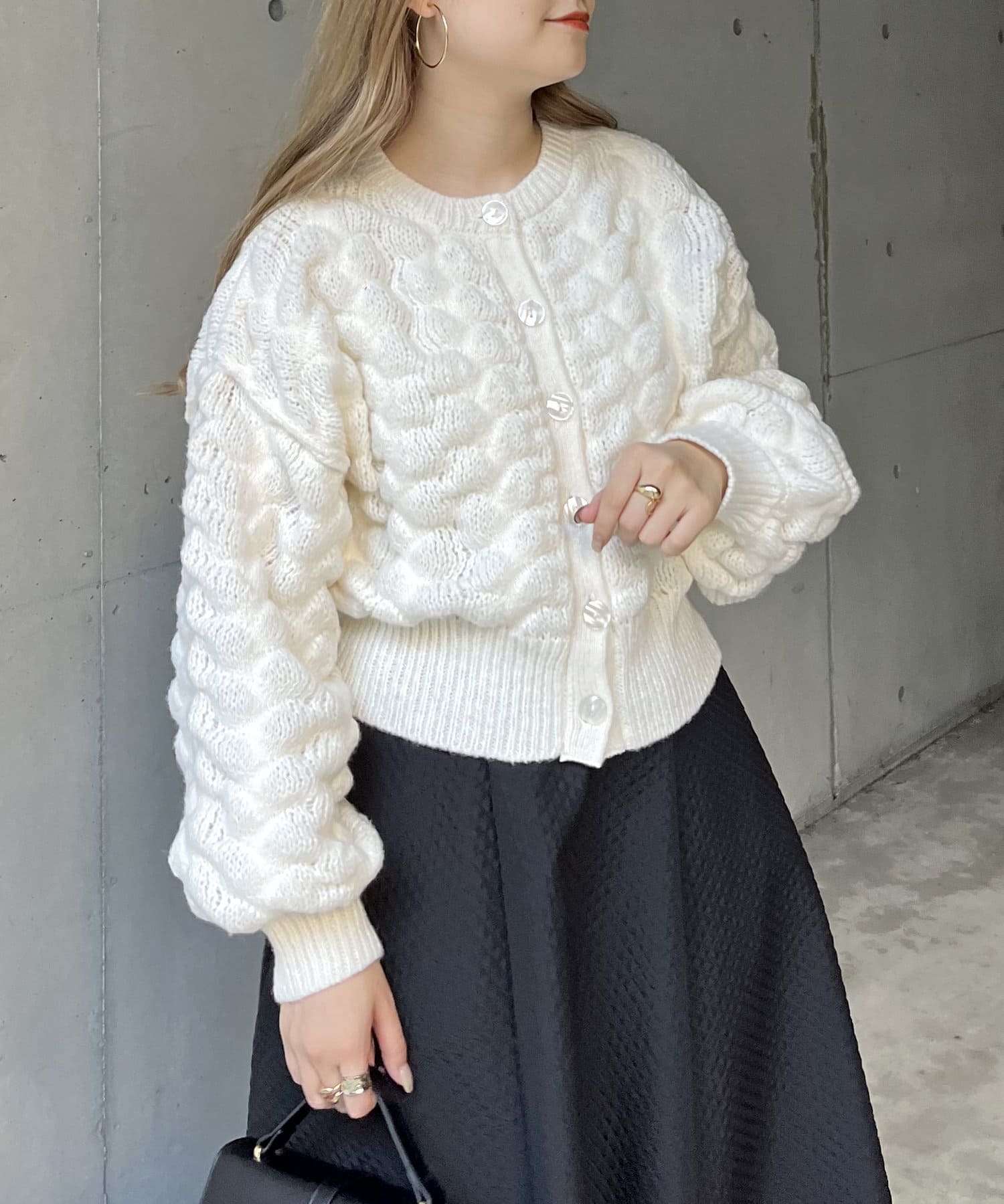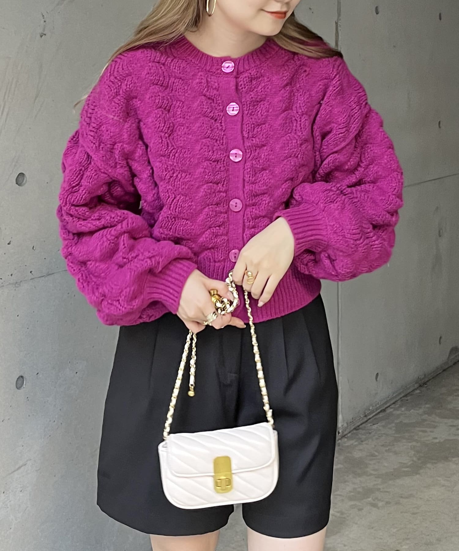 ぽこぽこが女性らしさを演出してくれるショートカーデ