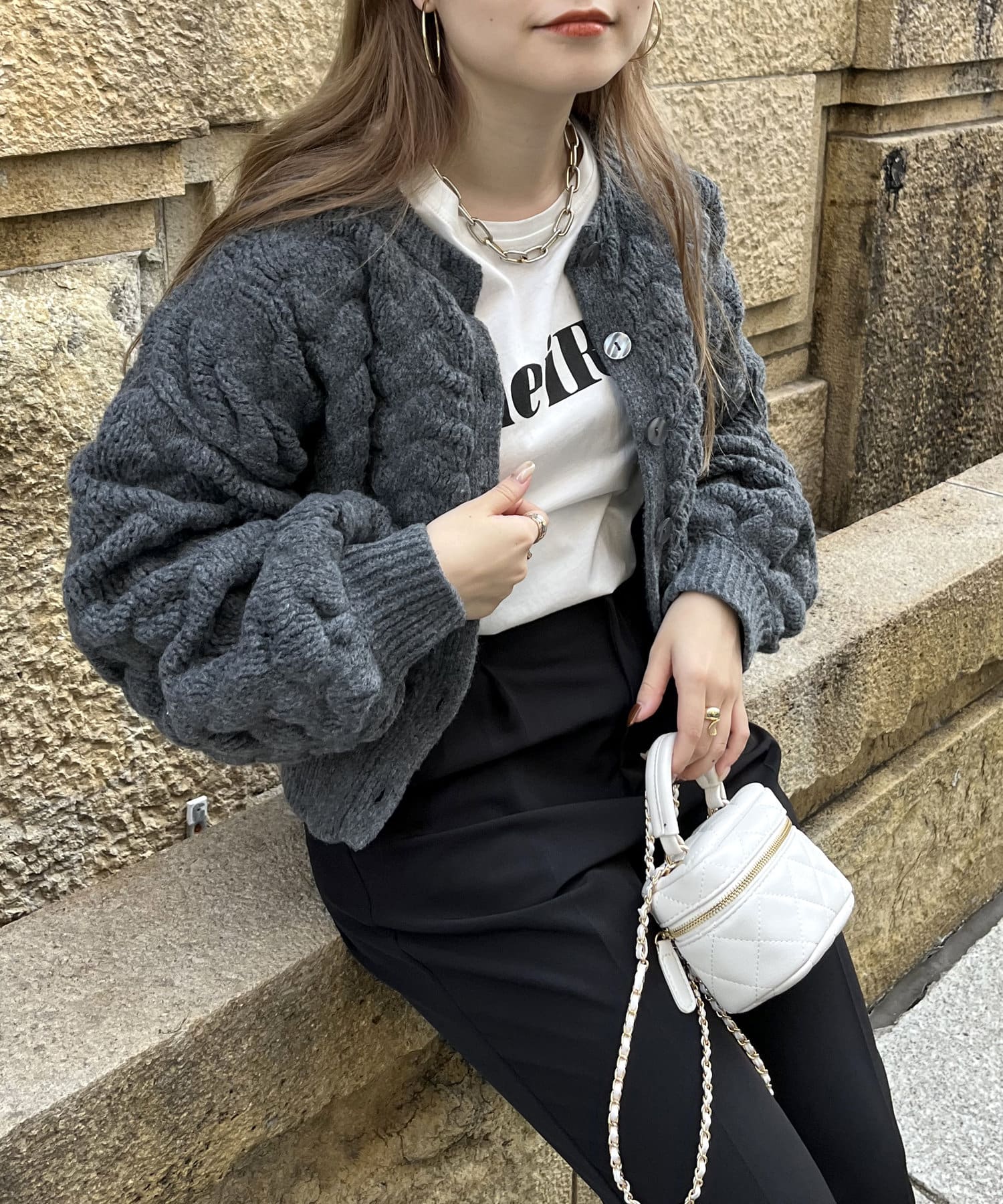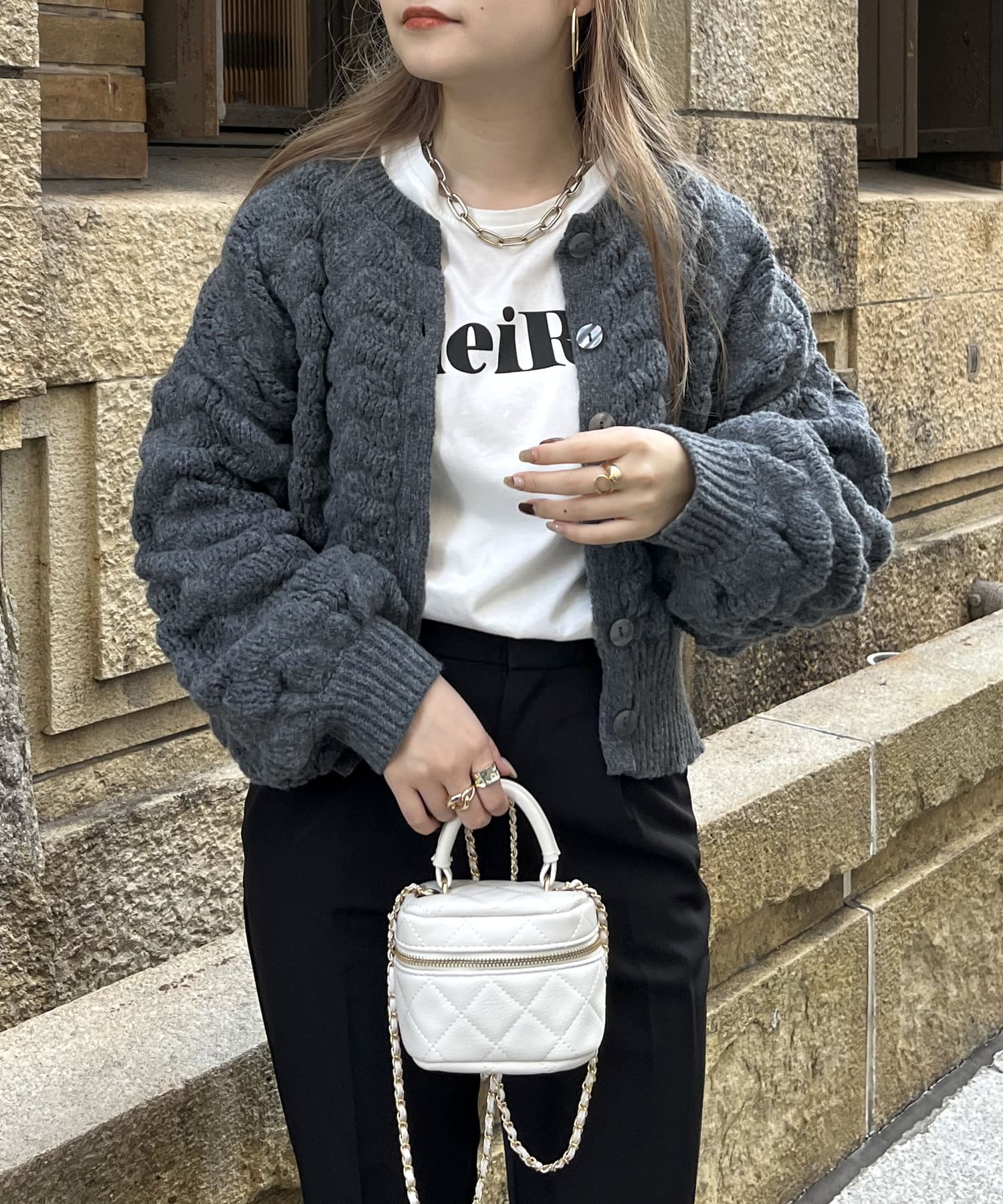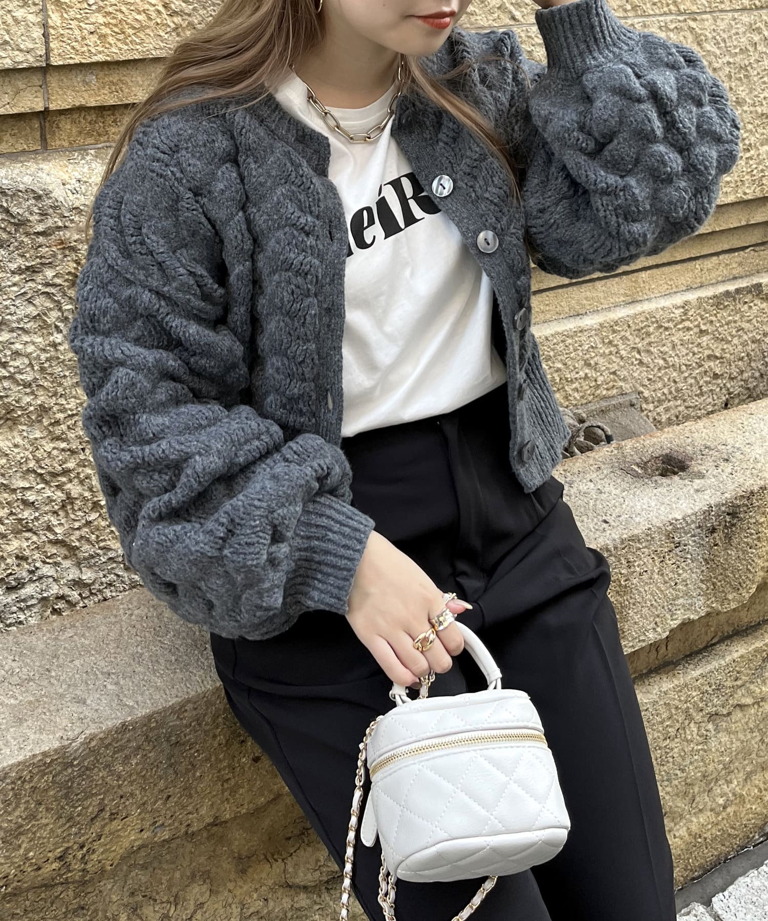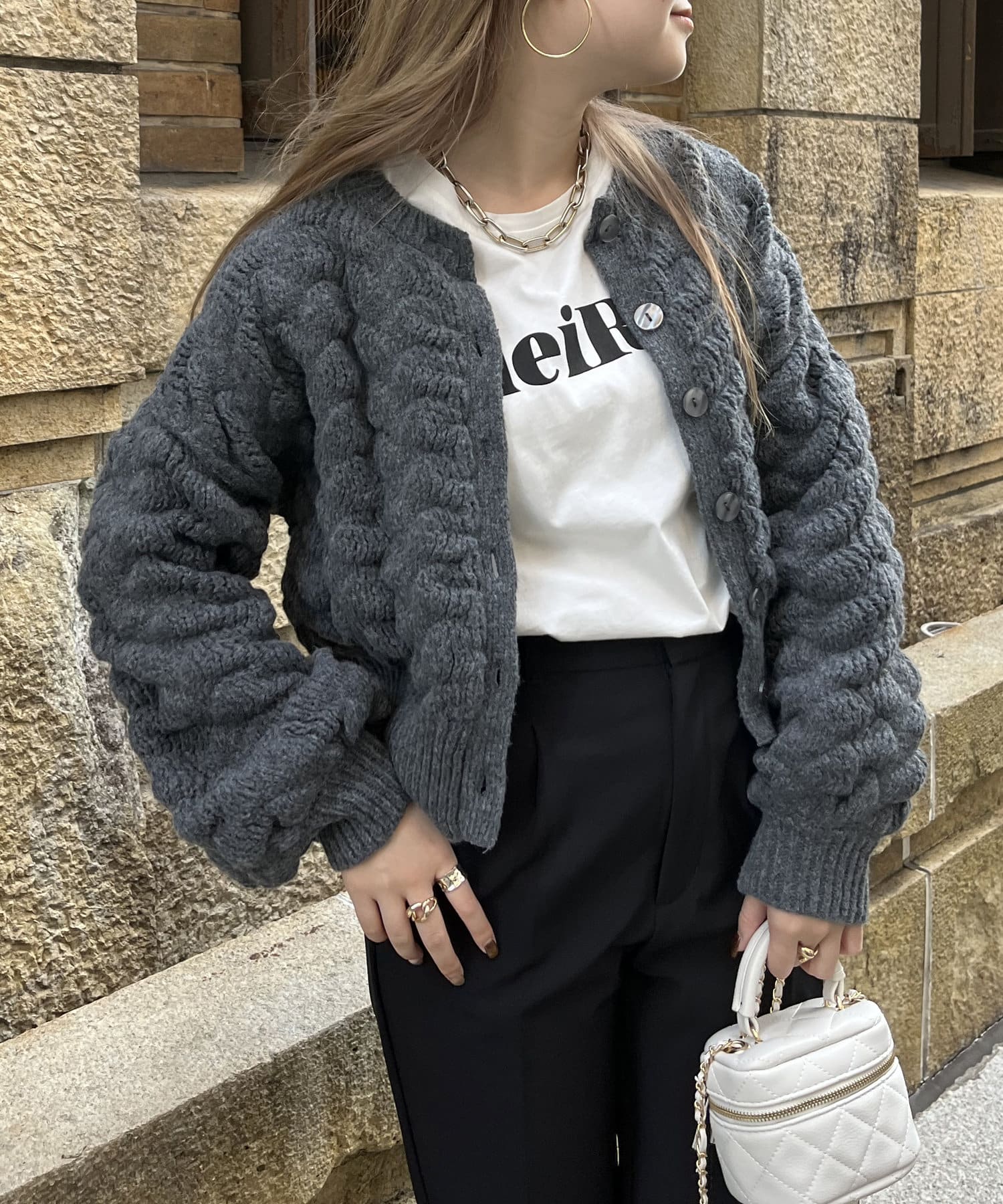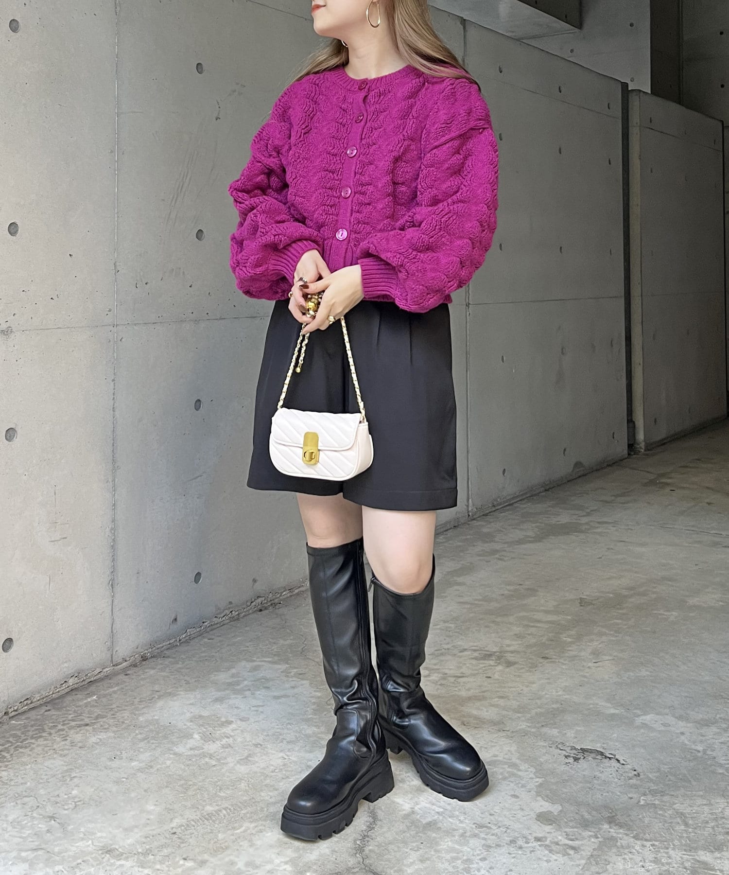ぽこぽこが女性らしさを演出してくれるショートカーデ
